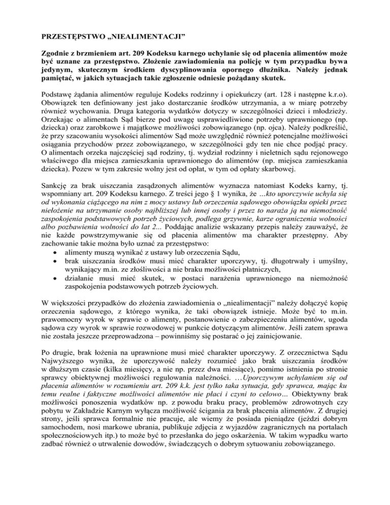 PRZESTĘPSTWO „NIEALIMENTACJI” Zgodnie z brzmieniem art. 209 Kodeksu karnego uchylanie się od płacenia alimentów może być uznane za przestępstwo. Złożenie zawiadomienia na policję w tym przypadku bywa jedynym, skutecznym środkiem dyscyplinowania opornego dłużnika. Należy jednak pamiętać, w jakich sytuacjach takie zgłoszenie odniesie pożądany skutek. Podstawę żądania alimentów reguluje Kodeks rodzinny i opiekuńczy (art. 128 i następne k.r.o). Obowiązek ten definiowany jest jako dostarczanie środków utrzymania, a w miarę potrzeby również wychowania. Druga kategoria wydatków dotyczy w szczególności dzieci i młodzieży. Orzekając o alimentach Sąd bierze pod uwagę usprawiedliwione potrzeby uprawnionego (np. dziecka) oraz zarobkowe i majątkowe możliwości zobowiązanego (np. ojca). Należy podkreślić, że przy szacowaniu wysokości alimentów Sąd może uwzględnić również potencjalne możliwości osiągania przychodów przez zobowiązanego, w szczególności gdy ten nie chce podjąć pracy. O alimentach orzeka najczęściej sąd rodziny, tj. wydział rodzinny i nieletnich sądu rejonowego właściwego dla miejsca zamieszkania uprawnionego do alimentów (np. miejsca zamieszkania dziecka). Pozew w tym zakresie wolny jest od opłat, w tym od opłaty skarbowej. Sankcję za brak uiszczania zasądzonych alimentów wyznacza natomiast Kodeks karny, tj. wspomniany art. 209 Kodeksu karnego. Z treści jego § 1 wynika, że …kto uporczywie uchyla się od wykonania ciążącego na nim z mocy ustawy lub orzeczenia sądowego obowiązku opieki przez niełożenie na utrzymanie osoby najbliższej lub innej osoby i przez to naraża ją na niemożność zaspokojenia podstawowych potrzeb życiowych, podlega grzywnie, karze ograniczenia wolności albo pozbawienia wolności do lat 2... Poddając analizie wskazany przepis należy zauważyć, że nie każde powstrzymywanie się od płacenia alimentów ma charakter przestępny. Aby zachowanie takie można było uznać za przestępstwo: alimenty muszą wynikać z ustawy lub orzeczenia Sądu, brak uiszczania środków musi mieć charakter uporczywy, tj. długotrwały i umyślny, wynikający m.in. ze złośliwości a nie braku możliwości płatniczych, działanie musi mieć skutek, w postaci narażenia uprawnionego na niemożność zaspokojenia podstawowych potrzeb życiowych. W większości przypadków do złożenia zawiadomienia o „niealimentacji” należy dołączyć kopię orzeczenia sądowego, z którego wynika, że taki obowiązek istnieje. Może być to m.in. prawomocny wyrok w sprawie o alimenty, postanowienie o zabezpieczeniu alimentów, ugoda sądowa czy wyrok w sprawie rozwodowej w punkcie dotyczącym alimentów. Jeśli zatem sprawa nie została jeszcze przeprowadzona – powinniśmy się postarać o jej zainicjowanie. Po drugie, brak łożenia na uprawnione musi mieć charakter uporczywy. Z orzecznictwa Sądu Najwyższego wynika, że uporczywość należy rozumieć jako brak uiszczania środków w dłuższym czasie (kilka miesięcy, a nie np. przez dwa miesiące), pomimo istnienia po stronie sprawcy obiektywnej możliwości regulowania należności. …Uporczywym uchylaniem się od płacenia alimentów w rozumieniu art. 209 k.k. jest tylko taka sytuacja, gdy sprawca, mając ku temu realne i faktyczne możliwości alimentów nie płaci i czyni to celowo… Obiektywny brak możliwości ponoszenia wydatków np. z powodu braku pracy, problemów zdrowotnych czy pobytu w Zakładzie Karnym wyłącza możliwość ścigania za brak płacenia alimentów. Z drugiej strony, jeśli sprawca formalnie nie pracuje, ale wiemy że posiada pieniądze (jeździ dobrym samochodem, nosi markowe ubrania, publikuje zdjęcia z wyjazdów zagranicznych na portalach społecznościowych itp.) to może być to przesłanka do jego oskarżenia. W takim wypadku warto zadbać również o utrwalenie dowodów, świadczących o dobrym sytuowaniu zobowiązanego. Kontrowersyjną przesłanką „niealimentacji” jest powstanie skutku w postaci narażenia np. dziecka na niemożność zaspokojenia podstawowych potrzeb życiowych. Oznaczać mogłoby to, że nawet złośliwe niepłacenie alimentów nie byłoby przestępstwem, jeśli dziecko ma zapewnione godziwe warunki życia, choćby z tego powodu, że całość środków jego utrzymania ponosi matka. Takie rozumienie przepisu może być krzywdzące na rodziny. Dlatego też w ramach zawiadomienia o przestępstwie z art. 209 k.k. należy wykazać, jakie negatywne skutki dla dziecka niesie brak uiszczania alimentów. Może to być niemożność korzystania z zajęć dodatkowych, konieczność zakupu tanich rzeczy czy zaciąganie kolejnych długów, aby móc ponieść wydatki na dziecko. Innymi słowy należy wykazać, że w wyniku niealimentacji dziecko nie ma zaspokajanych wszystkich, podstawowych potrzeb życiowych. Dość jednak zauważyć, że potrzeby życiowe dziecka mogą być rozumiane dość szeroko i obejmować m.in. wydatki na naukę, zajęcia dodatkowe, hobby i zabawę etc. W innym wypadku, tj. braku możliwości zaspokajania potrzeb „wyższych”, nieuiszczanie alimentów rodzi jedynie odpowiedzialność cywilną. Podsumowując, nie każde wstrzymywanie się z przekazywaniem środków z tytułu alimentów przez dłużnika musi być poczytywane jako przestępstwo. Nie wyklucza to oczywiście podejmowania innych działań o charakterze prawnym, na czele z możliwością skierowania wniosku egzekucyjnego do komornika. Z tego powodu należy rozważyć najbardziej optymalne rozwiązanie, skutkujące nade wszystko otrzymaniem zaległych środków utrzymania. Michał Sieruga