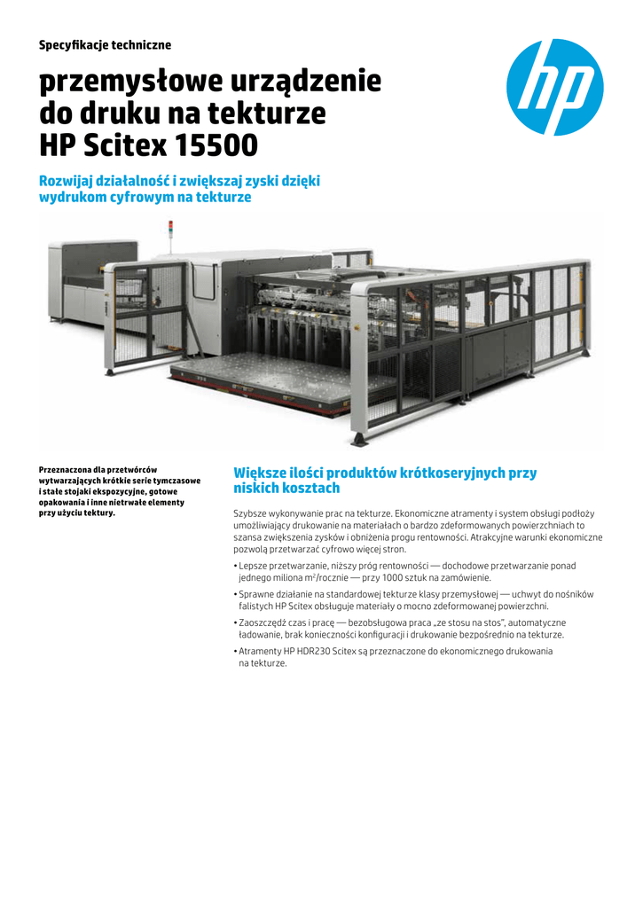 Specyfikacje techniczne przemysłowe urządzenie do druku na tekturze HP Scitex 15500 Rozwijaj działalność i zwiększaj zyski dzięki wydrukom cyfrowym na tekturze Przeznaczona dla przetwórców wytwarzających krótkie serie tymczasowe i stałe stojaki ekspozycyjne, gotowe opakowania i inne nietrwałe elementy przy użyciu tektury. Większe ilości produktów krótkoseryjnych przy niskich kosztach Szybsze wykonywanie prac na tekturze. Ekonomiczne atramenty i system obsługi podłoży umożliwiający drukowanie na materiałach o bardzo zdeformowanych powierzchniach to szansa zwiększenia zysków i obniżenia progu rentowności. Atrakcyjne warunki ekonomiczne pozwolą przetwarzać cyfrowo więcej stron. •Lepsze przetwarzanie, niższy próg rentowności — dochodowe przetwarzanie ponad jednego miliona m2/rocznie — przy 1000 sztuk na zamówienie. •Sprawne działanie na standardowej tekturze klasy przemysłowej — uchwyt do nośników falistych HP Scitex obsługuje materiały o mocno zdeformowanej powierzchni. •Zaoszczędź czas i pracę — bezobsługowa praca „ze stosu na stos”, automatyczne ładowanie, brak konieczności konfiguracji i drukowanie bezpośrednio na tekturze. •Atramenty HP HDR230 Scitex są przeznaczone do ekonomicznego drukowania na tekturze. Karta charakterystyki | Przemysłowe urządzenie do druku na tekturze HP Scitex 15500 Rozwijaj działalność i zwiększaj zyski dzięki wydrukom cyfrowym na tekturze. Rozwijaj działalność dzięki produktom wytwarzanym z zastosowaniem tektury Rozszerz ofertę i zaproponuj klientom więcej rozwiązań. Urządzenie HP Scitex umożliwia drukowanie grafik wysokiej jakości na różnorodnych tekturach. Wykorzystaj możliwość rozwoju firmy dzięki dodatkowym funkcjom. •Realizuj potrzeby klientów. Wytwarzaj opakowania graficzne i stojaki najwyższej jakości. •Dzięki uchwytowi do tektury HP Scitex możesz drukować na wielu podłożach, w tym na standardowej tekturze klasy przemysłowej. •Atramenty HP HDR230 Scitex pozwalają uzyskiwać wysokiej jakości, bezzapachowe1 wydruki na tekturze przeznaczone do zastosowań we wnętrzach, na przykład stojaki ekspozycyjne na ladę lub samodzielne. •Korzyści zapewniane przez technologię HDR: jakość w przypadku automatycznego zastosowania małych kropli atramentu oraz duża prędkość druku w przypadku zastosowania dużych kropli atramentu — wszystko w ramach tego samego wydruku. Rozwijaj firmę dzięki inwestycjom w technologię cyfrową Przejście na technologię cyfrową nigdy nie było łatwiejsze. Firma HP oferuje kompleksowe rozwiązania obejmujące obsługę wydruków próbnych i przepływu prac, bogaty pakiet usług i narzędzia do zarządzania pozwalające zoptymalizować wydajność. Możliwość dostosowywania urządzenia do zmieniających się z czasem potrzeb chroni Twoją inwestycję. •Dzięki możliwościom pełnej modernizacji urządzenia możesz mieć pewność, że Twoje inwestycje w rozwiązania cyfrowe są bezpieczne. •Pracuj w ekosystemie rozwiązań firmy HP i partnerów — od wydruków próbnych po prace wykończeniowe, zarządzanie oprogramowaniem i usługi. •Korzystaj z szerokiej oferty firmy HP obejmującej usługi w zakresie szkolenia, wsparcia i produktywności. •Zoptymalizuj wydajność urządzenia za pomocą narzędzi HP Scitex Print Care i HP SmartStream Production Analyzer. Skład atramentów HP HDR230 Scitex jest dobierany pod kątem uzyskania wydruków o słabym zapachu testowanych zgodnie z dotyczącą zapachów normą DIN EN 1230-1 odnoszącą się do papieru i tektury wchodzących w kontakt z żywnością. Zapach wydruku jest oceniany w skali od 0 (brak wyczuwalnego zapachu) do 4 (mocny zapach). Zapach wydruków uzyskanych przy użyciu atramentów HP HDR230 Scitex w produkcji POP jest oceniony na 1–2 w przypadku wydruków matowych. Testy zapachu potwierdzone za pomocą wewnętrznych badań firmy HP. 1 2 Większa gotowość do pracy i większa wydajność dzięki usługom HP Usługi HP oferują szerokie portfolio sprawdzonych programów wsparcia technicznego, dzięki czemu Twoja firma będzie działać produktywnie. Nasze certyfikowane zespoły serwisowe są zobowiązane do spełniania Twoich potrzeb, poprawy wydajności Twojej firmy i jej zrównoważonego rozwoju w celu zwiększenia zyskowności. Dowiedz się więcej na stronie hp.com/go/scitexservice Karta charakterystyki | Przemysłowe urządzenie do druku na tekturze HP Scitex 15500 Łożysko kulkowe HP Scitex Ten opcjonalny element umożliwia przesuwanie stosów podłoży na podnośnik do automatycznego podawania oraz łatwą korektę boków stosów. Uchwyt do podłoży HP Scitex Drukuj na standardowej tekturze jakości przemysłowej — i oszczędzaj czas i pieniądze Uchwyt do podłoży HP Scitex radzi sobie z problemami związanymi z drukowaniem na mocno zdeformowanych tekturach. Z łatwością obsługuje tekturę o deformacjach sięgających 40 milimetrów, spłaszczając ją automatycznie i utrzymując w takim położeniu w czasie całego procesu drukowania. Stół do ładowania jest pokryty 128 segmentami maty zasysającej, która skutecznie przytrzymuje na miejscu tekturę o różnych wymiarach. Atramenty HP HDR230 Scitex Nowe podejście do kosztów wysokiej jakości wydruków na tekturze Atramenty HP HDR230 Scitex zaprojektowane w połączeniu z urządzeniem do druku na tekturze HP Scitex 15500 są zoptymalizowane pod kątem ekonomicznego drukowania. Idealne rozwiązanie w przypadku podłoży tekturowych. Te atramenty zapewniają elastyczność, odporność na ścieranie i trwałość powierzchni2, a przy tym pozwalają uzyskać świetne wyniki na wielu elastycznych i sztywnych materiałach. Wydruki o słabym zapachu1 są dostosowane do użytkowania we wnętrzach. Technologia druku HP Scitex High Dynamic Range (HDR) Technologia druku HP Scitex HDR zapewnia precyzyjną kontrolę nad kolorami i przejściami tonalnymi, co pozwala oddać każdy szczegół d