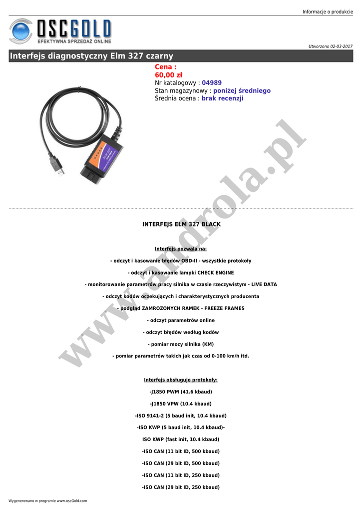 Informacje o produkcie Utworzono 02-03-2017 Interfejs diagnostyczny Elm 327 czarny Cena : 60,00 zł ro la .p l Nr katalogowy : 04989 Stan magazynowy : poniżej średniego Średnia ocena : brak recenzji nd INTERFEJS ELM 327 BLACK Interfejs pozwala na: - odczyt i kasowanie błędów OBD-II - wszystkie protokoły w .a - odczyt i kasowanie lampki CHECK ENGINE - monitorowanie parametrów pracy silnika w czasie rzeczywistym - LIVE DATA - odczyt kodów oczekujących i charakterystycznych producenta - podgląd ZAMROZONYCH RAMEK - FREEZE FRAMES w w - odczyt parametrów online - odczyt błędów według kodów - pomiar mocy silnika (KM) - pomiar parametrów takich jak czas od 0-100 km/h itd. Interfejs obsługuje protokoły: -J1850 PWM (41.6 kbaud) -J1850 VPW (10.4 kbaud) -ISO 9141-2 (5 baud init, 10.4 kbaud) -ISO KWP (5 baud init, 10.4 kbaud)ISO KWP (fast init, 10.4 kbaud) -ISO CAN (11 bit ID, 500 kbaud) -ISO CAN (29 bit ID, 500 kbaud) -ISO CAN (11 bit ID, 250 kbaud) -ISO CAN (29 bit ID, 250 kbaud) Wygenerowano w programie www.oscGold.com Umożliwia diagnozowanie wszystkich systemów w samochodzie: - elektroniki silnika - układu paliwowego - układu dolotu powietrza - automatycznej skrzyni biegów - elektroniki pompy diesla - systemów hamowania - klimatyzacji - deski rozdzielczej - immobilizera - modułu komfortu la - elektrycznych szyb .p l - wspomagania elektrycznego kierownicy - nawigacji satelitarnej ro - elektroniki szyberdachu - i innych zależnie od modelu samochodu i oprogramowania... nd Współpracuje z oprogramowaniem diagnostycznym: - Scantool.net - Engine Check (bardzo dobry do diagnozowania starszych samochodow z niepelnym wsparciem dla OBD-2) w .a -GM Mode 22 Scan Tool by Terry -OBD Gauge for PalmOS and Pocket PC by Dana Peters -OBD Logger by Jonathan Senkerik -OBD-II ScanMaster by Wladimir Gurskij (ScanMaster 3.52 - local copy) w w -obd2crazy.com -OBD2 Scantool by Ivan Andrzejewski -OBDII for ELM322 by David Huffman -pyOBD by Donour Sizemore for MacOSX and Linux -RDDTC by Pete Calinski -Real Scan by Brent Harris -ScanTest for Pocket PC by Ivan Ganev aka a-ser -wOBD by WDT -easy OBD -DigiMoto -PCMSCAN (umożliwia m.in. pomiar mocy i czasow) -i wieloma innymi darmowymi i płatnymi programami również w wersji PL DO INTERFEJSU NIE DOŁĄCZAMY ŻADNEGO PROGRAMOWANIA Wymagania sprzętowe: Informacje o produkcie - Windows 95, 98, 2000, XP, - wolny port USB w komputerze, laptopie, PDA - gniazdo OBD2 w samochodzie Do interfejsu nie dołączamy żadnego oprogramowania. LISTA OBSŁUGIWANYCH SAMOCHODÓW: Europejskie osobowe, terenowe i dostawcze od 1996 roku: - Alfa Romeo:147, 156, 159, 166, GT, GTV, Brera, Crosswagon, Spider, Sportwagon - Audi:A2, A3, S3, A4, S4, A6, S6, A8, S8, allroad, Cabriolet, Coupe, Q7, Quattro, RS2, RS4, RS6, TT, V8 .p l - BMW:seria 1 116, 118, 120, 130, seria 3 316, 318, 320, 323, 325, 328, 330, 335, seria 5 518, 520, 523, 524, 525, 528, 530, 535, 540, 545, 550, seria 6 630, 635, 645, 650, seria 7 725, 728, 730, 732, 735, 740, 745, 750, 760, seria 8 840, 850, MPower M3, M5, M6 ,Z4 M, X-seria X3, X5, Z-seria Z3, Z4, Z8 - Citroen: Berlingo, C1, C2, C3, C4, C5, C6, C8, CX, Evasion, Jumpy, SAXO, Xantia, Xsara, Xsara Picasso - Dacia: Logan, Pick up la - Fiat: Albea, Barchetta, Brava, Bravo, Coupe, Croma, Dino, Doblo, Ducato, Grande Punto, Idea, Marea, Marengo, Multipla, Palio Weekend, Palio, Panda, Punto, Scudo, Sedici, Siena, Stilo, Ulysse ro - Ford: Aerostar, Bronco, Cougar, Courier, Crown, Ecoline, Escape, Escort, Excursion, Expedition, Explorer, Express, F150, F250, F350, Fairlane, Falcon, Fiesta, Focus,Focus C-Max, Fusion, GT, Galaxy, Granada, Ka, Maverick, Stretka, Ka, Maverick, Mondeo, Mustang, Probe, Puma, Ranger, S-max, Thunderbird, Tourneo, Taurus, Transit, - Jaguar: Daimler, E-type, S-type, X-type, XJR, XJS, XJ, XJ6, XJ8, XJ12, XJ40, XJR, XJS, XJSC, XK, XKR nd - Lancia: Gamma, Kappa, Lybra, Musa, Phedra, Thema, Thesis, Ypsilon, Zeta - Land Rover: Defender, Discovery, Freelander, Range Rover, Range Rover Sport - Mercedes Benz: A-klasa, B-klasa, C-klasa, CE-klasa, CL-klasa, CLK-klasa, CLS-klasa, E-klasa, G-klasa, GL-klasa, ML-klasa, R-Klasa, S-klasa, SL-klasa, SLK-klasa, SLR, Sprinter, V-klasa V200, V220, V230, V280, Vaneo, Vario, Viano, Vito w .a - Mini: Cooper, Cooper S, ONE - Opel: Agila, Antara, Arena, Astra, Calibra, Campo, Cavalier, Combo, Corsa, Frontera, GT, Merita, Monterey, Movano, Nova, Omega, Signum, Sintra, Speedster, Tigra, Vivaro, Vectra, Zafira - Peugeot: 106, 107, 206, 207, 306, 307, 406, 407, 605, 607, 806, 807, 1007, Boxer, Expert, J5, Partner - Porsche: 911, Boxster, Carrera GT, Cayenne, Cayman w w - Renault: (Tylko nowe modele po 2002 roku) Avantime, Clio, Coupe, Espace, Express, Fuego, Grand Espace, Grand Scenic, Kangoo, Laguna, Mascott, Master, Megane, Modus, Safrane, Scenic, Spider, Trafic, Twingo, Vel Satis - Rover: 75, 600, 618, 620, 623, 800, 820, 825, 827 - Saab: 9-3, 9-5, 9-7X - Seat: Alhambra, Altea, Arosa, Cordoba, Ibiza, Inca, Leon, Terra, Toledo - Skoda: Fabia, Felicia, Octavia, Roomster, Superb - Smart: Crossblade, ForFour, ForTwo, Roadster - Volvo: 850, C70, Polar, S40, S60, S70, S80, S90, V40, V50, V70, V90, XC 70, XC 90 - Volkswagen: Bora, Buggy, Caddy, Corrado, Eos, Fox, Golf, Iltis, Jetta, Karmann Ghia, Kafer, LT, Lupo, New Beetle, Passat, Phaeton, Polo, Sharan, T3, T4, T5, Caravelle, Multivan, Shuttle, Taro, Touareg, Touran, Vento Amerykańskie osobowe, terenowe i dostawcze od 1996 roku: - Buick: Century, Elektra, Le Sabie, Park Avenue, Regal, Riviera, Roadmaster, Skylark - Cadillac: Allante, BLS, CTS, Deville, Eldorado, Escalade, Fleetwood, SRX, STS, Seville, XLR - Chevrolet: 2500, Alero, Astro, Avalanche, Aveo, Beretta, Blazer, C1500, Camaro, Caprice, Captiva, Cavalier, Chevelle, Chevy Van, Citation, Colorado, Corsica, El Camino, Epica, Evanda, G, Impala, K30, K1500, Kalos, Lacetti, Lumina, Malibu, Matiz, Nubira, Rezzo, S-10, SSR, Silverado, Suburban, Tahoe, Trailblazer, Trans Sport, Venture Wygenerowano w programie www