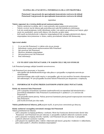 ULOTKA DLA PACJENTA: INFORMACJA DLA UŻYTKOWNIKA Potactasol 1 mg proszek do sporządzania koncentratu roztworu do infuzji Potactasol 4 mg proszek do sporządzania koncentratu roztworu do infuzji topotekan Należy zapoznać się z treścią ulotki przed zastosowaniem leku. Należy zachować tę ulotkę, aby w razie potrzeby móc ją ponownie przeczytać. Należy zwrócić się do lekarza gdy potrzebna jest rada lub dodatkowa informacja. Lek ten został przepisany ściśle określonej osobie i nie należy go przekazywać innym, gdyż może im zaszkodzić, nawet jeśli objawy ich choroby są takie same. Jeśli nasili się którykolwiek z objawów niepożądanych lub wystąpią jakiekolwiek objawy niepożądane niewymienione w ulotce, należy powiadomić lekarza lub farmaceutę. Spis treści ulotki: 1. 2. 3. 4. 5. 6. 1. Co to jest lek Potactasol i w jakim celu się go stosuje Informacje ważne przed zastosowaniem leku Potactasol Jak stosować lek Potactasol Możliwe działania niepożądane Jak przechowywać lek Potactasol Inne informacje CO TO JEST LEK POTACTASOL I W JAKIM CELU SIĘ GO STOSUJE Lek Potactasol pomaga zabijać komórki nowotworowe. Lek Potactasol jest stosowany w leczeniu: raka jajnika lub drobnokomórkowego raka płuca w przypadku wystąpienia nawrotu po chemioterapii zaawansowanego raka szyjki macicy w przypadku, gdy nie jest możliwe leczenie chirurgiczne lub radioterapia. W tym przypadku leczenie lekiem Potactasol jest skojarzone z cisplatyną. 2. INFORMACJE WAŻNE PRZED ZASTOSOWANIEM LEKU POTACTASOL Kiedy nie stosować leku Potactasol: jeśli u pacjenta stwierdzono uczulenie (nadwrażliwość) na topotekan lub którykolwiek z pozostałych składników leku Potactasol (wymienionych w punkcie 6 „Co zawiera lek Potactasol”); jeśli pacjentka karmi piersią. Należy przerwać karmienie piersią przed rozpoczęciem stosowania leku Potactasol; jeśli liczba krwinek jest zbyt mała. Należy poinformować lekarza, jeśli pacjent myśli, że powyższe ostrzeżenia go dotyczą. Kiedy zachować szczególną ostrożność stosując lek Potactasol Należy poinformować lekarza: - jeśli u pacjenta występują problemy z nerkami. Może być konieczne dostosowanie dawki leku Potactasol. Lek Potactasol nie jest zalecany w przypadku ciężkich zaburzeń czynności nerek. - jeśli u pacjenta występują choroby wątroby. Lek Potactasol nie jest zalecany w przypadku ciężkich zaburzeń czynności wątroby. - jeśli pacjent ma zapalenie płuc z takim i objawami jak kaszel, gorączka i trudności w oddychaniu, patrz także punkt 4 „Możliwe działania niepożądane”. Lek Potactasol może powodować zmniejszenie liczby płytek krwi. To może prowadzić do silnego krwawienia z nawet relatywnie niewielkich ran takich jak małe skaleczenie. Rzadko, może to prowadzić do ciężkiego krwawienia (krwotoku). Należy porozmawiać z lekarzem o tym jak zmniejszyć ryzyko krwawienia. Występowanie działań niepożądanych jest częstsze u pacjentów z ogólnie słabym stanem zdrowia. Lekarz oceni ogólny stan zdrowia pacjenta podczas leczenia i należy poinformować lekarza, jeśli u pacjenta wystąpi gorączka, zakażenia lub jeżeli pacjent poczuje się źle. Stosowanie innych leków Należy poinformować lekarza o wszystkich przyjmowanych aktualnie lub ostatnio lekach także tych, które są wydawane bez recepty. Ciąża i karmienie piersią Leku Potactasol nie należy stosować u kobiet w ciąży. Jeśli pacjentka jest w ciąży lub podejrzewa, że może być w ciąży powinna niezwłocznie poinformować lekarza. Kobiety w wieku rozrodczym powinny stosować skuteczne metody antykoncepcji, aby zapobiegać ciąży podczas stosowania leku. Mężczyźni, którzy są pacjentami i planują posiadanie dziecka, powinni zapytać lekarza o radę dotyczącą planowania potomstwa lub leczenia. Nie wolno karmić piersią w czasie stosowania leku Potactasol. Prowadzenie pojazdów i obsługa maszyn Lek Potactasol może wywoływać zmęczenie lub osłabienie. W przypadku wystąpienia zmęczenia lub osłabienia nie należy prowadzić pojazdów ani obsługiwać urządzeń mechanicznych. Ważne informacje o niektórych składnikach leku Potactasol Ten lek zawiera mniej niż 1 mmol sodu (23 mg) na fiolkę, co oznacza że lek uznaje się za „wolny od sodu”. 3. JAK STOSOWAĆ LEK POTACTASOL Dawka leku Potactasol będzie zależała od: leczonej choroby, powierzchni ciała pacjenta (m2), wyników badań krwi przeprowadzonych przed leczeniem i podczas leczenia, od tolerancji leku przez pacjenta. Pacjenci dorośli Rak jajnika i drobnokomórkowy rak płuca Zwykle stosowana dawka to 1,5 mg na metr kwadratowy powierzchni ciała raz na dobę, przez 5 dni. Taki cykl leczenia będzie normalnie powtarzany co trzy tygodnie. Rak szyjki macicy Zwykle stosowana dawka to 0,75 mg na metr kwadratowy powierzchni ciała raz na dobę, przez 3 dni. Taki cykl leczenia będzie normalnie powtarzany co trzy tygodnie. Podczas leczenia raka szyjki macicy, lek Potactasol jest stosowany w połączeniu z innym lekiem przeciwnowotworowym zawierającym cisplatynę. W celu uzyskania informacji o cisplatynie, należy zapoznać się z odpowiednią Ulotką dla Pacjenta. Dzieci Doświadczenia u dzieci są ograniczone i dlatego leczenie tym lekiem nie jest zalecane. Jak przygotowuje się lek Potactasol Topotekan jest dostarczany jako proszek do sporządzania koncentratu roztworu do infuzji. Proszek musi być rozpuszczony a powstały koncentrat następnie rozcieńczony przed podaniem. Jak podawany jest lek Potactasol Lekarz lub pielęgniarka podaje rozpuszczony i rozcieńczony roztwór leku Potactasol w postaci infuzji dożylnej (kroplówki), która jest zazwyczaj podawana do żyły ramiennej w czasie około 30 minut. 4. MOŻLIWE DZIAŁANIA NIEPOŻĄDANE Jak każdy lek, Potactasol może powodować działania niepożądane, chociaż nie u każdego one wystąpią. Te działania niepożądane mogą wystąpić z określoną częstością i są zdefini