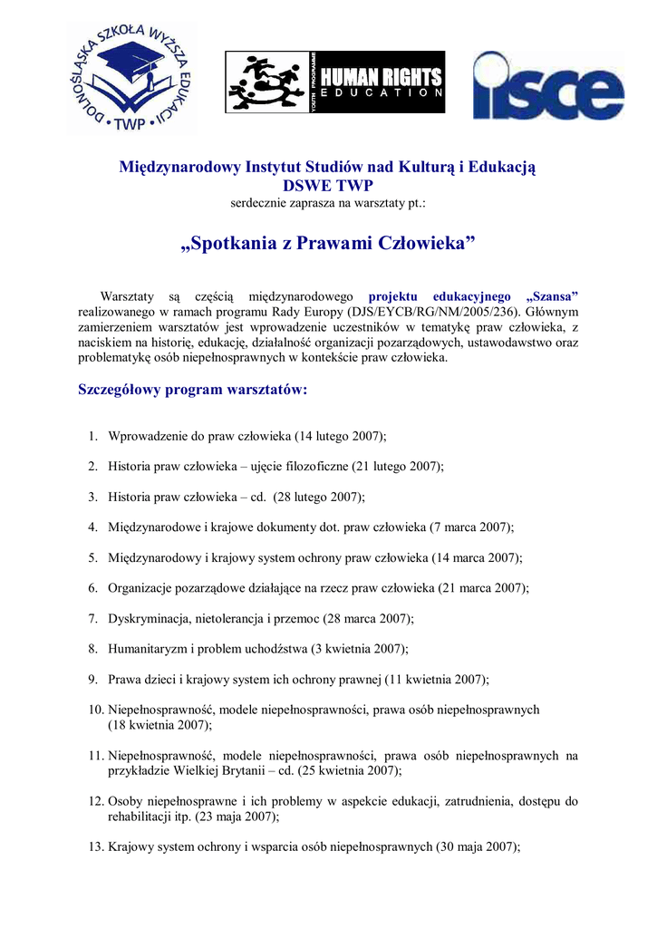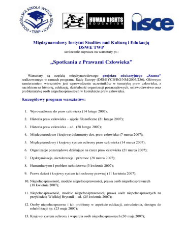 Międzynarodowy Instytut Studiów nad Kulturą i Edukacją DSWE TWP serdecznie zaprasza na warsztaty pt.: „Spotkania z Prawami Człowieka” Warsztaty są częścią międzynarodowego projektu edukacyjnego „Szansa” realizowanego w ramach programu Rady Europy (DJS/EYCB/RG/NM/2005/236). Głównym zamierzeniem warsztatów jest wprowadzenie uczestników w tematykę praw człowieka, z naciskiem na historię, edukację, działalność organizacji pozarządowych, ustawodawstwo oraz problematykę osób niepełnosprawnych w kontekście praw człowieka. Szczegółowy program warsztatów: 1. Wprowadzenie do praw człowieka (14 lutego 2007); 2. Historia praw człowieka – ujęcie filozoficzne (21 lutego 2007); 3. Historia praw człowieka – cd. (28 lutego 2007); 4. Międzynarodowe i krajowe dokumenty dot. praw człowieka (7 marca 2007); 5. Międzynarodowy i krajowy system ochrony praw człowieka (14 marca 2007); 6. Organizacje pozarządowe działające na rzecz praw człowieka (21 marca 2007); 7. Dyskryminacja, nietolerancja i przemoc (28 marca 2007); 8. Humanitaryzm i problem uchodźstwa (3 kwietnia 2007); 9. Prawa dzieci i krajowy system ich ochrony prawnej (11 kwietnia 2007); 10. Niepełnosprawność, modele niepełnosprawności, prawa osób niepełnosprawnych (18 kwietnia 2007); 11. Niepełnosprawność, modele niepełnosprawności, prawa osób niepełnosprawnych na przykładzie Wielkiej Brytanii – cd. (25 kwietnia 2007); 12. Osoby niepełnosprawne i ich problemy w aspekcie edukacji, zatrudnienia, dostępu do rehabilitacji itp. (23 maja 2007); 13. Krajowy system ochrony i wsparcia osób niepełnosprawnych (30 maja 2007); 14. Temat zajęć zaproponowany przez studentów; egzamin ustny lub pisemny lub praca kontrolna (6 czerwca 2007); 15. Warsztat ewaluacyjny, zakończenie zajęć (13 czerwca 2007). Dodatkowo uczestnicy wezmą udział w: 1. Seminarium pt. „Edukacja i rehabilitacja osób niesłyszących i niedosłyszących na przykładzie miasta Bradford w Wielkiej Brytanii”, które odbędzie się 22 marca 2007 r.; 2. Międzynarodowej konferencji pt. „Niepełnosprawny a edukacja – doświadczenia brytyjskie”, 9 maja 2007 r.; 3. Seminarium pt. „Against all discriminations”, które odbędzie się w sierpniu 2007 r. w Strasburgu (Francja) w siedzibie Rady Europy. Organizatorem jest Youth Express Network ze Strasburga. 4. Seminarium pt. „Yes to intercultural dialog”, również organizowanym przez Youth Express Network. Szczegóły dotyczące daty i miejsca zostaną podane później. Zajęcia odbywają się 3-4 razy w miesiącu, w godz. 15.00 – 19.00, głównie w środy, i trwają cały letni semestr akademicki – łącznie 60 h zajęć + udział w seminarium i konferencji. Miejsce warsztatów: Międzynarodowy Instytut Studiów nad Kulturą i Edukacją we Wrocławiu, ul. Wagonowa 6, wejście B, 53-609 Wrocław, tel. 071-358-27-58. Koszt uczestnictwa: każdy uczestnik musi dokonać wpłaty w wysokości 150 zł. Cykl warsztatów kończy się wydaniem zaświadczenia oraz możliwością uczestnictwa w międzynarodowych projektach i współpracy na tym polu. Osoby zainteresowane proszone są o kontakt z prowadzącym: Damian Dudała tel.: 0-605-697-839 E-mail: [email protected] Prowadzący: Damian Dudała – koordynator projektów „Niepełnosprawność i prawa człowieka” w Międzynarodowym Instytucie Studiów nad Kulturą i Edukacją DSWE (www.iisce.org); założyciel i Wiceprezes Fundacji Together Polska (www.together-asbl.com); założyciel i trener Ogólnopolskiego Stowarzyszenia na Rzecz Edukacji o Prawach Człowieka KOMPAS (www.hre.pl). Członek Amnesty International. Stypendysta Programu Sokrates Erasmus – Bradford College w Wielkiej Brytanii. Uczestnik XIII Letniej Szkoły Liderów Społeczeństwa Obywatelskiego, a także wielu szkoleń, seminariów i konferencji w kraju i za granicą. Kwestią praw człowieka i niepełnosprawności zajmuje się od ponad 4 lat. - Prowadzącymi warsztaty będą również osoby z Amnesty International, Polskiej Akcji Humanitarnej itp. Opinie uczestników ubiegłych edycji: Kijaszek Monika Ogólnie warsztaty pt. „Spotkania z prawami człowieka” bardzo mi się podobały. Zarówno pod względem tematycznym, jak również praktycznym. Wiedza, zdobyta podczas zajęć przydaje mi się w życiu i wiem, że nadal będzie mi towarzyszyć. Warsztaty były ciekawe i inspirujące. Prowadzący warsztaty jest osobą charyzmatyczną posiadającą pasję, dlatego tym chętniej uczestniczyło się w zajęciach. Wtorki były „Prawami człowieka”. Dobosz Anna Zajęcia były bardzo interesujące. Pozwoliły mi na zapoznanie się z tematyką, która wcześniej była mi niemal zupełnie obca. Odpowiadała mi forma zajęć i zakres poruszanych zagadnień. Proponowałabym w kolejnej edycji większej ilości osób prowadzących zajęcia – goście z różnych środowisk. Szwed Ania Bardzo szybko zleciał mi ten rok. Szczególnie warsztaty i czas poświęcony prawom człowieka. Każde zajęcia były bardzo ciekawe. Dzięki nim mam szersze i głębsze spojrzenie na to, jak ważne i istotne jest postrzeganie Praw Człowieka w dzisiejszym świecie. Brałam w nich udział ponieważ na początku zainteresowała mnie ich tematyka i problem dyskryminacji osób niepełnosprawnych. Bardzo dziękuję za przekazaną mi wiedzę i poświęcony mi czas. Zajęcia były ciekawie prowadzone i przygotowane. Cieszy mnie fakt, że będą one kontynuowane w trzeciej edycji. Sosik Sylwia Warsztaty, na które uczęszczałam, pt. „Spotkania z prawami człowieka”, pozwoliły mi pogłębić wiedzę nie tylko o prawach przysługujących każdemu z nas, ale również o prawach przysługujących pewnym grupom ludzi, w tym osobom niepełnosprawnym. Sądzę, że czas, który poświęciłam nie był stracony, gdyż na każdych zajęciach dowiadywałam się wielu przydatnych mi informacji. Prowadzący warsztaty, Damian Dudała, zawsze był bardzo dobrze przygotowany do zajęć i