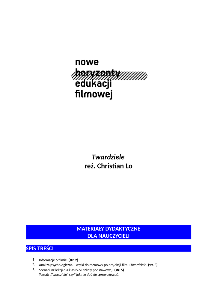 Twardziele reż. Christian Lo MATERIAŁY DYDAKTYCZNE DLA NAUCZYCIELI SPIS TREŚCI 1. Informacje o filmie. (str. 2) 2. Analiza psychologiczna – wątki do rozmowy po projekcji filmu Twardziele. (str. 3) 3. Scenariusz lekcji dla klas IV-VI szkoły podstawowej. (str. 5) Temat: „Twardziele” czyli jak nie dać się sprowokować. INFORMACJE O FILMIE NOTA O FILMIE Tytuł: Twardziele (De tøffeste gutta); Reżyseria: Christian Lo; Scenariusz: Arild Tryggestad, Christian Lo, Nick Hegreberg; Zdjęcia: Bjørn Ståle Bratberg; Muzyka: Eirik Myhr; Montaż: Arild Tryggestad; Obsada : Anders Baasmo Christiansen, Cecilie Mosli, Sondre B. Henriksen, Regine Stokkevåg Eide, Martin Røsjorde Linstad; Producent: Trine Aadalen Lo; Produkcja: Filmbin AS; Kraj i rok produkcji: Norwegia, 2013; Premiera: 6 września 2013 r.; Czas trwania: 76 min. NOTA O REŻYSERZE Christian Lo (ur. 1977 r.) – ukończył studia z zakresu produkcji filmowej w Anglii. Wyreżyserował wielokrotnie nagradzane filmy krótkometrażowe dla najmłodszych, między innymi Iver i Baluba Runa (wyświetlane również w ramach sekcji Kino Dzieci: Norwegia). Twardziele są drugim (po filmie Rafiki) wyreżyserowanym przez niego pełnym metrażem. O FILMIE W Twardzielach, jak często bywa w filmach kierowanych do młodzieży, pojawia się problem przemocy wśród rówieśników. Nie jest to jednak pesymistyczne kino, a raczej opowieść o bohaterstwie, które tkwi w każdym zwykłym człowieku. Wyjątkowość Twardzieli polega na tym, że można tu zarówno znaleźć przyczynę przemocy (a także braku reakcji na nią), jak i zrozumieć, że taka sytuacja jest możliwa do przezwyciężenia. Drogą do tego powinna być przyjaźń, szczerość i wspólne działanie. Jedenastoletni Modulf jest superbohaterem. Tak o sobie myśli i z takim przeświadczeniem rusza codziennie do szkoły, w której jest zastraszany przez silniejszych uczniów. Nie stawia jednak oporu. Akceptuje tę sytuację, ponieważ wydaje mu się, że jako superbohater uchroni od przemocy inne, słabsze od niego dzieci. Chce je osłaniać i przyjmować na siebie każdy cios i zaczepkę. Nikt z rówieśników tego nie zauważa. Dopiero nowa koleżanka z klasy daje Modulfowi do zrozumienia, że jego zachowanie nie jest dobrą drogą do tego, by stawić czoła przemocy. Wspólnie wpadają na pomysł, jak zmienić realia panujące w ich szkole. 2 MATERIAŁ NA GODZINĘ WYCHOWAWCZĄ Opracowała: Joanna Giereło Analiza psychologiczna – wątki do rozmowy po projekcji filmu „Twardziele”. TEMATY I PYTANIA DO PORUSZENIA Z DZIEĆMI Główny bohater filmu – Modulf – jest 12-letnim uczniem, który doświadcza przemocy w szkole. W życiu chłopca pojawia się nowa sąsiadka – Lise – córka żołnierza, która nie zgadza się na takie traktowanie swojego kolegi. To historia o przemocy rówieśniczej i radzeniu sobie w takich sytuacjach, to również opowieść o przyjaźni, ale także o śmierci rodzica i tęsknoty za nim. 1. Przemoc w szkole. Które z zachowań, jakich doświadczali Modulf i Lise ze strony rówieśników, można nazwać przemocą szkolną? zmuszanie Modulfa, aby zrobił coś czego nie chciał (np. zmuszanie do „oddawania” prac domowych); straszenie, groźby; obrażanie, upokarzanie (np. kiedy chłopiec został zmuszony do publicznego przemarszu w bieliźnie, z książka na głowie); bicie, popychanie. Czy dzieci obserwują inne rodzaje przemocy szkolnej w swoim otoczeniu? Warto zwrócić uwagę dzieci na specyficzną formę przemocy, jaką jest izolowanie kogoś np. od zabawy, kontaktu, obgadywanie, niszczenie rzeczy innych osób. Dlaczego chłopiec ciągle był szykanowany? Jakie zachowania podtrzymują przemoc w szkole? utrzymywanie przemocy w tajemnicy przed dorosłym i czy rówieśnikami; brak reakcji ze strony innych dzieci – odsuwanie się od szykanowanych dzieci; próba unikania dręczycieli (schodzenie im z drogi); wykonywanie wszystkich poleceń dręczycieli, podporządkowywanie się prześladowcom. Jak Modulf próbował sobie poradzić z problemem przemocy? Co przyniosło efekt? zaprzyjaźnił się z nową koleżanką – Lise, opowiedział jej o problemie jaki ma w szkole – kiedy nie jesteśmy sami, stajemy się silniejsi; ćwiczył wspólnie z Lise bycie twardzielem: ignorowanie dręczycieli, odgrywanie roli osoby pewnej siebie, odpowiadanie na ich zaczepki, nauka samoobrony; znalazł wsparcie w grupie: zorganizował spotkanie całej klasy na złomowisku i zdemaskował prawdziwych dręczycieli; jasno powiedział dręczycielom, że nie zgadza się na takie traktowanie. Co można zrobić kiedy doświadcza się przemocy lub widzi się taką sytuację, a samodzielne próby poradzenia sobie nie przynoszą efektu? należy opowiedzieć o całej sytuacji dorosłym: rodzicom, wychowawcy, a w niektórych przypadkach może być konieczne zgłoszenie sprawy dzielnicowemu; 3 warto podkreślić, że nie jest to forma skarżenia, ale dbania o własne prawa. 2. Przyjaźń. Czego można dowiedzieć się o przyjaźni Modulfa i Lise? Kim jest przyjaciel? przyjaciele troszczą się o siebie i pomagają rozwiązać problemy (Lise pomagała Modulfowi w poradzeniu sobie z dręczycielami); stają w swojej obronie; miło spędzają wspólnie czas. Literatura polecana: Śmierdzący ser, Catherine DePino, GWP, Gdańsk, 2007. 4 SCENARIUSZ LEKCJI DLA KLAS 4-6 SZKOŁY PODSTAWOWEJ Opracowała: Wioletta Mrozek Temat: „Twardziele” czyli jak nie dać się sprowokować. CELE LEKCJI Uczeń: określa temat i główną myśl utworu; wyciąga wnioski wynikające z przesłanek filmu; wyraża swój stosunek do postaci; omawia akcję, wyodrębnia wątki i wydarzenia; charakteryzuje i ocenia bohaterów; odczytuje wartości pozytywne i ich przeciwieństwa wpisane w teksty kultury (np. przyjaźń – wrogość, miłość – nienawiść, prawda – kłamstwo, wierność – zdrada). METODY I FORMY PRACY dyskusja, metaplan, analiza dzieła filmowego, formy pracy: zbiorowa, grupowa.