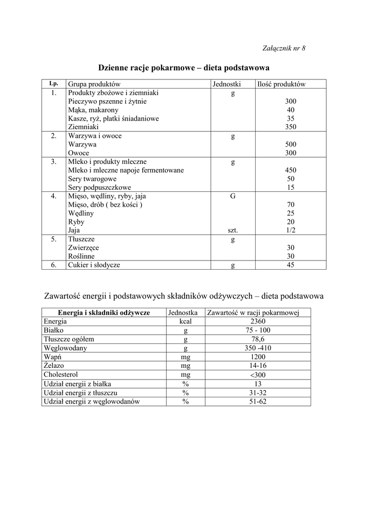 Załącznik nr 8 Dzienne racje pokarmowe – dieta podstawowa Lp. 1. 2. 3. 4. 5. 6. Grupa produktów Produkty zbożowe i ziemniaki Pieczywo pszenne i żytnie Mąka, makarony Kasze, ryż, płatki śniadaniowe Ziemniaki Warzywa i owoce Warzywa Owoce Mleko i produkty mleczne Mleko i mleczne napoje fermentowane Sery twarogowe Sery podpuszczkowe Mięso, wędliny, ryby, jaja Mięso, drób ( bez kości ) Wędliny Ryby Jaja Tłuszcze Zwierzęce Roślinne Cukier i słodycze Jednostki g Ilość produktów 300 40 35 350 g 500 300 g 450 50 15 G szt. g g 70 25 20 1/2 30 30 45 Zawartość energii i podstawowych składników odżywczych – dieta podstawowa Energia i składniki odżywcze Energia Białko Tłuszcze ogółem Węglowodany Wapń Żelazo Cholesterol Udział energii z białka Udział energii z tłuszczu Udział energii z węglowodanów Jednostka kcal g g g mg mg mg % % % Zawartość w racji pokarmowej 2360 75 - 100 78,6 350 -410 1200 14-16 <300 13 31-32 51-62 Dzienne racje pokarmowe – dieta podstawowa dla dzieci Lp. 1. 2. 3. 4. 5. 6. Grupa produktów Produkty zbożowe i ziemniaki Pieczywo pszenne i żytnie Mąka, makarony Kasze, ryż, płatki śniadaniowe Ziemniaki Warzywa i owoce Warzywa Owoce Mleko i produkty mleczne Mleko i mleczne napoje fermentowane Sery twarogowe Sery podpuszczkowe Mięso, wędliny, ryby, jaja Mięso, drób ( bez kości ) Wędliny Ryby Jaja Tłuszcze Zwierzęce Roślinne Cukier i słodycze Jednostki g g Ilość produktów 350 65 60 350 830 480 350 g 550 60 25 G szt. g g 50 25 15 ½ 28 27 45 Zawartość energii i podstawowych składników odżywczych – dieta podstawowa dla dzieci Energia i składniki odżywcze Energia Białko Tłuszcze ogółem Węglowodany Wapń Żelazo Cholesterol Udział energii z białka Udział energii z tłuszczu Udział energii z węglowodanów Jednostka kcal g g g mg mg mg % % % Zawartość w racji pokarmowej 2500-2600 75 85-90 360 -370 1200 11-14 <300 12 31 57 Dzienne racje pokarmowe – dieta podstawowa dla kobiet w ciąży i karmiących Lp. 1. 2. 3. 4. 5. 6. Grupa produktów Produkty zbożowe i ziemniaki Pieczywo pszenne i żytnie Mąka, makarony Kasze, ryż, płatki śniadaniowe Ziemniaki Warzywa i owoce Warzywa Owoce Mleko i produkty mleczne Mleko i mleczne napoje fermentowane Sery twarogowe Sery podpuszczkowe Mięso, wędliny, ryby, jaja Mięso, drób ( bez kości ) Wędliny Ryby Jaja Tłuszcze Zwierzęce Roślinne Cukier i słodycze Jednostki g g Ilość produktów 400 60 50 400 900 550 350 g 550 75 25 G szt. g g 80 30 20 1/3 60 30 30 50 Zawartość energii i podstawowych składników odżywczych – dieta podstawowa dla kobiet w ciąży i karmiących Energia i składniki odżywcze Energia Białko Tłuszcze ogółem Węglowodany Wapń Żelazo Cholesterol Udział energii z białka Udział energii z tłuszczu Udział energii z węglowodanów Jednostka kcal g g g mg mg mg % % % Zawartość w racji pokarmowej 2700-3000 90-95 95-105 375 -420 1200-2000 15-26 <300 13 31-32 55-56