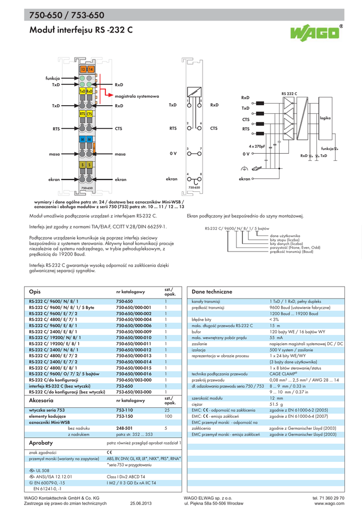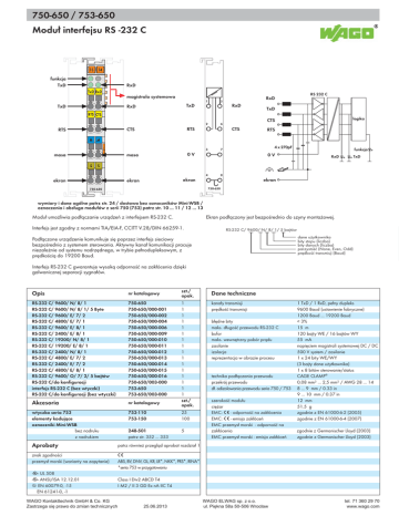 750-650 / 753-650 1 Moduł interfejsu RS -232 C 271 13 14 funkcja TxD A C B D RxD TxD RxD magistrala systemowa 1 TxD TxD RxD RxD 5 RxD RS 232 C TxD RTS CTS 2 RTS CTS RTS masa 0V ekran ekran logika CTS 6 CTS RTS M M 3 masa S 4 x 270pF 7 0V funkcja TxD RxD S 4 ekran 8 ekran 750-650 750-650 wymiary i dane ogólne patrz str. 24 / dostawa bez oznaczników Mini-WSB / oznaczenia i obsługa modułów z serii 750 (753) patrz str. 10 ... 11 / 12 ... 13 Moduł umożliwia podłączanie urządzeń z interfejsem RS-232 C. Ekran podłączony jest bezpośrednio do szyny montażowej. Interfejs jest zgodny z normami TIA/EIA-F, CCITT V.28/DIN 66259-1. RS-232 C/ 9600/ N/ 8/ 1/ 5 bajtów dane użytkownika bity stopu (liczba) bity danych (liczba) parzystość (None, Even, Odd) prędkość transmisji (Baud) Podłączone urządzenie komunikuje się poprzez interfejs sieciowy bezpośrednio z systemem sterowania. Aktywny kanał komunikacji pracuje niezależnie od systemu nadrzędnego, w trybie pełnodupleksowym, z prędkością do 19200 Baud. Interfejs RS-232 C gwarantuje wysoką odporność na zakłócenia dzięki galwanicznej separacji sygnałów. szt./ opak. Dane techniczne 1 1 1 1 1 1 1 1 1 1 1 1 1 1 1 1 szt./ opak. kanały transmisji prędkość transmisji Opis nr katalogowy RS-232 C/ 9600/ N/ 8/ 1 RS-232 C/ 9600/ N/ 8/ 1/ 5 Byte RS-232 C/ 9600/ E/ 7/ 2 RS-232 C/ 4800/ E/ 7/ 1 RS-232 C/ 9600/ E/ 8/ 1 RS-232 C/ 2400/ E/ 8/ 1 RS-232 C/ 19200/ N/ 8/ 1 RS-232 C/ 19200/ E/ 8/ 1 RS-232 C/ 2400/ N/ 8/ 1 RS-232 C/ 4800/ E/ 7/ 2 RS-232 C/ 2400/ E/ 7/ 2 RS-232 C/ 4800/ E/ 8/ 1 RS-232 C/ 9600/ O/ 7/ 2/ 5 bajtów RS-232 C/do konfiguracji interfejs RS-232 C (bez wtyczki) RS-232 C/do konfiguracji (bez wtyczki) 750-650 750-650/000-001 750-650/000-002 750-650/000-004 750-650/000-006 750-650/000-009 750-650/000-010 750-650/000-011 750-650/000-012 750-650/000-013 750-650/000-014 750-650/000-015 750-650/000-016 750-650/003-000 753-650 753-650/003-000 Akcesoria nr katalogowy wtyczka seria 753 elementy kodujące oznaczniki Mini-WSB bez nadruku z nadrukiem 753-110 753-150 25 100 248-501 patrz str. 352 ... 353 5 Aprobaty patrz również przegląd aprobat rozdział 1 znak zgodności przemysł morski (warianty na zapytanie) 1 ABS, BV, DNV, GL, KR, LR*, NKK*, PRS*, RINA* *seria 753 w przygotowaniu r UL 508 r ANSI/ISA 12.12.01 4 EN 60079-0, -15 EN 61241-0, -1 błędne bity maks. długość przewodu RS-232 C bufor maks. wewnętrzny pobór prądu zasilanie izolacja reprezentacja w obrazie procesu technika podłączania przewodu przekrój przewodu dł. odizolowania przewodu seria 750 / 753 szerokość modułu ciężar EMC: 1 - odporność na zakłócenia EMC: 1 - emisja zakłóceń EMC przemysł morski - odporność na zakłócenia EMC przemysł morski - emisja zakłóceń 1 TxD / 1 RxD, pełny dupleks 9600 Baud (ustawienie fabryczne) 1200 Baud ... 19200 Baud < 3% 15 m 120 bajty WE / 16 bajtów WY 55 mA napięciem magistrali systemowej DC / DC 500 V system / zasilanie 1 x 24 bity WE/WY (3 bajty dane użytkownika) 1 x 8 bitów sterowanie/status CAGE CLAMP® 0,08 mm² ... 2,5 mm² / AWG 28 ... 14 8 ... 9 mm / 0.33 in 9 ... 10 mm / 0.37 in 12 mm 51.5 g zgodnie z EN 61000-6-2 (2005) zgodnie z EN 61000-6-4 (2007) zgodnie z Germanischer Lloyd (2003) zgodnie z Germanischer Lloyd (2003) Class I Div2 ABCD T4 I M2 / II 3 GD Ex nA IIC T4 :$*2.RQWDNWWHFKQLN*PE+&R.* :$*2(/:$*VS]RR =DVWU]HJDVLĊSUDZRGR]PLDQWHFKQLF]Q\FK XO3LĊNQDD:URFáDZ WHO ZZZZDJRFRP 1.7