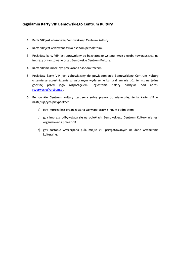 Regulamin Karty VIP Bemowskiego Centrum Kultury 1. Karta VIP jest własnością Bemowskiego Centrum Kultury. 2. Karta VIP jest wydawana tylko osobom pełnoletnim. 3. Posiadacz karty VIP jest uprawniony do bezpłatnego wstępu, wraz z osobą towarzyszącą, na imprezy organizowane przez Bemowskie Centrum Kultury. 4. Karta VIP nie może być przekazana osobom trzecim. 5. Posiadacz karty VIP jest zobowiązany do powiadomienia Bemowskiego Centrum Kultury o zamiarze uczestniczenia w wybranym wydarzeniu kulturalnym nie później niż na jedną godzinę przed jego rozpoczęciem. Zgłoszenia należy nadsyłać pod adres: [email protected]. 6. Bemowskie Centrum Kultury zastrzega sobie prawo do nieuwzględnienia karty VIP w następujących przypadkach: a) gdy impreza jest organizowana we współpracy z innym podmiotem. b) gdy impreza odbywająca się na obiektach Bemowskiego Centrum Kultury nie jest organizowana przez BCK. c) gdy zostanie wyczerpana pula miejsc VIP przygotowanych na dane wydarzenie kulturalne.