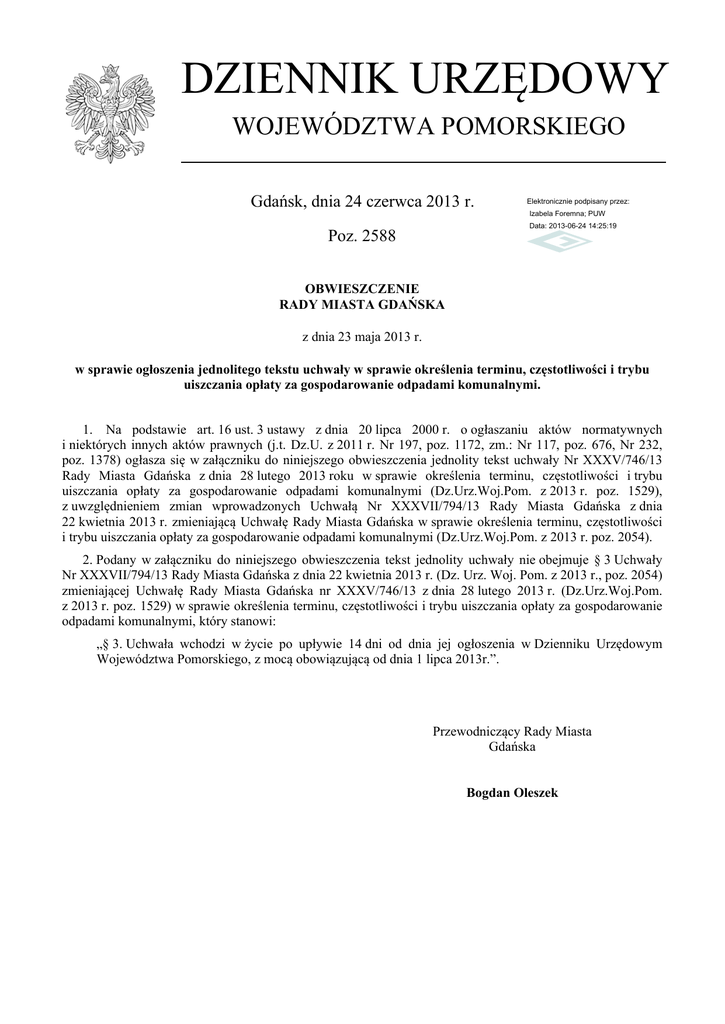 DZIENNIK URZĘDOWY WOJEWÓDZTWA POMORSKIEGO Gdańsk, dnia 24 czerwca 2013 r. Elektronicznie podpisany przez: Izabela Foremna; PUW Data: 2013-06-24 14:25:19 Poz. 2588 OBWIESZCZENIE RADY MIASTA GDAŃSKA z dnia 23 maja 2013 r. w sprawie ogłoszenia jednolitego tekstu uchwały w sprawie określenia terminu, częstotliwości i trybu uiszczania opłaty za gospodarowanie odpadami komunalnymi. 1. Na podstawie art. 16 ust. 3 ustawy z dnia 20 lipca 2000 r. o ogłaszaniu aktów normatywnych i niektórych innych aktów prawnych (j.t. Dz.U. z 2011 r. Nr 197, poz. 1172, zm.: Nr 117, poz. 676, Nr 232, poz. 1378) ogłasza się w załączniku do niniejszego obwieszczenia jednolity tekst uchwały Nr XXXV/746/13 Rady Miasta Gdańska z dnia 28 lutego 2013 roku w sprawie określenia terminu, częstotliwości i trybu uiszczania opłaty za gospodarowanie odpadami komunalnymi (Dz.Urz.Woj.Pom. z 2013 r. poz. 1529), z uwzględnieniem zmian wprowadzonych Uchwałą Nr XXXVII/794/13 Rady Miasta Gdańska z dnia 22 kwietnia 2013 r. zmieniającą Uchwałę Rady Miasta Gdańska w sprawie określenia terminu, częstotliwości i trybu uiszczania opłaty za gospodarowanie odpadami komunalnymi (Dz.Urz.Woj.Pom. z 2013 r. poz. 2054). 2. Podany w załączniku do niniejszego obwieszczenia tekst jednolity uchwały nie obejmuje § 3 Uchwały Nr XXXVII/794/13 Rady Miasta Gdańska z dnia 22 kwietnia 2013 r. (Dz. Urz. Woj. Pom. z 2013 r., poz. 2054) zmieniającej Uchwałę Rady Miasta Gdańska nr XXXV/746/13 z dnia 28 lutego 2013 r. (Dz.Urz.Woj.Pom. z 2013 r. poz. 1529) w sprawie określenia terminu, częstotliwości i trybu uiszczania opłaty za gospodarowanie odpadami komunalnymi, który stanowi: „§ 3. Uchwała wchodzi w życie po upływie 14 dni od dnia jej ogłoszenia w Dzienniku Urzędowym Województwa Pomorskiego, z mocą obowiązującą od dnia 1 lipca 2013r.”. Przewodniczący Rady Miasta Gdańska Bogdan Oleszek Dziennik Urzędowy Województwa Pomorskiego –2– Poz. 2588 Załącznik do Obwieszczenia Rady Miasta Gdańska z dnia 23 maja 2013 r. Uchwała XXXV/746/13 Rady Miasta Gdańska z dnia 28 lutego 2013r. w sprawie określenia terminu, częstotliwości i trybu uiszczania opłaty za gospodarowanie odpadami komunalnymi. Na podstawie art. 18 ust.2 pkt 15, art.40 ust.1 i art.41 ust.1 ustawy z dnia 8 marca 1990r. o samorządzie gminnym (tekst jednolity Dz.U. z 2001r. Nr 142, poz.1591; z 2002r. Dz.U. Nr 23, poz.220, Nr 62, poz. 558, Nr 113, poz.984, Nr 153, poz.1271, Nr 214, poz.1806; z 2003r. Dz.U. Nr 80, poz. 717, Nr 162, poz.1568; z 2004r. Dz.U. Nr 102, poz.1055, Nr 116, poz.1203; z 2005r., Dz.U. Nr 172, poz.1441, Nr 175, poz.1457; z 2006r. Dz.U. Nr 17, poz.128, Nr 181, poz. 1337; z 2007r. Dz.U. Nr 48, poz.327, Nr 138, poz.974, Nr 173, poz.1218; z 2008r. Dz.U. Nr 180, poz.1111; Nr 223, poz. 1458; z 2009r. Dz.U. Nr 52, poz.420, Nr 157, poz. 1241, z 2010r. Dz.U. Nr 28, poz.142 i 146, Nr 40, poz. 230; Nr 106, poz.675; z 2011 r. Dz. U. Nr 21, poz.113; Nr 117, poz. 679; Nr 134, poz.777; Nr 149, poz. 887; Nr 217, poz.1281; Dz.U. z 2012 r. poz. 567) oraz art.6 l ustawy z dnia 13 września 1996r. o utrzymaniu czystości i porządku w gminach (tekst jednolity Dz.U. z 2012 poz.391; z 2013r. poz.21,poz.228) uchwala się, co następuje: §11) 1. Opłaty za gospodarowanie odpadami komunalnymi, należne za dany miesiąc uiszczane będą miesięcznie przez właścicieli nieruchomości, na których zamieszkują mieszkańcy - w terminie do 15 dnia każdego miesiąca za miesiąc poprzedni. 2. Opłaty za gospodarowanie odpadami komunalnymi, należne za dany miesiąc uiszczane będą miesięcznie przez właścicieli nieruchomości, na których nie zamieszkują mieszkańcy, a powstają odpady komunalne - w terminie do 15 dnia każdego miesiąca za miesiąc poprzedni. 3. Opłaty za gospodarowanie odpadami komunalnymi, należne za dany miesiąc, uiszczane będą miesięcznie przez właścicieli nieruchomości, które w części stanowią nieruchomość na której zamieszkują mieszkańcy i w części nieruchomość na której nie zamieszkują mieszkańcy, a powstają odpady komunalne – w terminie do 15 dnia każdego miesiąca za miesiąc poprzedni. 4. W 2013 roku pierwsza opłata za gospodarowanie odpadami komunalnymi będzie należna począwszy od miesiąca lipca 2013r. i płatna do dnia 15 sierpnia 2013r. §2 Właściciele nieruchomości opłatę za gospodarowanie odpadami komunalnymi uiszczać będą, bez wezwania, w kasie Zarządu Dróg i Zieleni w Gdańsku (gotówką lub kartą płatniczą) lub na właściwy rachunek bankowy Zarządu Dróg i Zieleni w Gdańsku. §3 Wykonanie uchwały powierza się Prezydentowi Miasta Gdańska. 1) W brzmieniu ustalonym przez § 1 Uchwały Nr XXXVII/794/13 Rady Miasta Gdańska z dnia 22 kwietnia 2013r. zmieniającej uchwałę Rady Miasta Gdańska w sprawie określenia terminu, częstotliwości i trybu uiszczania opłaty za gospodarowanie odpadami komunalnymi. Dziennik Urzędowy Województwa Pomorskiego –3– Poz. 2588 §4 Uchwała wchodzi w życie po upływie 14 dni od dnia jej ogłoszenia w Dzienniku Urzędowym Województwa Pomorskiego, z mocą obowiązującą od dnia 1 lipca 2013r. Przewodniczący Rady Miasta Gdańska Bogdan Oleszek