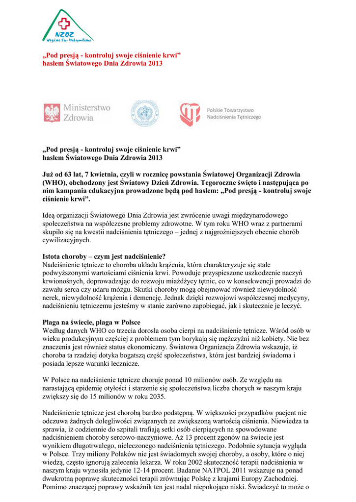 „Pod presją - kontroluj swoje ciśnienie krwi” hasłem Światowego Dnia Zdrowia 2013 „Pod presją - kontroluj swoje ciśnienie krwi” hasłem Światowego Dnia Zdrowia 2013 Już od 63 lat, 7 kwietnia, czyli w rocznicę powstania Światowej Organizacji Zdrowia (WHO), obchodzony jest Światowy Dzień Zdrowia. Tegoroczne święto i następująca po nim kampania edukacyjna prowadzone będą pod hasłem: „Pod presją - kontroluj swoje ciśnienie krwi”. Ideą organizacji Światowego Dnia Zdrowia jest zwrócenie uwagi międzynarodowego społeczeństwa na współczesne problemy zdrowotne. W tym roku WHO wraz z partnerami skupiło się na kwestii nadciśnienia tętniczego – jednej z najgroźniejszych obecnie chorób cywilizacyjnych. Istota choroby – czym jest nadciśnienie? Nadciśnienie tętnicze to choroba układu krążenia, która charakteryzuje się stale podwyższonymi wartościami ciśnienia krwi. Powoduje przyspieszone uszkodzenie naczyń krwionośnych, doprowadzając do rozwoju miażdżycy tętnic, co w konsekwencji prowadzi do zawału serca czy udaru mózgu. Skutki choroby mogą obejmować również niewydolność nerek, niewydolność krążenia i demencję. Jednak dzięki rozwojowi współczesnej medycyny, nadciśnieniu tętniczemu jesteśmy w stanie zarówno zapobiegać, jak i skutecznie je leczyć. Plaga na świecie, plaga w Polsce Według danych WHO co trzecia dorosła osoba cierpi na nadciśnienie tętnicze. Wśród osób w wieku produkcyjnym częściej z problemem tym borykają się mężczyźni niż kobiety. Nie bez znaczenia jest również status ekonomiczny. Światowa Organizacja Zdrowia wskazuje, iż choroba ta rzadziej dotyka bogatszą część społeczeństwa, która jest bardziej świadoma i posiada lepsze warunki lecznicze. W Polsce na nadciśnienie tętnicze choruje ponad 10 milionów osób. Ze względu na narastającą epidemię otyłości i starzenie się społeczeństwa liczba chorych w naszym kraju zwiększy się do 15 milionów w roku 2035. Nadciśnienie tętnicze jest chorobą bardzo podstępną. W większości przypadków pacjent nie odczuwa żadnych dolegliwości związanych ze zwiększoną wartością ciśnienia. Niewiedza ta sprawia, iż codziennie do szpitali trafiają setki osób cierpiących na spowodowane nadciśnieniem choroby sercowo-naczyniowe. Aż 13 procent zgonów na świecie jest wynikiem długotrwałego, nieleczonego nadciśnienia tętniczego. Podobnie sytuacja wygląda w Polsce. Trzy miliony Polaków nie jest świadomych swojej choroby, a osoby, które o niej wiedzą, często ignorują zalecenia lekarza. W roku 2002 skuteczność terapii nadciśnienia w naszym kraju wynosiła jedynie 12-14 procent. Badanie NATPOL 2011 wskazuje na ponad dwukrotną poprawę skuteczności terapii zrównując Polskę z krajami Europy Zachodniej. Pomimo znaczącej poprawy wskaźnik ten jest nadal niepokojąco niski. Świadczyć to może o niskiej świadomości skutków choroby i lekceważeniu problemu przez społeczeństwo. Szczęśliwie mamy potencjał do tego by stanąć na równi z takimi krajami, jak Kanada i USA, które są liderami w zakresie kontroli nadciśnienia tętniczego na świecie. Poziom wiedzy i rozwiązań medycznych może nam w tym bardzo pomóc. Wystarczy kilka prostych zmian Zdaniem specjalistów medycyny oraz przedstawicieli Światowej Organizacji Zdrowia regularna kontrola wartości ciśnienia krwi, która przyczynia się do wczesnego rozpoznania chorób układu krążenia, jest kluczem do zapobiegania zawałowi serca czy udarowi mózgu. Apeluje się również o zmianę stylu życia. Ryzyko rozwoju choroby można bowiem minimalizować poprzez zmniejszenie spożycia soli, wprowadzenie zrównoważonej diety, regularne ćwiczenia, nie palenie czy ograniczenie spożycia alkoholu. Często wprowadzenie tych modyfikacji w codzienne życie wystarczy, aby utrzymać właściwe wartości ciśnienia. Gdy choroba jest zaawansowana, wymagane jest włączenie terapii. Światowa Organizacja Zdrowia przekonuje, iż współczesne leki hipotensyjne są łatwo dostępne, niedrogie i skuteczne, a głównym czynnikiem, który może zawieść jest sam pacjent –niestosujący zaleceń lekarza. Wychodząc naprzeciw problemowi – WHO, w ramach szerzenia edukacji zdrowotnej, decyduje się promować podstawowe zasady prewencji nadciśnienia: dietę eliminującą tłuszcze trans oraz redukującą spożycie soli, a także propagować aktywny styl życia oraz system oceny ryzyka kardiometabolicznego. Geneza doboru tematyki Światowego Dnia Zdrowia, jego założenia i cele zostaną przedstawione przez Światową Organizację Zdrowia we współpracy z Ministerstwem Zdrowia i Polskim Towarzystwem Nadciśnienia Tętniczego (PTNT) na konferencji, która odbędzie się 5 kwietnia 2013 r. Więcej informacji: http://www.who.int/campaigns/world-health-day/2013/en/index.html Dr Paulina Miśkiewicz Dyrektor Biura WHO w Polsce [email protected] tel: +22 635 94 96 Prof. Danuta Czarnecka Prezes PTNT [email protected] tel: +12 424 73 00 Prof. Krzysztof Narkiewicz Konsultant Krajowy w dziedzinie hipertensjologii [email protected] tel: + 58 349 25 27 © 2011 Ministerstwo Zdrowia © 2002-2011 Platforma Activeweb Medical Solutions.