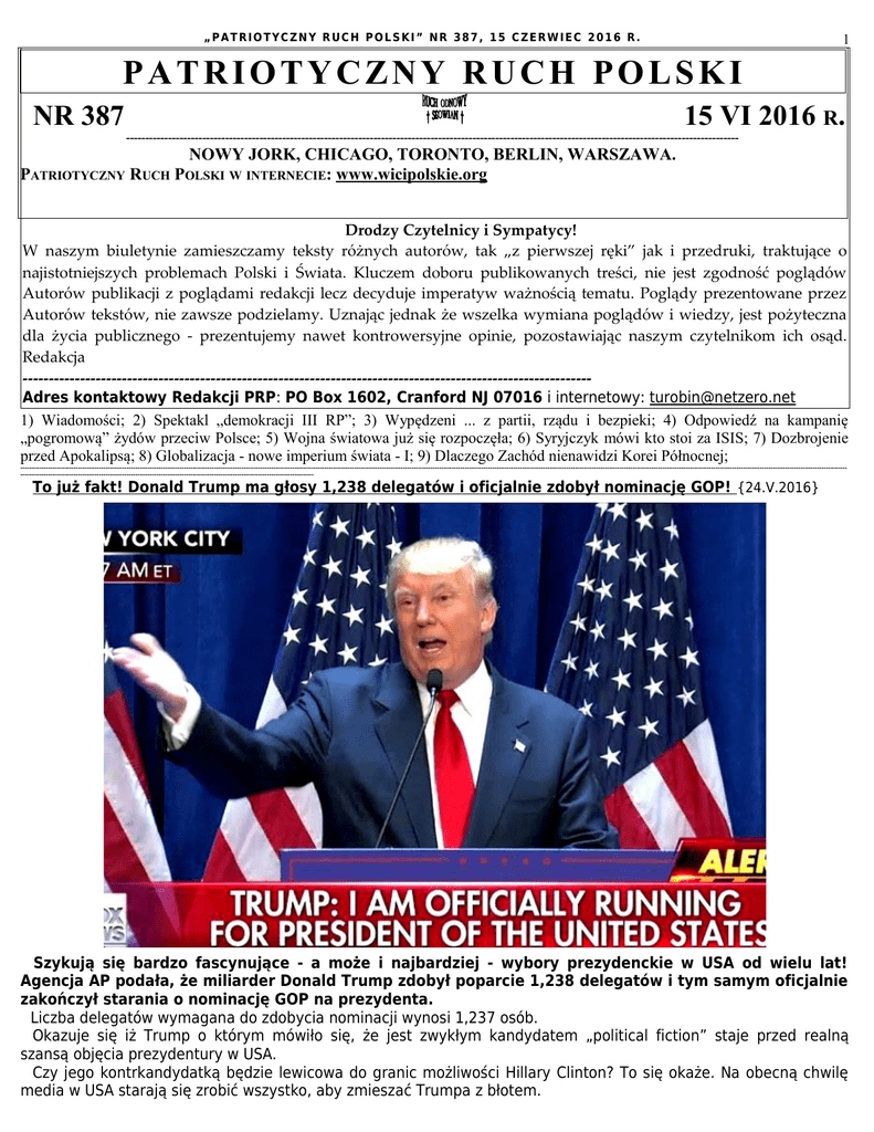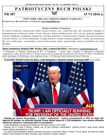 „PATRIOTYCZNY RUCH POLSKI” NR 387, 15 CZERWIEC 2016 R. 1 PATRIOTYCZNY RUCH POLSKI NR 387 15 VI 2016 R. ----------------------------------------------------------------------------------------------------------------------------------------------------------------- NOWY JORK, CHICAGO, TORONTO, BERLIN, WARSZAWA. PATRIOTYCZNY RUCH POLSKI W INTERNECIE: www.wicipolskie.org Drodzy Czytelnicy i Sympatycy! W naszym biuletynie zamieszczamy teksty różnych autorów, tak „z pierwszej ręki” jak i przedruki, traktujące o najistotniejszych problemach Polski i Świata. Kluczem doboru publikowanych treści, nie jest zgodność poglądów Autorów publikacji z poglądami redakcji lecz decyduje imperatyw ważnością tematu. Poglądy prezentowane przez Autorów tekstów, nie zawsze podzielamy. Uznając jednak że wszelka wymiana poglądów i wiedzy, jest pożyteczna dla życia publicznego - prezentujemy nawet kontrowersyjne opinie, pozostawiając naszym czytelnikom ich osąd. Redakcja ------------------------------------------------------------------------------------------------------------Adres kontaktowy Redakcji PRP: PO Box 1602, Cranford NJ 07016 i internetowy: [email protected] 1) Wiadomości; 2) Spektakl „demokracji III RP”; 3) Wypędzeni ... z partii, rządu i bezpieki; 4) Odpowiedź na kampanię „pogromową” żydów przeciw Polsce; 5) Wojna światowa już się rozpoczęła; 6) Syryjczyk mówi kto stoi za ISIS; 7) Dozbrojenie przed Apokalipsą; 8) Globalizacja - nowe imperium świata - I; 9) Dlaczego Zachód nienawidzi Korei Północnej; ---------------------------------------------------------------------------------------------------------------------------------------------------------------------------------------------------------------------------------------------------------------------------------------------------------------------------------------------------------------------------------------------------------------------------------------------------------------------------------------------------------------------------------------------- To już fakt! Donald Trump ma głosy 1,238 delegatów i oficjalnie zdobył nominację GOP! {24.V.2016} Szykują się bardzo fascynujące - a może i najbardziej - wybory prezydenckie w USA od wielu lat! Agencja AP podała, że miliarder Donald Trump zdobył poparcie 1,238 delegatów i tym samym oficjalnie zakończył starania o nominację GOP na prezydenta. Liczba delegatów wymagana do zdobycia nominacji wynosi 1,237 osób. Okazuje się iż Trump o którym mówiło się, że jest zwykłym kandydatem „political fiction” staje przed realną szansą objęcia prezydentury w USA. Czy jego kontrkandydatką będzie lewicowa do granic możliwości Hillary Clinton? To się okaże. Na obecną chwilę media w USA starają się zrobić wszystko, aby zmieszać Trumpa z błotem. 2 „PATRIOTYCZNY RUCH POLSKI” NR 387, 15 CZERWIEC 2016 R. Materiał M.M. Kolonko: https://www.youtube.com/watch?v=QqjO2fOtLMk Źródło: 300polityka.pl Za: http://polskaniepodlegla.pl/kraj-swiat/item/7165-to-juz-fakt-donald-trump-ma-1-238-delegatow-i-oficjalnie-zdobyl-nominacjegop # # # USA: Trump jednak przeciw aborcji? {28.V.2016} Donald Trump zaprezentował listę swoich kandydatów na sędziów Sądu Najwyższego, których chciałby wprowadzić do jego składu, gdyby został prezydentem. Znajdują się na niej sędziowie Raymond Gruender, William Pryor i Diane Sykes. Wszyscy wymienieni zdecydowanie opowiadają się za ochroną życia dzieci poczętych. Trump zapowiedział również wstrzymanie dofinansowania organizacji Planned Parenthood. Jako główny powód podał jej “zaangażowanie w aborcję”. Za: http://xportal.pl/?p=25709 # # # Morze krwi na syryjskim wybrzeżu {26.V.2016} Wspierani przez administrację prezydenta Obamy terroryści w poniedziałek 23 maja dokonali serii skoordynowanych zamachów bombowych, w dwóch leżących na zachodnim wybrzeżu miastach, Tartus i Dżabla. Ustawione w newralgicznych miejscach [dworzec autobusowy i okolice] samochody-pułapki wybuchły rano, gdy dorośli wychodzili do pracy, czy na zakupy, a uczniowie do szkół. W wyniku działań siedmiu terrorystów-”samobójców”: życie straciły 154 osoby [liczba zabitych może jednak wzrosnąć, wiele poszkodowanych osób jest w stanie krytycznym], ciężko rannych odwoziły do szpitali dziesiątki karetek, oprócz tego w akcję ratunkową włączyły się setki zwykłych Syryjczyków i żołnierze z miejscowych garnizonów. Działania ratunkowe jednak również stały się celem ataku: gdy część rannych dowieziono do szpitala Al-Watany w Dżabla, kobietazamachowiec zdetonowała swój ładunek, niszcząc zupełnie izbę przyjęć i zabijając wielu ludzi. Drugi zamachowiec nie zdążył odpalić swego ładunku - został obezwładniony przez personel szpitala i przekazany władzom. Do ataków najpierw przyznała się “umiarkowana” organizacja Ahrar asz-Szam [I], wspierana przez państwa zachodnie i Turcję [II]; później jednak dowództwo grupy wydało stanowcze dementi. Katarska telewizja Al-Dżazira - na podstawie komunikatu Al-Amaq [III] [oficjalnej komórki medialnej ISIS] twierdziła że za zamachami stoi Państwo Islamskie które jednak nie posiada większych wpływów na zachodnim wybrzeżu [natomiast znajduje się tam „syryjska opozycja”, popierana przez Zachód]. Tego samego dnia zamachowców pochwaliła Dżajsz Al-Fatah [inna frakcja dżihadystyczna], grożąc jeszcze gorszymi atakami [IV]. Natychmiast ogłoszono ogólnosyryjską akcję oddawania krwi dla rannych w zamachach, trwa ona nadal. W działania informacyjne włączyli się aktywiści i liczni cudzoziemcy na terenie Syrii; na miejsce tragedii przyjechała także boliwijska aktorka Carla Ortiz [przebywająca wcześniej w Damaszku i okolicach], która pojechała do Syrii by móc naocznie poznać sytuację i włączyć się w działania na rzecz pomocy jej mieszkańcom. Ponieważ, były t