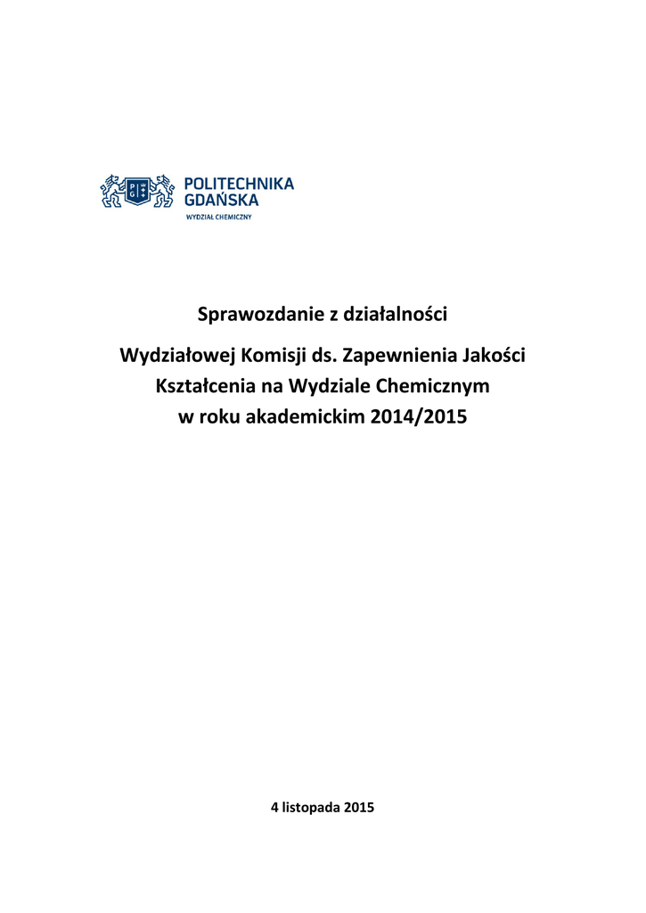 Sprawozdanie z działalności Wydziałowej Komisji ds. Zapewnienia Jakości Kształcenia na Wydziale Chemicznym w roku akademickim 2014/2015 4 listopada 2015 Sprawozdanie z działalności Wydziałowej Komisji ds. Zapewnienia Jakości Kształcenia przy Wydziale Chemicznym w roku akademickim 2014/2015 1. Dokumenty WKZJK/KZJK: 1.1. w stosunku do roku akademickiego 2013/2014 w składzie WKZJK nie nastąpiły zmiany, 1.2. skład osobowy WKZJK w roku akademickim 2014/2015, 1.3. Przewodnicząca: prof. dr hab. Ewa Klugmann-Radziemska Członkowie: o dr hab. inż. Aleksander Herman o prof. dr hab. inż. Helena Janik o dr hab. inż. Stefan Krakowiak o dr hab. inż. Elżbieta Luboch o prof. dr hab. inż. Żaneta Polkowska o dr hab. inż. Paweł Sachadyn Przedstawiciel studentów: Marcin Joachim Grzegorczyk Przedstawiciel doktorantów: mgr inż. Bartłomiej Ferra przedstawiciel interesariuszy zewnętrznych: mgr inż. Mieczysław Broniszewski, Grupa Lotos S.A. harmonogram pracy WKZJK/KZJK w formie zadań w roku akademickim 2014/2015 i informacje o ich realizacji. Lp. Zadanie Odpowiedzialny za wykonanie zadania Termin realizacji zadania Forma realizacji zadania 1. Podsumowanie wykonania zadań z roku akademickiego 2013/2014 w ramach WKZJK: przygotowanie Wydziałowej Księgi Jakości Kształcenia przewodnicząca WKZJK XI 2014 Wydziałowa Księga Jakości Kształcenia 2. Podsumowanie wykonania zadań z roku akademickiego 2013/2014 w ramach WKZJK: przygotowanie sprawozdania rocznego z prac WKZJK; wskazanie działań naprawczych przewodnicząca WKZJK XI 2014 sprawozdania roczne z prac WKZJK 3. analiza liczby zajęć z zakresu projektowania zespołowego przewodnicząca WKZJK, Prodziekan ds. Studiów XI 2014 sprawozdanie przekazane do UKZJK 4. udział w przygotowaniu raportu samooceny kierunku Biotechnologia dla akredytacji KAUT Prodziekan ds. Studiów, członkowie WKZJK XI 2014 dane do raportu Lp. Zadanie Odpowiedzialny za wykonanie zadania Termin realizacji zadania Forma realizacji zadania 5. ocena realizacji zadań strategicznych Wydziału w zakresie obszarów związanych bezpośrednio i pośrednio z jakością kształcenia przewodnicząca WKZJK XII 2014 sprawozdanie przekazane do UKZJK 6. przygotowanie potrzeby stworzenia oferty zajęć z obszaru nauk humanistycznych i społecznych, adresowanej do wszystkich studentów uczelni (bez względu na wydział i studiowany kierunek) przewodnicząca WKZJK XII 2014 potrzeba zmiany przekazana do UKZJK 7. analiza wyników ankiet studenckich WRS, członkowie WKZJK III 2015 zestawienie wyników ankiet 8. doprecyzowanie zakresu obowiązków Pełnomocników Dziekana na Wydziale Dziekan Wydziału, przewodnicząca WKZJK III 2015 sprawozdanie przekazane do UKZJK 9. analiza informacji o ankietyzacji zajęć dydaktycznych na semestrze 7, studia I stopnia, inżynierskie przewodnicząca WKZJK, Prodziekan ds. Studiów V 2015 sprawozdanie przekazane do UKZJK 10. aktualizacja procedury Ochrony Własności Intelektualnej przewodnicząca WKZJK V 2015 procedura 2. Opis działalności WKZJK/KZJK w roku akademickim 2014/2015: 2.1. liczba odbytych zebrań, informacja o formie dokumentowania zebrań, Wydziałowa Komisja ds. Zapewnienia Jakości Kształcenia na Wydziale Chemicznym odbyła 6 zebrań w roku akademickim 2014/2015. Sporządzane są notatki w formie elektronicznej i protokoły zebrań. Korespondencja robocza między poszczególnymi członkami Komisji odbywa się drogą mailową oraz w postaci bezpośrednich rozmów. 2.2. informacja o powołanych zespołach, o prowadzonych działaniach i ich efektach, W skład WKJK wchodzą Zespoły: a. Wydziałowy Zespół ds. Jakości Kształcenia (WZJK) w składzie: prof. dr hab. inż. Helena Janik dr hab. inż. Żaneta Polkowska dr hab. inż. Paweł Sachadyn mgr inż. Mieczysław Broniszewski Marcin Joachim Grzegorczyk b. Wydziałowy Zespół ds. Oceny Jakości Kształcenia (WZOJK) w składzie: dr hab. inż. Aleksander Herman prof. dr hab. Ewa Klugmann-Radziemska dr hab. inż. Stefan Krakowiak dr hab. inż. Elżbieta Luboch mgr inż. Bartłomiej Ferra. Wydziałowy Zespół ds. Jakości Kształcenia wykonał w roku akademickim 2014/2015 zadania: analiza oceny stanu wyjściowego, opracowanie dokumentacji w zakresie zapewnienia jakości kształcenia - poszczególnych procedur i Wydziałowej Księgi Jakości Kształcenia, opiniowanie propozycji zmian w programach kształcenia, z uwzględnieniem potrzeb rynku pracy, wyników monitorowania karier absolwentów oraz zakładanych efektów kształcenia, monitorowanie minimum kadrowego na poszczególnych kierunkach, monitorowanie procesu dyplomowania, monitorowanie rekrutacji na studia I, II i III stopnia, monitorowanie zabezpieczenia infrastruktury dydaktycznej, monitorowanie harmonogramu i organizacji zajęć. Wydziałowy Zespół ds. Oceny Jakości Kształcenia wykonał w roku akademickim 2014/2015 następujące zadania: przeprowadzenie wewnętrznej oceny stanu wyjściowego, przeprowadzenie akcji ankietowania, analiza raportu z uzyskanych wyników badań ankietowych - raport sporządza Prodziekan ds. Studiów we współpracy z WRS, monitorowanie realizacji zgłoszonych w celu poprawy jakości kształcenia na wydziale wniosków, opiniowanie programów kształcenia zgodnie z KRK, opiniowanie metod oceny osiągania założonych efektów kształcenia, monitorowanie kariery zawodowej absolwentów oraz opinii pracodawców w zakresie przygotowania absolwentów do pracy zawodowej, monitorowanie jakości obsługi administracyjnej nauczycieli akademickich, studentów, doktorantów i słuchaczy studiów podyplomowych. 2.3. informacja o zjawiskach niepożądanych i działaniach mających na celu ich wyeliminowanie (wg tabeli na następnej stronie), 2.4. opracowane akty wewnętrzne wydziału/centrum dotyczące jakości kształcenia w roku akademickim 2014/2015, - Księga Jakości Kształcenia na Wydziale Chemicznym - zatwierdzona przez Dziekana Wydziału w dniu 26 stycznia 2015, uaktualniona 20 marca 2015 r. i