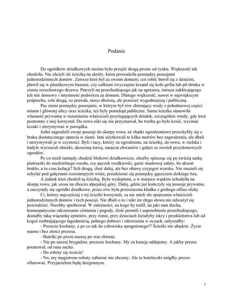 Podanie Do ogródków działkowych można było przejść drogą prosto od rynku. Większość tak chodziła. Nie chcieli iść ścieżką na skróty, która prowadziła pomiędzy posesjami jednorodzinnych domów. Zawsze ktoś był za swoim domem; coś robił, bawił się z dziećmi, pławił się w plastikowym basenie, czy całkiem zwyczajnie krzątał się koło grilla lub pił drinka w cieniu orzechowego drzewa. Patrzyli na przechodzącego jak na agresora, intruza zakłócającego ich mir domowy i intymność podwórza za domem. Dlatego większość, nawet w największym pośpiechu, szła drogą, co prawda, nieco dłuższą, ale przecież wygodniejszą i publiczną. Pas ziemi pomiędzy posesjami, w którym był rów zbierający wody z południowej części miasta i głównej ulicy oraz ścieżka, też były poniekąd publiczne. Sama ścieżka stanowiła własność prywatną w rozumieniu właścicieli przylegających działek, szczególnie wtedy, gdy ktoś postronny z niej korzystał. Do rowu nikt się nie przyznawał, bo trzeba go było kosić, wycinać krzaki i utrzymywać w porządku. Jedni zagrodzili swoje posesje do skarpy rowu, aż słupki ogrodzeniowe przechyliły się z braku dostatecznego oparcia w ziemi. Inni użytkowali te kilka metrów bez zagrodzenia, ale dbali i utrzymywali je w czystości. Byli i tacy, którzy za ogrodzenie, na ścieżkę, do rowu, w zielska i badyle wyrzucali obierki, skoszoną trawę, naręcza chwastów i gałęzi ze swoich przydomowych ogrodów. Po co mieli tamtędy chodzić blokowi działkowicze, choćby spiesząc się po świeżą natkę pietruszki do niedzielnego rosołu, czy pęczek rzodkiewki, garść masłowej sałaty, bo akurat brakło, a tu czas kolacji? Szli drogą, choć dalej, ale bez obawy czyjegoś wzroku. Nie musieli się schylać pod gałęziami rozrośniętych wiśni, przedzierać się pomiędzy gąszczem dzikiego bzu. A jednak ktoś chodził tą ścieżką. Była wydeptana, a w miejscu wąskim schodziła na skarpę rowu, jak szosa na zboczu alpejskiej góry. Dalej, gdzie już kończyły się posesje prywatne, a zaczynały się ogródki działkowe, przez rów była przerzucona kładka z grubego oflisu olchy. Ci, którzy najczęściej z tej ścieżki korzystali, za nic mieli złe spojrzenia właścicieli jednorodzinnych domów i tych posesji. Nie dbali o to i nikt im złego słowa nie odważył się powiedzieć. Niechby spróbował. W zależności, na kogo by trafił, na jaki stan ducha, homeopatyczne odczuwanie ciśnienia i pogody, ilość promili i usposobienie przechodzącego, dostałby taką wiązankę epitetów, przy żonie, przy dzieciach leciałyby iskry i przekleństwa lub od kogoś rozbrajającego łagodnością, pełnego dobroci i zdziwienia w oczach, usłyszałby: - Prezesie kochany, a po co tak do człowieka spragnionego!? Ścieżki nie ubędzie. Życie marne i bez złości prezesa. - Butelki po piwie muszę po was zbierać. - Nie po naszej brygadzie, prezesie kochany. My za kaucję oddajemy. A jakby prezes poratował, od rana sucho. - Do roboty się weźcie! - No, my magistrom roboty zabierać nie chcemy. Ale te buteleczki mógłby prezes ofiarować. Przyjacielem będę dozgonnym. 1 I ośmiał się prezes, czy inny inżynierem nazwany i kilka flaszek po harnasiu przez ogrodzenie mu podał. Może by powiedział przy tym - spieprzaj dziadu - ale taką wdzięczność w oczach obdarowanego zobaczył, że nawet głową kiwnął i jeszcze musiał mu dłoń uścisnąć, bo z życzliwością ją podawał, więc byłby to klasyczny grzech pychy i arogancji. Przez kładkę przechodziło się na wprost działkowych ogródków, ale by drogi nie nadganiać do bramy, w siatce ogrodzenia dziura była wyrwana i stad tylko kilkadziesiąt kroków do drewnianego domku Kierownika W Rzeczy Samej. Domek pomalowany był na brązowo. Farba już miejscami odchodziła, ale konstrukcja trzymała się solidnie. Dach dwuspadowy kryty blachą falistą schodził z przodu nad werandę zagrodzoną płotem pomalowanym na zielono. Domek stał na betonowej podmurówce, jedno miał okienko i jeden był wchód do niego. W dni upalne kompani właściciela domku pili tanie trunki na werandzie. Ale nie była to tylko melina na czas letni, gdzie szli, jak do wodopoju, również w zimie śnieg na ścieżce był udeptany. Podążali gęsiego utartym szlakiem do domku Kierownika W Rzeczy Samej, jak zwierzyna do paśnika pod lasem. Jedzenia wprawdzie nikt im tam nie oferował. Mało jedli, żołądki mieli skurczone, na płyny tylko łase jak szpak na czereśnie. Kierownik W Rzeczy Samej odkąd przestał być kierownikiem w miejscowej cegielni, zaczął ostro pić. Był już w piciu wprawiony i nawykły, bo kto chciał cegłę na kominy kupić, napoleona w Peweksie kupował lub litrową żytniówkę i z nim załatwiał. Tylko tak można było dobrą cegłę kupić, inaczej nawet na asygnatę tylko jakąś popękaną i rozwarstwioną na ścianki działowe. Wprawiony był i biurko miał zapatrzone w trunki peweksowskie, jak dewizowiec, więc picie i później szło mu sprawnie. Chociaż pracy już nie miał, a po alkoholach tylko dwie puste butelki stały na szafie, po koniaku Napoleon Maxime i whisky White Horse (jako trofeum na wspomnienie tych chwil dawnych, lat tłustych i szczęśliwych), pił dalej łapczywie, a po kilku latach już byle co, byle gdzie i z byle kim, i tylko szczęśliwie jakimś cudem wcześniej rentę dostał. Tak się staczał, zaciskały się na nim szpony nałogu. Żona wyganiała go z domu. Nie chciał wyjść. Na kilkudniowe loty mieszkanie opuścił, wtedy zamki zmieniła, a gdy wrócił, całą klatkę schodową w środku nocy obudził. Policja przyjechała. On dokumenty pokazał, że tu jest zameldowany, a mieszkanie z dobytkiem stanowi współwłasność małżeńską. W prawie był, więc wpuścić do mieszkania go musiała i przy policjantach jeszcze klucze do drzwi wejściowych wręczyć, by już po nocy głowy nie zawracał policji i