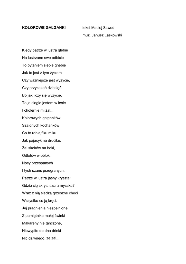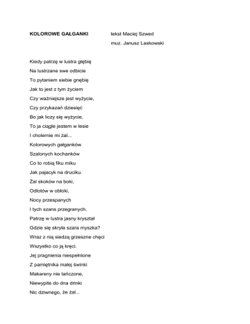 KOLOROWE GAŁGANKI tekst Maciej Szwed muz. Janusz Laskowski Kiedy patrzę w lustra głębię Na lustrzane swe odbicie To pytaniem siebie gnębię Jak to jest z tym Ŝyciem Czy waŜniejsze jest wyŜycie, Czy przykazań dziesięć Bo jak liczy się wyŜycie, To ja ciągle jestem w lesie I cholernie mi Ŝal... Kolorowych gałganków Szalonych kochanków Co to robią fiku miku Jak pajacyk na druciku. śal skoków na boki, Odlotów w obłoki, Nocy przespanych I tych szans przegranych. Patrzę w lustra jasny kryształ Gdzie się skryła szara myszka? Wraz z nią siedzą grzeszne chęci Wszystko co ją kręci. Jej pragnienia niespełnione Z pamiętnika małej świnki Makareny nie tańczone, Niewypite do dna drinki Nic dziwnego, Ŝe Ŝal... śal sesji zdjęciowej W gazecie brukowej Ja w stringach i w toplesie Biust silikon mi podniesie Tu obetnę, tam przyszyję I poczuję, Ŝe fest Ŝyję. Ze smakiem występku I kolczykiem w pępku . śal skoków na boki Odlotów w obłoki I tańca na rurze... Kończę, bo się wkurzę.