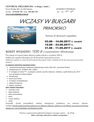 CENTRUM PIELGRZYMA w drogę z nami… Pewel Wielka 485, 34-340 Jeleśnia tel./fax. 33 8 636 736, kom. 784 404 110 www.centrumpielgrzyma.pl GODZINY OTWARCIA: pn. - pt. – 900 - 1300 WCZASY W BUŁGARII PRIMORSKO Terminy 12-dniowych wyjazdów: 03.06 – 14.06.2017 r. ZAJĘTE 12.06 – 23.06.2017 r. 31.08 – 11.09.2017 r. ZAJĘTE KOSZT WYJAZDU: 1230 zł z wyżywieniem i klimatyzacją Przy zapisie na wyjazd należy dokonać wpłaty zaliczki w wysokości 400 zł. Dopłaty do wyjazdu dokonujemy do 30 dni przed rozpoczęciem turnusu. Możliwość wyjazdu na ważny dowód osobisty lub paszport. Dzieci i młodzież do 18 roku życia powinny posiadać paszport. W RAMACH KOSZTÓW GWARANTUJEMY: przejazd komfortowym autokarem (klimatyzacja, barek, DVD, WC, rozsuwane fotele) ubezpieczenie KL 10 000 €, NW 2 000 € 9 noclegów w hotelu***, w pokojach: pościel, ręczniki, telewizor, lodówka, czajnik elektryczny, Wi-Fi oraz sprzątanie w trakcie pobytu klimatyzację basen przy hotelu 9 śniadań i 9 obiadokolacji opłatę klimatyczną opiekę rezydenta PRZY ZAPISIE PODAJEMY: nazwisko i imię datę urodzenia adres zamieszkania pesel numer telefonu email Przypadki chorób przewlekłych radzimy ubezpieczyć dodatkowo we własnym zakresie. Uwaga! Porady medyczne klient pokrywa we własnym zakresie, pobiera za nie fakturę i po powrocie do kraju ubiega się o zwrot pieniędzy od ubezpieczyciela. Prosimy o ograniczenie gabarytów bagażu oraz jego ciężaru - do 25 kg. Biuro zastrzega sobie prawo zmian w programie ! Noclegi w hotelu Malina, który oddalony jest od plaży o ok. 300 m. PROGRAM WYJAZDU: 1 DZIEŃ: POLSKA 815 – Zbiórka na parafialnym parkingu w Pewli Wielkiej, pakowanie bagaży. 830 – Msza Święta. 930 – Wyjazd. 2 DZIEŃ: PRIMORSKO W godzinach rannych przyjazd do Primorska. Zakwaterowanie w hotelu. Czas wolny. 3 – 10 DZIEŃ: PRIMORSKO Plażowanie, wypoczynek, rekreacja. Organizacja czasu we własnym zakresie. 11 DZIEŃ: PRIMORSKO Śniadanie. Czas przeznaczony na plażowanie oraz rekreację. W godzinach popołudniowych wyjazd w kierunku Polski. 12 DZIEŃ: POLSKA Powrót do Polski w godzinach popołudniowych. Na miejscu istnieje możliwość wykupienia wycieczek fakultatywnych: 1) Wyjazd do Burgas oraz Nesebyr – zwiedzanie miast z przewodnikiem oraz czas wolny. W Nesebyr uroczysty obiad (wyjazd w cenie 100 zł). 2) Zwiedzanie Sozopolu połączone z wieczorem bułgarskim, czyli spotkanie z bułgarską muzyką, regionalnymi potrawami, tańcem i bułgarskim winem (wyjazd w cenie 100 zł). W niedzielę możliwość uczestnictwa we Mszy Świętej. !!! W przypadku rezygnacji z uczestnictwa w wyjeździe nie można otrzymać zwrotu wpłaconej gotówki – na swoje miejsce należy znaleźć inną osobę. Organizator zastrzega sobie możliwość zmiany programu, terminu bądź odwołania wyjazdu z przyczyn niezależnych od organizatora, tj. w przypadku braku odpowiedniej liczby uczestników. W sytuacji drastycznych zmian cen paliwa oraz kursu euro cena może ulec zmianie !!! !!! ZAPRASZAMY DO PIELGRZYMOWANIA !!!