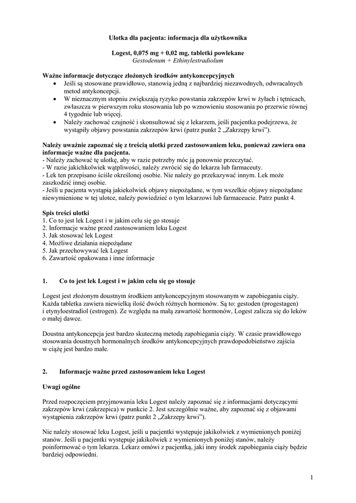 Ulotka dla pacjenta: informacja dla użytkownika Logest, 0,075 mg + 0,02 mg, tabletki powlekane Gestodenum + Ethinylestradiolum Ważne informacje dotyczące złożonych środków antykoncepcyjnych Jeśli są stosowane prawidłowo, stanowią jedną z najbardziej niezawodnych, odwracalnych metod antykoncepcji. W nieznacznym stopniu zwiększają ryzyko powstania zakrzepów krwi w żyłach i tętnicach, zwłaszcza w pierwszym roku stosowania lub po wznowieniu stosowania po przerwie równej 4 tygodnie lub więcej. Należy zachować czujność i skonsultować się z lekarzem, jeśli pacjentka podejrzewa, że wystąpiły objawy powstania zakrzepów krwi (patrz punkt 2 „Zakrzepy krwi”). Należy uważnie zapoznać się z treścią ulotki przed zastosowaniem leku, ponieważ zawiera ona informacje ważne dla pacjenta. - Należy zachować tę ulotkę, aby w razie potrzeby móc ją ponownie przeczytać. - W razie jakichkolwiek wątpliwości, należy zwrócić się do lekarza lub farmaceuty. - Lek ten przepisano ściśle określonej osobie. Nie należy go przekazywać innym. Lek może zaszkodzić innej osobie. - Jeśli u pacjenta wystąpią jakiekolwiek objawy niepożądane, w tym wszelkie objawy niepożądane niewymienione w tej ulotce, należy powiedzieć o tym lekarzowi lub farmaceucie. Patrz punkt 4. Spis treści ulotki 1. Co to jest lek Logest i w jakim celu się go stosuje 2. Informacje ważne przed zastosowaniem leku Logest 3. Jak stosować lek Logest 4. Możliwe działania niepożądane 5. Jak przechowywać lek Logest 6. Zawartość opakowana i inne informacje 1. Co to jest lek Logest i w jakim celu się go stosuje Logest jest złożonym doustnym środkiem antykoncepcyjnym stosowanym w zapobieganiu ciąży. Każda tabletka zawiera niewielką ilość dwóch różnych hormonów. Są to: gestoden (progestagen) i etynyloestradiol (estrogen). Ze względu na małą zawartość hormonów, Logest zalicza się do leków o małej dawce. Doustna antykoncepcja jest bardzo skuteczną metodą zapobiegania ciąży. W czasie prawidłowego stosowania doustnych hormonalnych środków antykoncepcyjnych prawdopodobieństwo zajścia w ciążę jest bardzo małe. 2. Informacje ważne przed zastosowaniem leku Logest Uwagi ogólne Przed rozpoczęciem przyjmowania leku Logest należy zapoznać się z informacjami dotyczącymi zakrzepów krwi (zakrzepica) w punkcie 2. Jest szczególnie ważne, aby zapoznać się z objawami wystąpienia zakrzepów krwi (patrz punkt 2 „Zakrzepy krwi”). Nie należy stosować leku Logest, jeśli u pacjentki występuje jakikolwiek z wymienionych poniżej stanów. Jeśli u pacjentki występuje jakikolwiek z wymienionych poniżej stanów, należy poinformować o tym lekarza. Lekarz omówi z pacjentką, jaki inny środek zapobiegania ciąży będzie bardziej odpowiedni. 1 Lek Logest, podobnie jak inne doustne środki antykoncepcyjne, nie chroni przed zakażeniem wirusem HIV (AIDS) i chorobami przenoszonymi drogą płciową. Kiedy nie stosować leku Logest Nie należy stosować leku Logest, jeśli u pacjentki występuje jakikolwiek z wymienionych poniżej stanów. Jeśli u pacjentki występuje jakikolwiek z wymienionych poniżej stanów, należy poinformować o tym lekarza. Lekarz omówi z pacjentką, jaki inny środek zapobiegania ciąży będzie bardziej odpowiedni. Kiedy nie stosować leku Logest: jeżeli występuje nadwrażliwość na etynyloestradiol lub gestoden bądź którykolwiek ze składników leku Logest; jeśli u pacjentki obecnie występuje (lub kiedykolwiek występował) zakrzep krwi w naczyniach żylnych nóg (zakrzepica żył głębokich), w płucach (zatorowość płucna) lub w innych organach; jeśli pacjentka wie, że ma zaburzenia wpływające na krzepliwość krwi - na przykład niedobór białka C, niedobór białka S, niedobór antytrombiny III, obecność czynnika V Leiden lub przeciwciał antyfosfolipidowych; jeśli pacjentka wymaga zabiegu chirurgicznego lub nie będzie chodziła przez długi czas (patrz punkt „Zakrzepy krwi”. jeśli pacjentka przeszła zawał mięśnia sercowego lub udar; jeśli pacjentka choruje (lub chorowała w przeszłości) na dusznicę bolesną (choroba, która powoduje silny ból w klatce piersiowej i może być pierwszym objawem zawału mięśnia sercowego) lub przemijający napad niedokrwienny (przemijające objawy udaru); jeśli pacjentka choruje na jakąkolwiek z poniższych chorób, które mogą zwiększać ryzyko powstania zakrzepu w tętnicy: – ciężka cukrzyca z uszkodzeniem naczyń krwionośnych – bardzo wysokie ciśnienie krwi; – bardzo wysokie stężenie tłuszczów we krwi (cholesterolu lub triglicerydów). – chorobę nazywaną hiperhomocysteinemią jeśli u pacjentki występuje (lub występował w przeszłości) rodzaj migreny nazywany „migreną z aurą”; jeżeli w przeszłości występowało lub obecnie występuje zapalenie trzustki ze zwiększonym stężeniem triglicerydów (tłuszczów) we krwi; jeżeli w przeszłości występowała lub obecnie występuje ciężka choroba wątroby (do momentu powrotu wyników prób czynnościowych wątroby do prawidłowych wartości); jeżeli w przeszłości występowały lub obecnie występują łagodne bądź złośliwe nowotwory wątroby; jeżeli stwierdzono obecnie lub w przeszłości nowotwór hormonozależny (nowotwór piersi lub narządów płciowych); jeżeli występują krwawienia z dróg rodnych, których przyczyny nie ustalono; jeżeli stwierdzono ciążę lub podejrzewa się ciążę. Ostrzeżenia i środki ostrożności Przed rozpoczęciem stosowania leku Logest należy omówić to z lekarzem lub farmaceutą. Kiedy należy skontaktować się z lekarzem? Należy natychmiast zgłosić się do lekarza - jeśli pacjentka zauważy prawdopodobne objawy wystąpienia zakrzepów krwi, co może wskazywać na to, że pacjentka ma zakrzepy krwi w nodze (zakrzepica żył głębokich), zakrzepy krwi w płucach (zatorowość płucna), zawał mięśnia sercowego lub udar (