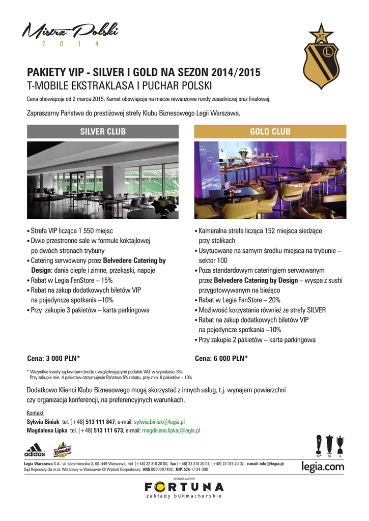 PAKIETY VIP - SILVER I GOLD NA SEZON 2014/ 2015 T-MOBILE EKSTRAKLASA I PUCHAR POLSKI Cena obowiązuje od 2 marca 2015. Karnet obowiązuje na mecze rewanżowe rundy zasadniczej oraz finałowej. Zapraszamy Państwa do prestiżowej strefy Klubu Biznesowego Legii Warszawa. SILVER CLUB GOLD CLUB Strefa VIP licząca 1 550 miejsc Dwie przestronne sale w formule koktajlowej po dwóch stronach trybuny Catering serwowany przez Belvedere Catering by Design: dania ciepłe i zimne, przekąski, napoje Rabat w Legia FanStore – 15% Rabat na zakup dodatkowych biletów VIP na pojedyncze spotkania –10% Przy zakupie 3 pakietów – karta parkingowa Kameralna strefa licząca 152 miejsca siedzące przy stolikach Usytuowane na samym środku miejsca na trybunie – sektor 100 Poza standardowym cateringiem serwowanym przez Belvedere Catering by Design – wyspa z sushi przygotowywanym na bieżąco Rabat w Legia FanStore – 20% Możliwość korzystania również ze strefy SILVER Rabat na zakup dodatkowych biletów VIP na pojedyncze spotkania –10% Przy zakupie 2 pakietów – karta parkingowa Cena: 3 000 PLN* Cena: 6 000 PLN* * Wszystkie kwoty są kwotami brutto uwzględniającymi podatek VAT w wysokości 8%. Przy zakupie min. 4 pakietów otrzymujecie Państwo 5% rabatu, przy min. 8 pakietów – 10% Dodatkowo Klienci Klubu Biznesowego mogą skorzystać z innych usług, t.j. wynajem powierzchni czy organizacja konferencji, na preferencyjnych warunkach. Kontakt Sylwia Biniak tel. [+48] 513 111 847, e-mail: [email protected] Magdalena Lipka tel. [+48] 513 111 673, e-mail: [email protected] Legia Warszawa S.A. ul. Łazienkowska 3, 00-449 Warszawa, tel. [+48] 22 318 20 00, fax [+48] 22 318 20 01, [+48] 22 318 20 02, e-mail: [email protected] Sąd Rejonowy dla m.st. Warszawy w Warszawie XII Wydział Gospodarczy; KRS 0000097402; NIP: 526-17-24-308 SPONSOR GŁÓWNY