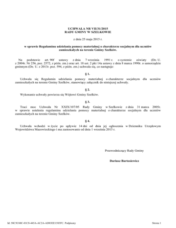 UCHWAŁA NR VII/31/2015 RADY GMINY W SZELKOWIE z dnia 25 maja 2015 r. w sprawie Regulaminu udzielania pomocy materialnej o charakterze socjalnym dla uczniów zamieszkałych na terenie Gminy Szelków. Na podstawie art. 90f ustawy z dnia 7 września 1991 r. o systemie oświaty (Dz. U. z 2004r. Nr 256, poz. 2572, z późn. zm.) oraz art. 18 ust. 2 pkt 14a ustawy z dnia 8 marca 1990r. o samorządzie gminnym (Dz. U. z 2013r. poz. 594, z późn. zm.) uchwala się, co następuje: § 1. Uchwala się Regulamin udzielania pomocy materialnej o charakterze socjalnym dla uczniów zamieszkałych na terenie Gminy Szelków, stanowiący załącznik do niniejszej uchwały. § 2. Wykonanie uchwały powierza się Wójtowi Gminy Szelków. § 3. Traci moc Uchwała Nr XXIX/107/05 Rady Gminy w Szelkowie z dnia 31 marca 2005r. w sprawie ustalenia regulaminu udzielania pomocy materialnej o charakterze socjalnym dla uczniów zamieszkałych na terenie Gminy Szelków. § 4. Uchwała wchodzi w życie po upływie 14 dni od dnia jej ogłoszenia w Dzienniku Urzędowym Województwa Mazowieckiego i ma zastosowanie od dnia 1 września 2015 r. Przewodniczący Rady Gminy Dariusz Bartosiewicz Id: 58C5C60C-01C8-445A-AC2A-AD83EE1583FC. Podpisany Strona 1 Załącznik do Uchwały Nr VII/31/2015 Rady Gminy w Szelkowie z dnia 25 maja 2015r. Regulamin udzielania pomocy materialnej o charakterze socjalnym dla uczniów zamieszkałych na terenie Gminy Szelków Rozdział 1 Postanowienia ogólne § 1. Niniejszy Regulamin określa zasady, formy i tryb udzielania pomocy materialnej o charakterze socjalnym uczniom zamieszkałym na terenie Gminy Szelków. § 2. Pomoc materialna udzielana jest w celu zmniejszenia różnic w dostępie do edukacji i wyrównywania szans edukacyjnych wśród dzieci i młodzieży. § 3. Pomoc materialna o charakterze socjalnym przysługuje uczniom, wychowankom i słuchaczom szkół wymienionych w art. 90b ust. 3 i ust. 4 ustawy z dnia 7 września 1991 roku o systemie oświaty (Dz. U. z 2004 r. Nr 256, poz. 2572, z późn. zm.). § 4. Świadczeniami pomocy materialnej o charakterze socjalnym są: 1) stypendium szkolne, 2) zasiłek szkolny. Rozdział 2 Sposób ustalania wysokości stypendium szkolnego § 5. 1. Stypendium szkolne może otrzymać uczeń znajdujący się w trudnej sytuacji materialnej, wynikającej z niskich dochodów na osobę w rodzinie, w szczególności gdy w rodzinie tej występuje: bezrobocie, niepełnosprawność, ciężka lub długotrwała choroba, wielodzietność, brak umiejętności wypełniania funkcji opiekuńczo-wychowawczych, alkoholizm lub narkomania, a także gdy rodzina jest niepełna lub wystąpiło zdarzenie losowe, z zastrzeżeniem ust. 3. 2. Miesięczna wysokość dochodów na osobę w rodzinie ucznia uprawnionego do ubiegania się o stypendium szkolne nie może być większe niż kwota, o której mowa w art. 8 ust. 1 Id: 58C5C60C-01C8-445A-AC2A-AD83EE1583FC. Podpisany Strona 2 pkt 2 ustawy z dnia 12 marca 2004r. o pomocy społecznej (Dz. U. z 2013r., poz. 182, z późn. zm.). 3. Uczeń, który otrzymuje inne stypendium o charakterze socjalnym ze środków publicznych, może otrzymać stypendium szkolne w wysokości, która łącznie z innym stypendium o charakterze socjalnym ze środków publicznych nie przekracza w okresie roku szkolnego dwudziestokrotności kwoty, o której mowa w art. 6 ust. 2 pkt 2 ustawy z dnia 28 listopada 2003r. o świadczeniach rodzinnych (Dz. U. z 2006r., Nr 139, poz. 992, z późn. zm.), a w przypadku słuchaczy kolegiów nauczycielskich, nauczycielskich kolegiów języków obcych i kolegiów pracowników służb społecznych – osiemnastokrotności kwoty, o której mowa powyżej. 4. Wnioskodawca określa we wniosku okoliczności, o których mowa w ust. 1. § 6. 1. Maksymalna wysokość stypendium szkolnego nie może przekraczać miesięcznie kwoty stanowiącej dwukrotność kwoty, o której mowa w art. 6 ust.2 pkt 2 ustawy z dnia 28 listopada 2003r. o świadczeniach rodzinnych (Dz. U. z 2015 poz.114). 2. Stypendium szkolne miesięczne nie może być niższe niż 80% kwoty, o której mowa w art. 6 ust.2 pkt 2 ustawy z dnia 28 listopada 2003r. o świadczeniach rodzinnych (Dz. U. z 2015 poz.114). Rozdział 3 Formy udzielania stypendium szkolnego w zależności od potrzeb uczniów § 7. 1. Stypendium szkolne może być udzielone uczniowi szkoły, o której mowa w art. 90 b ust. 3 i ust. 4 ustawy z dnia 7 września 1991 r. o systemie oświaty, zamieszkałemu na terenie Gminy Szelków, w formie: 1) całkowitego lub częściowego pokrycia kosztów udziału w zajęciach edukacyjnych, w tym wyrównawczych, wykraczających poza zajęcia realizowane w szkole w ramach planu nauczania, a także udziału w zajęciach edukacyjnych realizowanych poza szkołą; w szczególności w zajęciach rozwijających uzdolnienia artystyczne i sportowe uczniów; zajęciach nauki języków obcych oraz innych przedsięwzięciach realizowanych przez szkołę jak: wyjazdy do teatru, wycieczki szkolne i inne; 2) pomocy rzeczowej o charakterze edukacyjnym, w tym przede wszystkim na zakup: podręczników, lektur szkolnych, encyklopedii, słowników i innych książek pomocniczych do realizacji procesu dydaktycznego, przyborów i pomocy szkolnych, plecaków, stroju na zajęcia wychowania fizycznego oraz innego wyposażenia uczniów wymaganego obligatoryjnie przez szkołę; 3) całkowitego lub częściowego pokrycia kosztów związanych z pobieraniem nauki poza miejscem zamieszkania, w tym opłat za bursę lub internat i kosztów dojazdu z miejsca zamieszkania do szkoły – uczniom szkół ponadgimnazjalnych oraz słuchaczom kolegiów nauczycielskich, nauczycielskich kolegiów języków obcych i kolegiów pracowników służb społecznych; 4) stypendium może być także udzielone w formie świadczenia pieniężnego, w przypadkach określonych w art. 90d ust. 5 ustawy z dnia 7 września 1991r. o systemie oświaty. 2. Stypendium może być udzielone w jednej lub kilku formach jednocześni