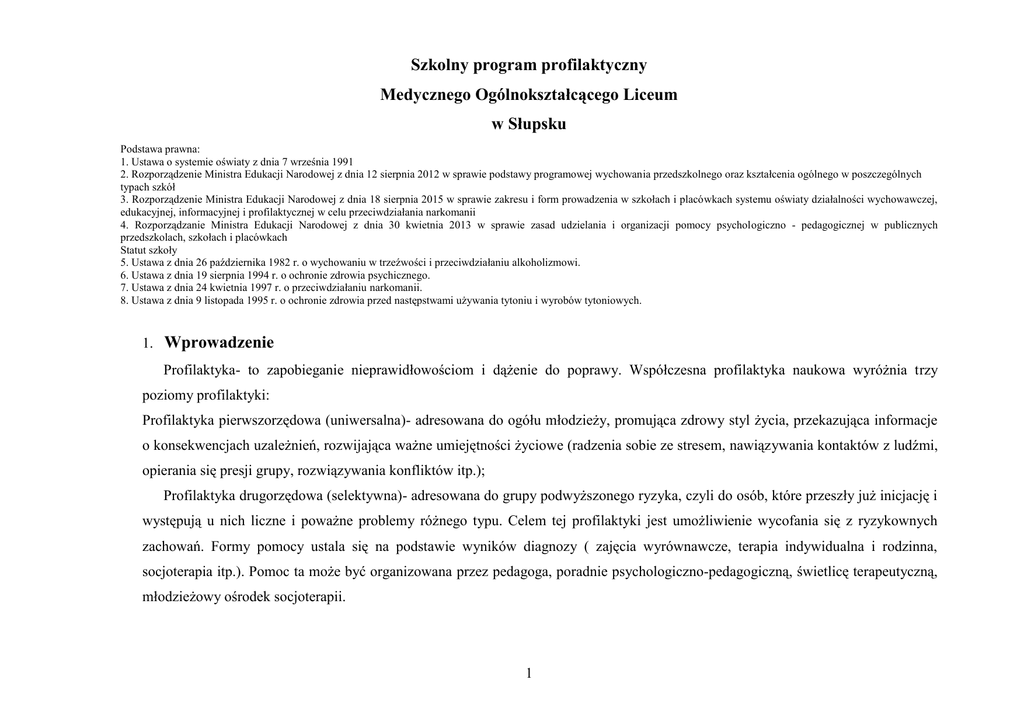 Szkolny program profilaktyczny Medycznego Ogólnokształcącego Liceum w Słupsku Podstawa prawna: 1. Ustawa o systemie oświaty z dnia 7 września 1991 2. Rozporządzenie Ministra Edukacji Narodowej z dnia 12 sierpnia 2012 w sprawie podstawy programowej wychowania przedszkolnego oraz kształcenia ogólnego w poszczególnych typach szkół 3. Rozporządzenie Ministra Edukacji Narodowej z dnia 18 sierpnia 2015 w sprawie zakresu i form prowadzenia w szkołach i placówkach systemu oświaty działalności wychowawczej, edukacyjnej, informacyjnej i profilaktycznej w celu przeciwdziałania narkomanii 4. Rozporządzanie Ministra Edukacji Narodowej z dnia 30 kwietnia 2013 w sprawie zasad udzielania i organizacji pomocy psychologiczno - pedagogicznej w publicznych przedszkolach, szkołach i placówkach Statut szkoły 5. Ustawa z dnia 26 października 1982 r. o wychowaniu w trzeźwości i przeciwdziałaniu alkoholizmowi. 6. Ustawa z dnia 19 sierpnia 1994 r. o ochronie zdrowia psychicznego. 7. Ustawa z dnia 24 kwietnia 1997 r. o przeciwdziałaniu narkomanii. 8. Ustawa z dnia 9 listopada 1995 r. o ochronie zdrowia przed następstwami używania tytoniu i wyrobów tytoniowych. 1. Wprowadzenie Profilaktyka- to zapobieganie nieprawidłowościom i dążenie do poprawy. Współczesna profilaktyka naukowa wyróżnia trzy poziomy profilaktyki: Profilaktyka pierwszorzędowa (uniwersalna)- adresowana do ogółu młodzieży, promująca zdrowy styl życia, przekazująca informacje o konsekwencjach uzależnień, rozwijająca ważne umiejętności życiowe (radzenia sobie ze stresem, nawiązywania kontaktów z ludźmi, opierania się presji grupy, rozwiązywania konfliktów itp.); Profilaktyka drugorzędowa (selektywna)- adresowana do grupy podwyższonego ryzyka, czyli do osób, które przeszły już inicjację i występują u nich liczne i poważne problemy różnego typu. Celem tej profilaktyki jest umożliwienie wycofania się z ryzykownych zachowań. Formy pomocy ustala się na podstawie wyników diagnozy ( zajęcia wyrównawcze, terapia indywidualna i rodzinna, socjoterapia itp.). Pomoc ta może być organizowana przez pedagoga, poradnie psychologiczno-pedagogiczną, świetlicę terapeutyczną, młodzieżowy ośrodek socjoterapii. 1 Profilaktyka trzeciorzędowa (wskazująca)- skierowana do osób z grup wysokiego ryzyka(uzależnionych), które ponoszą już poważne konsekwencje swoich zachowań. Jej celem jest ograniczenie głębokości i czasu trwania zaburzeń, a także zmniejszenia szkód związanych z ich ryzykownym trybem życia. Podejmowane działania (odtrucie, leczenie odwykowe, psychoterapia, rehabilitacja, resocjalizacja) organizowane są nie przez szkoły czy poradnie oświatowe, lecz przez wyspecjalizowane placówki.1 2. Cele i zadania szkolnego programu profilaktycznego. Cel programu, przygotowanego przez zespół wychowawczy po konsultacjach z rodzicami, uczniami i radą pedagogiczną, najogólniej sformułować można jako ”przygotowanie do życia w społeczeństwie”. Oznacza to, mówiąc bardziej szczegółowo, umiejętność samodzielnego zaspokajania swoich potrzeb (zarówno tych najprostszych jak i tych rozwojowych), w sposób respektujący prawa innych członków społeczności, a także umiejętności współpracy z innymi dla osiągania celów wspólnych. Chodzi także o niezbędny poziom orientacji w otaczającej młodego człowieka rzeczywistości, co wyrażać się powinno zarówno zdolnością do osiągania społecznie akceptowanych celów jak też wystarczającym poziomem zadowolenia z życia i z samego siebie. Także umiejętności radzenia sobie z emocjami (zwłaszcza emocjami negatywnymi), uznano za ważny przedmiot zainteresowania wychowawców. Cała współczesna patologia społeczna- nadużywanie alkoholu, narkotyków, przestępczość itd. wyrasta z pierwotnych trudności w radzeniu sobie z emocjami. I zgodnie z tymi spostrzeżeniami terapeutyczne postępowanie w powyższych przypadkach polega nie, na czym innym, jak na żmudnej nauce pokonywania owych emocjonalnych trudności. To samo źródło maja trudności i niepowodzenia szkolne. W większości przypadków to nie intelekt a emocje (stosunek do nauki, nauczycieli, kolegów i siebie samego) wymagają uporządkowania, aby można było na powrót zacząć radzić sobie z nauką. To właśnie negatywne emocje w pierwszej kolejności skłaniają ludzi, w tym także dzieci, do sięgania po substancje psychoaktywne (alkohol, narkotyki, papierosy, środki uspokajające, używki), bo one zmieniają nastrój na lepszy, rozluźniają, uspokajają. Ale rozluźnienia i uspokojenia potrzebuje ktoś, kto jest napięty i niespokojny. Gdyby umiał sobie radzić ze 1 Ministerstwo Edukacji Narodowej o pomocy psychologiczno-pedagogicznej, Biblioteczka reformy, Warszawa 2001r. 2 swoim napięciem czy niepokojem, nie musiałby sięgać po środki chemiczne. Albo uciekać z sytuacji budzących zagrożenie: unikać niektórych ludzi, wagarować, porzucać rozpoczęte działania, szukać azylu w grupach nieformalnych. Jeśli wiec chcemy odpowiedzieć na pytanie, co to znaczy ”umieć sobie radzić z negatywnymi emocjami”, to odpowiedź brzmi: posiadać dobre pomysły na to jak się zachować, gdy pojawi się trudna sytuacja i oczywiście umieć te pomysły naprawdę zastosować. Z kolei pomagać ludziom w tym, aby lepiej radzili sobie z negatywnymi emocjami to tyle, co doskonalić ich umiejętności społeczne, dzięki czemu będą oni radzić sobie z tych kontaktach z innymi ludźmi, które dotąd były dla nich zbyt trudne, w których nie potrafili poradzić sobie tak, aby byli z siebie zadowoleni. Chodzi, zatem po pierwsze o to, aby być świadomym własnych emocji we wszystkich ważnych momentach życia. Aby, dalej, być świadomym, jakimi zachowaniami te emocje są wyzwalane. Aby umieć podejmować świadome decyzje, jak w tej sytuacji chce zareagować. I aby, na koniec, naprawdę tak zareagować. Przedmiotem zainteresowania powinny