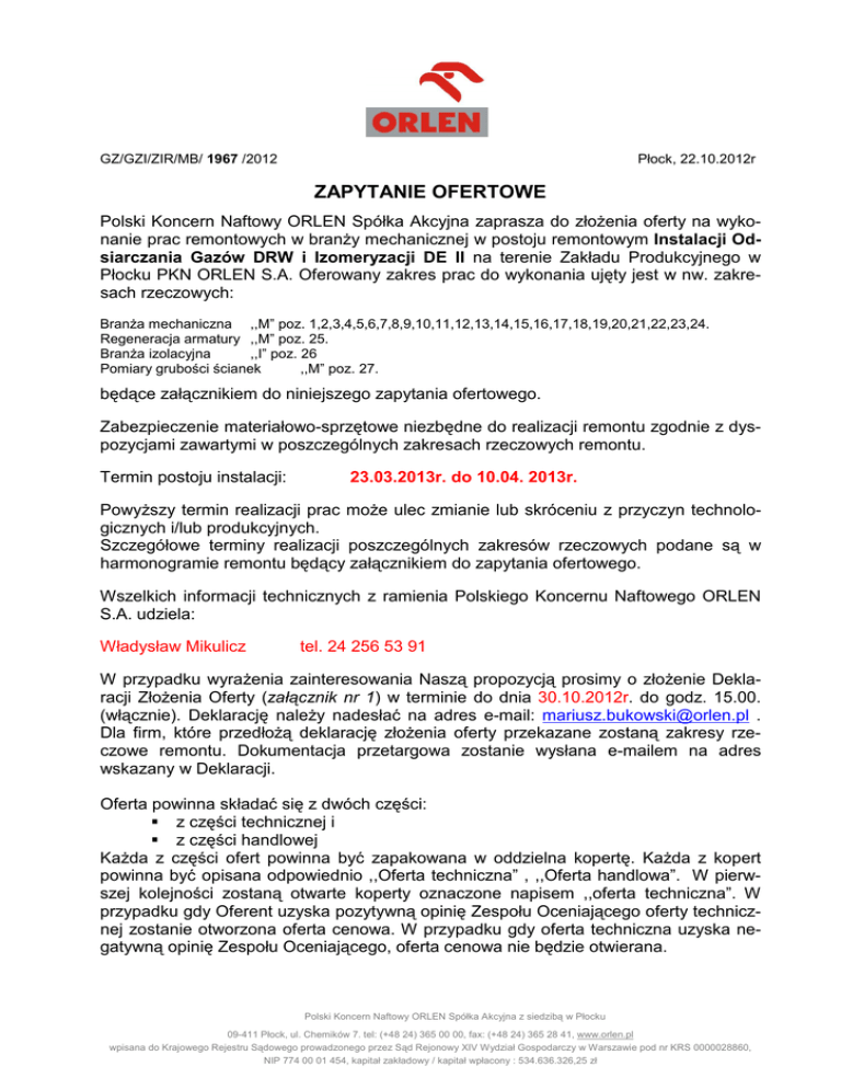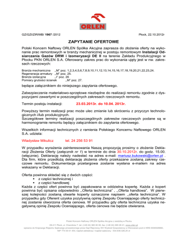 GZ/GZI/ZIR/MB/ 1967 /2012 Płock, 22.10.2012r ZAPYTANIE OFERTOWE Polski Koncern Naftowy ORLEN Spółka Akcyjna zaprasza do złoŜenia oferty na wykonanie prac remontowych w branŜy mechanicznej w postoju remontowym Instalacji Odsiarczania Gazów DRW i Izomeryzacji DE II na terenie Zakładu Produkcyjnego w Płocku PKN ORLEN S.A. Oferowany zakres prac do wykonania ujęty jest w nw. zakresach rzeczowych: BranŜa mechaniczna ,,M” poz. 1,2,3,4,5,6,7,8,9,10,11,12,13,14,15,16,17,18,19,20,21,22,23,24. Regeneracja armatury ,,M” poz. 25. BranŜa izolacyjna ,,I” poz. 26 Pomiary grubości ścianek ,,M” poz. 27. będące załącznikiem do niniejszego zapytania ofertowego. Zabezpieczenie materiałowo-sprzętowe niezbędne do realizacji remontu zgodnie z dyspozycjami zawartymi w poszczególnych zakresach rzeczowych remontu. Termin postoju instalacji: 23.03.2013r. do 10.04. 2013r. PowyŜszy termin realizacji prac moŜe ulec zmianie lub skróceniu z przyczyn technologicznych i/lub produkcyjnych. Szczegółowe terminy realizacji poszczególnych zakresów rzeczowych podane są w harmonogramie remontu będący załącznikiem do zapytania ofertowego. Wszelkich informacji technicznych z ramienia Polskiego Koncernu Naftowego ORLEN S.A. udziela: Władysław Mikulicz tel. 24 256 53 91 W przypadku wyraŜenia zainteresowania Naszą propozycją prosimy o złoŜenie Deklaracji ZłoŜenia Oferty (załącznik nr 1) w terminie do dnia 30.10.2012r. do godz. 15.00. (włącznie). Deklarację naleŜy nadesłać na adres e-mail: [email protected] . Dla firm, które przedłoŜą deklarację złoŜenia oferty przekazane zostaną zakresy rzeczowe remontu. Dokumentacja przetargowa zostanie wysłana e-mailem na adres wskazany w Deklaracji. Oferta powinna składać się z dwóch części: z części technicznej i z części handlowej KaŜda z części ofert powinna być zapakowana w oddzielna kopertę. KaŜda z kopert powinna być opisana odpowiednio ,,Oferta techniczna” , ,,Oferta handlowa”. W pierwszej kolejności zostaną otwarte koperty oznaczone napisem ,,oferta techniczna”. W przypadku gdy Oferent uzyska pozytywną opinię Zespołu Oceniającego oferty technicznej zostanie otworzona oferta cenowa. W przypadku gdy oferta techniczna uzyska negatywną opinię Zespołu Oceniającego, oferta cenowa nie będzie otwierana. Polski Koncern Naftowy ORLEN Spółka Akcyjna z siedzibą w Płocku 09-411 Płock, ul. Chemików 7. tel: (+48 24) 365 00 00, fax: (+48 24) 365 28 41, www.orlen.pl wpisana do Krajowego Rejestru Sądowego prowadzonego przez Sąd Rejonowy XIV Wydział Gospodarczy w Warszawie pod nr KRS 0000028860, NIP 774 00 01 454, kapitał zakładowy / kapitał wpłacony : 534.636.326,25 zł Ofertę na wykonanie powyŜszych prac prosimy przesłać w zamkniętych kopertach na adres: Polski Koncern Naftowy ORLEN S.A. Biuro Zakupów Mariusz Bukowski Ul. Chemików 7 09-411 Płock Na kopercie naleŜy podać nazwę, dokładny adres Oferenta oraz numer zapytania ofertowego. Ofertę naleŜy złoŜyć do dnia 06.11.2012r do godziny 20.00. Otwarcie ofert nastąpi bez udziału Oferentów. Otwarcia ofert oraz ich oceny dokona Zespół Oceniający ze strony PKN ORLEN S.A. I. Oferta techniczna powinna zawierać. 1. Referencje lub listę wykonywanych prac remontowych o takim samym charakterze zrealizowanych przez Oferenta w zakładach rafineryjnych, petrochemicznych lub chemicznych z ostatnich 5 lat. Wykaz musi zawierać datę wykonania prac, zleceniodawcę (nazwę instalacji), zakres wykonanych prac. W przypadku świadczenia tego typu usług dla PKN ORLEN S.A. dopuszcza się dostarczenie numerów umów (nazwę instalacji, zakres prac jaki był wykonywany) jakie zostały zawarte z Oferentem na prace, które zostały wykonane zgodnie z zapisami umowy. W przypadku braku referencji i/lub listy wykonywanych prac o takim samym charakterze oferta Oferenta nie będzie rozpatrywana. 2. Kopię Certyfikatu wdroŜonego u Oferenta Systemu Zarządzania Bezpieczeństwa i Higieną Pracy. Oferty nie posiadające ww. certyfikatu nie będą rozpatrywane. PowyŜsze wymagania dotyczą równieŜ podwykonawców wskazanych w ofercie Oferenta. 3. Oświadczenie, Ŝe firma realizować będzie prace we własnym zakresie lub przy udziale podwykonawców. W przypadku podzlecania prac naleŜy podać, nazwę firmy oraz załączyć oświadczenie podpisane przez podwykonawcę, Ŝe podejmie się wykonania podzlecanych prac i będzie je wykonywała zgodnie z Certyfikatami ISO 9001, ISO 14001 i SZBiHP. Podwykonawca musi spełniać wymagania co do posiadania Certyfikatu SZBiHP. Zaproponowany Podwykonawca musi uzyskać pozytywną opinię Zespołu Oceniającego Zamawiającego i zostać dopuszczony jako podwykonawca podzlecanego zakresu prac. 4. W przypadku podzlecania prac naleŜy załączyć referencje lub listę wykonywanych prac podwykonawcy. 5. Oświadczenie, Ŝe Wykonawca przyjmuje na siebie pełną odpowiedzialność za pracowników podwykonawcy (w przypadku ewentualnego podzlecania). 6. Oświadczenie, Ŝe Oferent zapoznał się i akceptuje zapisy PROJEKTU umowy, który oferent otrzymał wraz z pozostałą dokumentacją po złoŜeniu Deklaracji ZłoŜenia Oferty. 7. Oświadczenie Oferenta, Ŝe prace będą prowadzone zgodnie z Certyfikatami SZBiHP, ISO 14001 i ISO 9001. 8. Oświadczenie, Ŝe Oferent wykona przedmiotowe prace własnym sprzętem. NaleŜy załączyć wykaz sprzętu jaki będzie uŜywany do realizacji przedmiotowych prac. W przypadku wynajmu sprzętu naleŜy załączyć oświadczenie od firmy, od której będzie on wynajmowany, Ŝe zostanie on Oferentowi udostępniony w okresie trwania przedmiotowych prac. 9. Stosowną decyzję zatwierdzającą program gospodarki odpadami wytwarzanymi w wyniku świadczenia usług. Decyzja powinna zostać wydana przez Marszałka Województwa właściwego ze względu na siedzibę firmy. PowyŜsze dotyczy równieŜ podwykonawców wskazanych w ofercie. 10. Oświadczenie Oferenta, Ŝe do realizacji prac zatrudnieni zostan