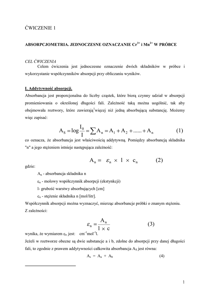 ĆWICZENIE 1 ABSORPCJOMETRIA. JEDNOCZESNE OZNACZANIE Cr3+ i Mn2+ W PRÓBCE CEL ĆWICZENIA Celem ćwiczenia jest jednoczesne oznaczenie dwóch składników w próbce i wykorzystanie współczynników absorpcji przy obliczaniu wyników. I. Addytywność absorpcji. Absorbancja jest proporcjonalna do liczby cząstek, które biorą czynny udział w absorpcji promieniowania o określonej długości fali. Zależność taką można uogólnić, tak aby obejmowała roztwory, które zawierają1więcej niż jedną absorbującą substancję. Możemy więc zapisać: AS log I0 I An A1 A2 ...... A n (1) co oznacza, że absorbancja jest właściwością addytywną. Pomiędzy absorbancją składnika "n" a jego stężeniem istnieje następująca zależność: An n l cn (2) gdzie: An - absorbancja składnika n n - molowy współczynnik absorpcji (ekstynkcji) l- grubość warstwy absorbujących [cm] cn - stężenie składnika n [mol/litr]. Współczynnik absorpcji można wyznaczyć, mierząc absorbancje próbki o znanym stężeniu. Z zależności: An n wynika, że wymiarem n jest: l cm-1mol-1l. c (3) Jeżeli w roztworze obecne są dwie substancje a i b, zdolne do absorpcji przy danej długości fali, to zgodnie z prawem addytywności całkowita absorbancja AS jest równa: As = Aa + Ab (4) 1 Jeżeli pomiar AS przeprowadzimy przy dwóch różnych długościach fali 1 i 2 , to możemy zapisać: (przy pierwszej długości fali) As1 = Aa1 + Ab1 (przy drugiej długości fali) As2 = Aa2 + Ab2 (5) (6) gdzie: Aa1 = a1 l ca Ab1 = b1 l cb Aa2 = a2 l ca Ab2 = b2 l cb a1 , a2 - współczynnik absorpcji substancji "a" przy długościach fal 1 i 2, b1 , b2 - współczynnik absorpcji substancji "b" przy długościach fal 1 i 2, ca,, cb - stężenie molowe substancji a i b. Równania (5) i (6) możemy zapisać następująco: As1 = a1 l ca + b1 l cb (7) As2 = a2 l ca + b2 l cb (8) Znaczenia symboli przedstawiono graficznie na Rys.1 A As1 As2 Ab2 Aa1 Ab1 Aa2 1 2 Rys. 1. Dwuskładnikowa analiza spektrofotometryczna (przykład hipotetyczny). Krzywa S (linia czarna) –widmo rejestrowane dla mieszaniny a + b, krzywa a (linia szara) –widmo składnika a, krzywa b (linia ciemno szara) - widmo składnika b. 2 Rozwiązując układ równań (7) i (8) otrzymujemy: ca cb b2 l b2 a1 - A s1 b1 a2 a1 l b2 a1 - A s2 b1 a2 b1 l b2 a1 - b1 b2 a1 - b1 (9) A s1 (10) a2 a2 l A s2 a2 Tak więc, jeśli wyznaczymy współczynniki absorpcji dla składników a i b przy długościach fal 1 i 2 z powyższych równań, otrzymujemy stężenia substancji a i b w mieszaninie, dla której zmierzono wartości absorbancji As1 i As2. SPOSÓB WYKONANIA ĆWICZENIA 1. Uwagi ogólne. Chrom i mangan w próbkach stali można oznaczać równocześnie po utlenieniu do dwuchromianu i nadmanganianu. Próbkę stałą rozpuszcza się w kwasie, dodaje się kwasu fosforowego dla związania w kompleks żelaza i dodaje się kilka kropli roztworu azotanu srebra jako katalizatora reakcji utlenienia. Dla utleniania chromu i dużej części manganu dodaje się nadsiarczanu potasu. Dodatek małej ilości nadjodanu potasu i ogrzanie roztworu zapewnia całkowite utlenianie manganu. Absorbancję roztworu mierzy się za pomocą spektrofotometru przy długościach fal, przy których występują maksima absorpcji dla chromu i dla manganu (zwykle około 440 i 545 nm). 2. Przepis wykonania. W ćwiczeniu należy oznaczyć zawartość chromu (III) i manganu (II) w roztworze, który nie zawiera innych kationów. Otrzymany do analizy roztwór w kolbce X, zawierający jony Cr3+ i Mn2+ rozcieńczyć wodą do kreski. Do trzech kolb stożkowych pojemności 250 ml dodać kolejno: do pierwszej - 5 ml roztworu wzorcowego Mn(II) + 20 ml wody, do drugiej - 5 ml roztworu wzorcowego Cr(III) + 20 ml wody, do trzeciej - 25 ml roztworu X. Do każdej z kolb dodać po 10 ml stężonego kwasu siarkowego osiem kropli 0,5M azotanu srebrowego oraz 50 ml wody. Dodać 5,0 g nadsiarczanu potasowy, potrząsnąć kolbę do momentu rozpuszczenia większości soli, następnie podgrzewać aż do wrzenia. Gotować roztwór jeszcze przez ok. 5 min., oziębić powoli i dodać 0,5 g nadjodanu potasowego. Ogrzać ponownie i utrzymywać w temperaturze wrzenia przez dalsze 5 min. Oziębić przelać do kolby o pojemności 100 ml i dopełnić do kreski wodą. Próbki tak przygotowanych roztworów 3 wzorcowych nalać do kuwety o grubości warstwy 1 cm i zarejestrować widmo w zakresie długości fal od 400 do 570 nm, mierząc absorpcję co 2 nm. Wykreślić widmo obu wzorców na wspólnym wykresie i odczytać długości fal, przy których występuje maksimum dla chromu i manganu. Przy tych długościach fal oznaczyć absorbancję roztworu X, rejestrując dodatkowo widmo w zakresie od 400 do 570 nm, we wszystkich pomiarach należy stosować wodę jako odnośnik. OPRACOWANIE WYNIKÓW 1. Wartości absorbancji przedstawić w tabeli: AMn ACr AMn+Cr AX 2. Na wspólnym wykresie przedstawić widmo wzorców oraz roztworu X. Dla porównania, na tym samym wykresie przedstawić również widmo sumy wzorców (korzystając z prawa addytywności absorbancji). 3. Podać wartość max, a więc długości fal, przy których występuje maksimum dla roztworów wzorcowych chromu i manganu. Dla tych długości fal wyznaczyć współczynniki absorpcji (równanie 3) chromu i manganu (dla Mn, dla maxMn maxCr - współczynniki Cr i - również współczynniki dla Cr i Mn). 4. Znając wartości współczynników absorpcji obliczyć i podać wartości liczbowe występujące przed wartościami As1 i As2 w równaniach (9 i 10). 5. Wyznaczyć stężenia cMn i cCr z równań (9) i (10), wstawiając wartości As1 i As2 dla długości fal maxCr i maxMn. 6. Przeliczyć uzyskane wyniki w mol/l na masę chromu i manganu w otrzymanej próbce X, uwzględniając przeprowadzone w czasie analizy rozcieńczenie roztworu. 7. Podać równanie reakcji, które przeprowadzono przy wykonywaniu ćwiczenia. Aktualizacja 1 X 2014r. 4