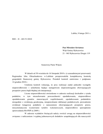 Lublin, 8 lutego 2011 r. RIO – II – 601/51/2010 Pan Mirosław Kwiatosz Wójt Gminy Rybczewice 21 - 065 Rybczewice Drugie 119 Szanowny Panie Wójcie W dniach od 30 września do 16 listopada 2010 r. (z uzasadnionymi przerwami) Regionalna Izba Obrachunkowa w Lublinie przeprowadziła kompleksową kontrolę gospodarki finansowej gminy Rybczewice. Protokół kontroli omówiono i podpisano 14 grudnia 2010 r. Ustalenia kontroli wskazują, że przy realizacji zadań jednostki wystąpiły nieprawidłowości i uchybienia będące następstwem nieprzestrzegania obowiązujących przepisów prawa bądź błędnej ich interpretacji. Liczne nieprawidłowości stwierdzono w zakresie realizacji dochodów z tytułu podatków, w tym niezachowanie powszechności opodatkowania, nieprawidłowe opodatkowanie gruntów stanowiących współwłasność, opodatkowanie podatników niezgodnie z ewidencją geodezyjną, niesprawdzanie deklaracji podatkowych, prowadzenie ewidencji księgowej podatków z naruszeniem obowiązujących przepisów prawa, niesystematyczne wystawianie tytułów wykonawczych, nieprawidłowe sporządzenie sprawozdania Rb-PDP za 2009 r. W zakresie wydatków bieżących należy zwrócić uwagę na nieprawidłowości związane z naliczeniem i wypłatą jednorazowych dodatków uzupełniających dla nauczycieli 2 za 2009 r., skutkujące naliczeniem i wypłatą tych dodatków nauczycielom stażystom i kontraktowym w niewłaściwej kwocie. Kontrola postępowań o udzielenie zamówień publicznych wykazała, przypadki udzielenia zamówień wykonawcom wybranym niezgodnie z przepisami ustawy Prawo zamówień publicznych. Zaniepokojenie budzi ujawnienie nieprawidłowości, będących przedmiotem wniosków pokontrolnych o nr 3.1., 3.2., 4.1., 4.10., 4.21, 4.23. i 5.7. zawartych w wystąpieniu Nr RIO – II – 60/9/2007 z 20 czerwca 2007 r., mimo udzielenia odpowiedzi o ich wykonaniu. W odniesieniu do nieprawidłowości wyeliminowanych w trakcie kontroli – po udzieleniu przez kontrolujących stosownego instruktażu lub o incydentalnym charakterze – nie formułowano wniosków pokontrolnych. Poniżej podaję stwierdzone nieprawidłowości i uchybienia oraz wnioski co do sposobu ich wyeliminowania, stosownie do przepisów art. 9 ust. 2 ustawy z dnia 7 października 1992 r. o regionalnych izbach obrachunkowych (Dz. U. z 2001 r. Nr 55, poz. 577 z późn. zm.). W załączniku do wystąpienia pokontrolnego wskazuję osoby odpowiedzialne za stwierdzone nieprawidłowości. 1. W zakresie księgowości i sprawozdawczości: 1.1. Niekompletne opracowanie dokumentacji opisującej przyjęte zasady (politykę) rachunkowości, polegające na: - nieokreśleniu wersji stosowanego oprogramowania komputerowego i daty rozpoczęcia jego eksploatacji, - nieopisaniu działania opcji, służącej do obliczania skutków obniżenia górnych stawek w podatku rolnym, leśnym i od nieruchomości oraz od środków transportowych od osób fizycznych i osób prawnych oraz jednostek organizacyjnych nieposiadających osobowości prawnej, stanowiących podstawę sporządzenia sprawozdania Rb–PDP. Uzupełnić dokumentację opisującą przyjęte zasady (politykę) rachunkowości, przez: - określenie wersji stosowanego oprogramowania komputerowego i daty rozpoczęcia jego eksploatacji, - opisanie działania opcji służącej do obliczania skutków obniżenia górnych stawek w podatku rolnym, leśnym i od nieruchomości oraz od środków transportowych od osób fizycznych i osób prawnych oraz jednostek organizacyjnych nieposiadających osobowości prawnej, stanowiących podstawę sporządzenia sprawozdania Rb–PDP 3 „Roczne sprawozdanie z wykonania dochodów podatkowych gminy”, stosownie do przepisów art. 10 ust. 1 pkt 3 lit. c ustawy z dnia 29 września 1994 r. o rachunkowości (Dz. U. z 2009 r. Nr 152, poz. 1223 z późn. zm.). Bieżące aktualizowanie dokumentacji opisującej przyjęte zasady (politykę) rachunkowości należy do obowiązków kierownika jednostki, zgodnie z przepisami art. 10 ust. 2 tej ustawy – str. 5, 17, 28, 29 protokołu. 1.2. Ewidencjonowanie operacji gospodarczych na koncie nieujętym w wykazie kont księgi głównej Urzędu Gminy. Zapisów operacji gospodarczych występujących w jednostce dokonywać na kontach przewidzianych do stosowania w zakładowym planie kont, w związku z przepisami art. 10 ust. 1 pkt 3 lit. a ustawy o rachunkowości. Jeżeli zamieszczona w zakładowym planie kont liczba kont syntetycznych jest niewystarczająca w stosunku do potrzeb prowadzenia prawidłowej ewidencji – uzupełnić zakładowy plan kont o konta dodatkowe, zgodne co do treści ekonomicznej, w tym również przy wykorzystaniu symboli kont, które nie mają zastosowania w jednostce, zgodnie z przepisami § 15 ust. 1 pkt 1 rozporządzenia Ministra Finansów z dnia 5 lipca 2010 r. w sprawie szczególnych zasad rachunkowości oraz planów kont dla budżetu państwa, budżetów jednostek samorządu terytorialnego, jednostek budżetowych, samorządowych zakładów budżetowych, państwowych funduszy celowych oraz państwowych jednostek budżetowych mających siedzibę poza granicami Rzeczypospolitej Polskiej (Dz. U. Nr 128, poz. 861), zwanego w dalszej części tego wystąpienia „rozporządzeniem Ministra Finansów z dnia 5 lipca 2010 r.” – str. 5 protokołu. 1.3. Wprowadzeniu w 2010 r. sald początkowych niektórych kont księgi głównej w kwotach niezgodnych z saldami wykazanymi na tych kontach na dzień zamknięcia ksiąg rachunkowych roku 2009. Wykazane w księgach rachunkowych na dzień ich zamknięcia stany aktywów i pasywów ujmować w tej samej wysokości, w otwartych na następny rok obrotowy księgach rachunkowych, stosownie do przepisów art. 5 ust. 1 ustawy o rachunkowości. Na kontach rozrachunkowych wykazywać salda zobowiązań i należności zgodnie z ich rzeczywistym stanem, nie dokonując wzajemnych kompensat, zgodnie z zasadami ich funkcjonowania, określonymi w załącznikach Nr 2 i 3 do ro