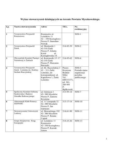 Wykaz stowarzyszeń działających na terenie Powiatu Myszkowskiego. Lp. Nazwa stowarzyszenia 1 Towarzystwo Przyjaciół Rzeniszowa 2 3 4 Adres Rzeniszów ul. Leśników 11 42 – 350 Koziegłowy Prezes P. Stanisław Nowak Towarzystwo Przyjaciół ul. Moniuszki 1 Żarek 42-310 Żarki Prezes P. Jolanta Koral ul. Koziegłowska 14 Obywatelski Komitet Pamięci ul. Kościuszki 15 /17 Narodowej w Żarkach 42-310 Żarki Prezes P. Hieronim Borzęcki Towarzystwo Przyjaciół ul. Hr. Raczyńskiej 3 Żarek –Letniska im. Hrabiny 42 – 311 Żarki Stefanii Raczyńskiej Letnisko, do korespondencji: ul. Kąpielowa 1, Żarki Letnisko 5 Społeczny Komitet Ochrony Środowiska i Budowy Ośrodka Rekreacyjnego 6 Abstynencki Klub Pomocy JEDNOŚĆ 7 Stowarzyszenie Uniwersytet Ludowy 8 Grupa Inicjatywna –Krąg Europejski ul. Górnicza 1 42- 300 Myszków Prezes P. Zamora Krystyna ul. 11 Listopada 32 42- 300 Myszków Prezes P. Jan Garncarz ul. Słowackiego 192 42- 300 Myszków Prezes P. Renata Cupiał ul. Leśników 11 Rzeniszów 42- 350 Koziegłowy Prezes P. Kurzak Zenon TEL. Nr. ewidencyjny 5050-1 314-85-59 5050-2 314-85-62 5050-4 Prezes Krystyna BodnarMiler Tel. 608153371, tel. 501266-481 P. Będkowski 313-95-14 5050-5 Posiada status organizacji pożytku publicznego 313-17-14 5050-10 314-61-90 5050-11 314-25-26 5050-13 5050-7 1 9 Towarzystwo Folklorystyczne ul. Sikorskiego 18/13 313-11-45 JURAJSKIE IGRASZKI 42- 300 Myszków 10 Stowarzyszenie na Rzecz Gazyfikacji Dzielnicy MRZYGŁÓD 11 Unia Lokalna Wzajemna Pomoc Mieszkaniowa 12 13 14 15 16 17 Żareckie Towarzystwo Kulturalno –Społeczne CARLINA Stowarzyszenie Osiedlowe PODLAS Prezes P. Marek Lipski ul. Paderewskiego 68 42- 300 Myszków Przewodniczący P. Ryszard Burski ul. Graniczna 18/1 42- 300 Myszków Prezes P. Kudryś Zenon ul. Prusa 82 42- 300 Myszków Prezes – Anita Garncarz Powiatowe Zrzeszenie ul. Wolności 83 Ludowych Zespołów 42- 300 Myszków Sportowych Prezes P. Wójcik Leszek Związek Żołnierzy AK ul. Kościuszki 26 Jurajski Oddział Myszków 42- 300 Myszków Prezes P. Bereszko Roman ul. Częstochowska 70 42-310 Żarki Polskie Stowarzyszenie Ludzi ul. Sikorskiego 55B Cierpiących na Padaczkę , 42- 300 Myszków Zarząd Okręgowy Myszków Prezes P. Barbara Cesarz- Motyl Stowarzyszenie Mieszkańców ul. Wyzwolenia 58 DOM LUDOWY w Będuszu 42- 300 Myszków Przewodniczący P. Alfred Konopka ul. Batalionów Chłopskich 108, Myszków Stowarzyszenie Taksówkowe ul. Spółdzielcza TAXI-MAX 14/16 42- 300 Myszków P. Matyja Adam Prezes Stowarzyszenie Pomocy ul. Piłsudskiego 43 Ludziom Starszym w 42-360 Poraj Poraju – zlikwidowane przez Sąd 5050-14 325-56-37, 5050-17 322-03-04 605-826120 5050-18 Tel 600 446 971, e-mail podlasmyszków@wp. pl 5050-20 313-51-71 5050-21 314-80-66 5050-23 313-21-67 5050-24 5050-79 313-10-05 5050-82 2 19 20 21 22 Stowarzyszenie Społeczne „ Zdrowie dla Wszystkich” w Myszkowie ul. Żarecka 28 42 –350 Koziegłowy Prezes P. Leonard Jagoda Stowarzyszenie Promocji ul. Pułaskiego 7 Rodziny i Wspierania Osób 42-300 Myszków Starszych „OPOKA” Prezes P. Zofia Chwalba Stowarzyszenie Rozwoju Wsi ul. Sportowa 11 Masłońskie Masłońskie 42-360 Poraj Stowarzyszenie dla Rozwoju Gminy Koziegłowy 23 Jurajskie Stowarzyszenie Nauczycieli Twórczych 24 Stowarzyszenie „Pomocna Dłoń” w Żarkach 25 Stowarzyszenie na rzecz rozwoju wsi Markowice 26 Stowarzyszenie na rzecz rozwoju wsi Winowno 27 Stowarzyszenie Rozwoju i Wspomagania Wsi Wysoka Lelowska 28 29 ul.Wolności 29 Tel. 315-8242-300 Myszków 00 Prezes P. Ewa Pietras 5050-86 posiada status organizacji pożytku publicznego 314-12-68, 314-14-90, 5050-88 315-75-05 5050-89 Tel.314-53-49 5050-90 Prezes – Piotr Posiada Ma-rkiewicz status organizacji pożytku publiczneg o 5050-91 ul. Kościuszki 30 42-300 Myszków Prezes P. Anna Wiśniewska ul. Steinkellera 5 314-85-48 42 – 310 Żarki Prezes P.Przemysław Jankowski ul. Górska 55 Markowice 42-350 Koziegłowy Prezes P. Szczęsny Mirosław Winowo, ul. Szkolna 1 42-350 Koziegłowy Wysoka Lelowska ul. Częstochowska 95 42-310 Żarki Prezes Małgorzata Kucharska Stowarzyszenie Pomocy Ul. 1-go Maja 86 Tel. 313-02Dzieciom „ Bona Dea” 42-300 Myszków 53, Prezes Rynkiewicz 606-836-393 Artur Stowarzyszenie Społeczno – Ul. Moniuszki 14/25 Kulturalne Sołtysów Gminy i 42-350 Koziegłowy Miasta Koziegłowy Założyciel Jerzy Niedbała 5050 – 92 Dn. 22.05.2007r uzyskało status org. pożytku publicznego 5050 - 93 5050-94 5050-96 5050-97 5050-98 3 30 Stowarzyszenie „ Przyszłość” ul. Wolności 15 31 Stowarzyszenie „ Twój pierwszy krok” 32 Stowarzyszenie „ Nasza Wieś” w Siedlcu Dużym 33 Porajskie Stowarzyszenie Integracji Społecznej – Stowarzyszenie Abstynenckie „ FENIKS” Stowarzyszenie Pomocy dzieciom „ ASPERA” w Poraju Stowarzyszenie „ Złote Serce” w Myszkowie 34 35 5050-99 42 –300 Myszków Założyciel: Andrzej Hutnik ul. Spółdzielcza 6A/2 42-300 Myszków Założyciel: Artur Woś ul. Jana Pawła 8 Tel. 314-1142 –350 Siedlec Duży 82 Prezes: Czesław Chwist ul. Górnicza 21 42 – 360 Poraj 5050-100 5050 - 101 5050 - 102 ul. Piłsudskiego 14 42 – 360 Poraj tel. 314-55-48, 5050 - 103 889946638 ul. Wapienna 27 42 – 300 Myszków tel. 313-96-31 502-593-233, Prezes Piotr Czyż tel. 3136869 Przewodniczą cy -Andrzej Skowron Prezes Urszula Szewczyk Prezes Kot Jerzy 36 Chrześcijańskie ul. Wolności 83 Stowarzyszenie Dobroczynne, 42 – 300 Myszków Oddział Terenowy w Myszkowie 37 Stowarzyszenie Rozwoju Wsi Dąbrowno 97 Dąbrowno „Oświata” 42 – 320 Niegowa 38 Stowarzyszenie Na Rzecz Rozwoju Wsi Jaworznik Jaworznik ul. Szkolna 35 tel. 034 314 93 12 ul. Wolności 29 42 – 300 Myszków 39 Stowarzyszenie „Amazonki” w Myszkowie 40 Stowarzyszenie Absolwentów 42 – 310 Żarki i Przyjaciół Zespołu Szkół im. ul. Myszkowska 50 T. Kościuszki w Żarkach tel. 314-80-24 41 Stowarzyszenie Wsi Wysoka Lelowska 42 Stowarzyszenie dla Pińczyc Przewodniczaca Zarządu – Wanda Kowals