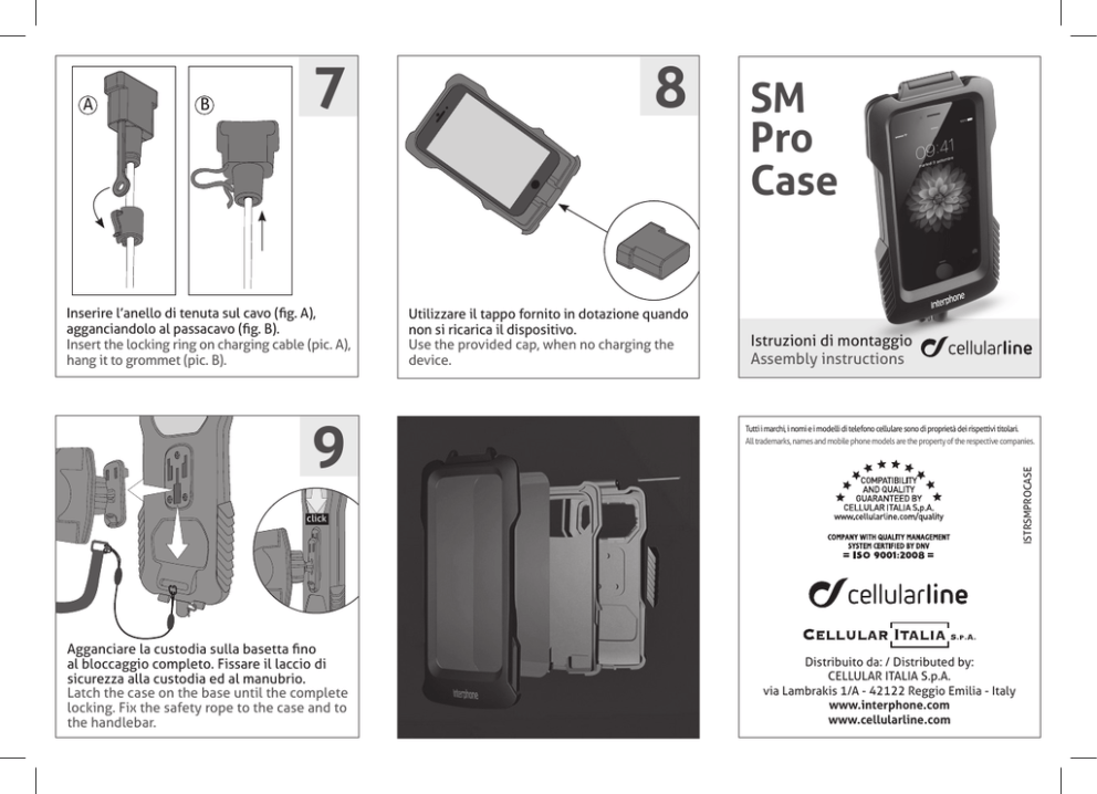 8 Inserire l’anello di tenuta sul cavo (fig. A), agganciandolo al passacavo (fig. B). Insert the locking ring on charging cable (pic. A), hang it to grommet (pic. B). Utilizzare il tappo fornito in dotazione quando non si ricarica il dispositivo. Use the provided cap, when no charging the device. B 9 SM Pro Case Istruzioni di montaggio Assembly instructions Tutti i marchi, i nomi e i modelli di telefono cellulare sono di proprietà dei rispettivi titolari. All trademarks, names and mobile phone models are the property of the respective companies. ISTRSMPROCASE 7 A click Agganciare la custodia sulla basetta fino al bloccaggio completo. Fissare il laccio di sicurezza alla custodia ed al manubrio. Latch the case on the base until the complete locking. Fix the safety rope to the case and to the handlebar. Distribuito da: / Distributed by: CELLULAR ITALIA S.p.A. via Lambrakis 1/A - 42122 Reggio Emilia - Italy www.interphone.com www.cellularline.com 1 Sistema di montaggio. Avvitare al tubolare del manubrio. Mounting system. Screw it onto the handlebar. 4 Dopo aver collegato il cavo di ricarica nel telefono, inserire il passacavo attraverso l’apertura laterale. Connect charging wire to phone and fit the grommet through the side cut. 3 2 Regolare l’inclinazione della basetta e serrare la ghiera per bloccare. Adjust the tilt of the base and tighten the collar to lock. Inserire il supporto in silicone nella custodia rigida. Insert the silicone tray into the hard case. 5 Inserire il dispositivo insieme al cavo nella custodia rigida. Insert the device with charging cable into hard case. 6 Serrare i ganci di tenuta. Tighten the fastening hooks.