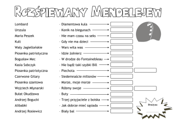 Lombard – Diamentowa kula Urszula – Konik na biegunach Maria Peszek – Nie mam czasu na seks Kult – Gdy nie ma dzieci Wały Jagiellońskie – Wars wita was Piosenka patriotyczna – Idzie żołnierz Bogusław Mec – W drodze do Fontainebleau Kasia Sobczyk – Nie bądź taki szybki Bill Piosenka patriotyczna – Piechota Czerwone Gitary – Siedemnaście milionów Piosenka szantowa – Morze, moje morze Wojciech Młynarski – Róbmy swoje Bułat Okudżawa – Buty Andrzej Bogucki – Trzej przyjaciele z boiska Alibabki – Jak dobrze mieć sąsiada Andrzej Rosiewicz – Biały bal Drużyna Drużyna …………… ……………