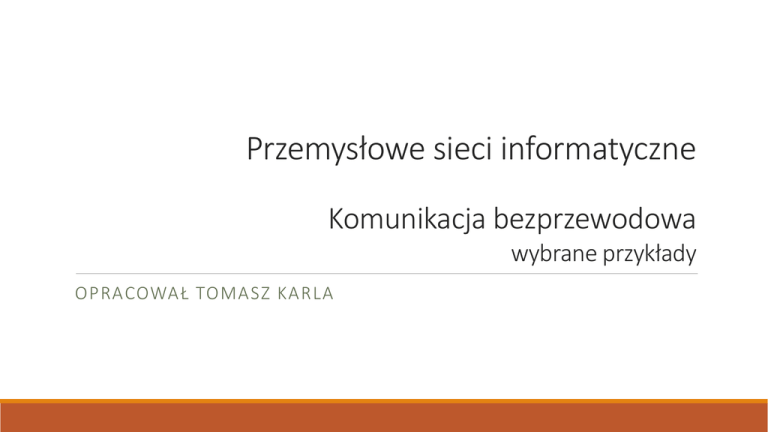 Przemysłowe sieci informatyczne Komunikacja bezprzewodowa wybrane przykłady OPRACOWAŁ TOMASZ KARLA Różne technologie bezprzewodowe - Bluetooth - WiFi - ZigBee - modemy GSM - modemy radiowe Wybrane urządzenia SATEL SATELLINE-EASy Częstotliwość pracy : 330 ... 420 MHz Interfejsy: Port1: RS-232 fixed Port2: LVTTL, TTL or RS-232 / 422 Prędkość transmisji: Radio 19200 / RS 38400 bps Wybrane urządzenia SATEL SATELLAR-2DS Częstotliwość pracy : 360 ... 485 MHz Interfejsy: Ethernet, RS-232 Prędkość transmisji: Radio 38400 bps / RS 57600 bps Dodatkowe cechy: - modularność (możliwość rozszerzenia o moduły GSM czy GPS) - szyfrowanie transmisji, firewall Wybrane urządzenia Moxa OnCell G3150 Częstotliwość pracy : GSM/GPRS/EDGE850/900/1800/1900-MHz Interfejsy: Ethernet, RS-232, RS-422, RS-485 Prędkość transmisji: Edge 237 Kbps DL 237 Kbps UL, GPRS 85.6 Kbps DL, 43 Kbps UL Dodatkowe cechy: - możliwość tunelowania danych za pomocą SMSów - 2 wejścia cyfrowe, 1 przekaźnik Wybrane urządzenia Moxa W406 Częstotliwość pracy : GSM/GPRS/EDGE-850/900/1800/1900-MHz CPU: EP9302 ARM9 32-bit RISC CPU, 200 MHz OS: WinCE 6.0/Embedded Linux with MMU, v. 2.6.23 Interfejsy: Ethernet, RS-232, RS-422, RS-485 Prędkość transmisji: Edge 237 Kbps DL 237 Kbps UL, GPRS 85.6 Kbps DL, 43 Kbps UL Dodatkowe cechy: - możliwość tworzenia prostych algorytmów do obsługi wejść/wyjść cyfrowych i komunikacji, - obsługa USB i kart pamięci, - 4 wejścia cyfrowe, 4 przekaźniki, sygnalizacja diodami LED Przykład laboratoryjny: obiekt P2 P3 P4 Zbiornik 2 (ZB2) Zbiornik 3 (ZB3) Zbiornik 4 (ZB4) P1 Zbiornik 1 (ZB1) Z2 Z1 Z12 Z13 Z14 Z21 Z23 Z4 Z3 Z24 Z31 Z32 Z34 Z41 Z42 Z43 ZBx – zbiornik Px – pompa Zx – zawór główny Zxy – zawór przelewowy Przykład laboratoryjny: obiekt Obiekt składa się z 4 zbiorników (ZBx). Każdy zbiornik posiada połączenia z trzema pozostałymi zbiornikami poprzez jeden zawór główny (Zx) oraz znajdujące się za nim zawory przelewowe (Zxy). Do każdego zbiornika podłączona jest pompa (Px). Układ jest zamknięty, nie posiada dodatkowych dopływów ani odpływów. Aby mógł nastąpić dopływ cieczy do zbiornika, musi być aktywna jego pompa oraz otwarte zawory z innych zbiorników, które pozwolą na przepływ cieczy z nich do zbiornika docelowego. Sterowanie poziomami wody polega na regulacji przepływu między zbiornikami za pomocą otwierania/zamykania zaworów oraz włączania/wyłączania pomp (0 jako zawór zamknięty/pompa wyłączona lub 1 jako zawór otwarty/pompa włączona). Gdy wszystkie zawory są otwarte i wszystkie pompy pracują, suma odpływów i dopływów się zeruje w każdym ze zbiorników, co powoduje utrzymanie stałego poziomu cieczy w zbiornikach. Przykład laboratoryjny: układ sterowania Układ składający się z 5 stacji: Struktura komunikacyjna: -1 stacja zawierająca obiekt sterowania Obiekt -4 stacje regulatorów Komunikacja między stacjami z wykorzystaniem technologii bezprzewodowych w dwóch wariantach: Regulator ZB1 Regulator ZB2 Regulator ZB3 -komunikacja radiowa, -tunelowanie SMS Pomiary poziomu wody w zbiornikach Sterowania zaworami/pompą Regulator ZB4 Przykład laboratoryjny: cechy wybranych technologii bezprzewodowych RADIOMODEMY MODEMY GSM Z TUNELOWANIEM SMS - natychmiastowa transmisja, - długi czas dochodzenia SMS (typowo od 10 do 20 sekund), - duża częstotliwość wysyłania kolejnych pakietów, - bardzo łatwo o kolizję sygnałów na danym paśmie transmisyjnym, - duży zasięg, - wszystkie urządzenia muszą obsługiwać jedno wybrane pasmo, - ograniczona częstotliwość wysyłania kolejnych pakietów, - niemal gwarantowane dostarczenie wiadomości, - możliwość docierania pakietów w nieprawidłowej kolejności, - bardzo duży zasięg, wiele częstotliwości - możliwość obsługi przez zwykły telefon komórkowy Przykład laboratoryjny: wybrane problemy i rozwiązania RADIOMODEMY MODEMY GSM Z TUNELOWANIEM SMS - kolizja na paśmie: - odbiór SMSów w złej kolejności: ◦ Opracowanie mechanizmu unikania kolizji (przekazywanie tokena, stałe okna czasowe transmisji, master-slave) - rozpoznawanie jednostki nadawczej: ◦ Dodatkowa identyfikacja pakietów, opracowanie wymaganej struktury przesyłanych danych ◦ Dobranie czasu wysyłania kolejnych pakietów zgodnie z zaobserwowanymi opóźnieniami w transmisji, ◦ Numerowanie/oznaczanie czasu nadawania kolejnych pakietów w celu wykrywania złej kolejności, - rozpoznawanie jednostki nadawczej: ◦ Dodatkowa identyfikacja pakietów, opracowanie wymaganej struktury przesyłanych danych Przykład laboratoryjny: wskazówki do pracy w środowisku MATLAB/Simulink W czasie laboratorium należy: 1. Przygotować modele z wykorzystaniem toolboxa Simulink Desktop Real-Time. 2. Ustawić stały krok symulacji równy 1s. 3. W zależności od wykorzystanej metody komunikacji bezprzewodowej należy ustawić interwał wysyłania danych na 1s dla radiomodemów i co najmniej 10s w wypadku modemów GSM. Bloki odbierania danych powinny być ustawione na interwał 1s. Przykład laboratoryjny: wskazówki do pracy w środowisku MATLAB/Simulink Przydatne bloki Simulink: - blok MATLAB Function: blok, w którym można pisać własne skrypty, można deklarować wejścia i wyjścia bloku, - blok Enabled Subsystem: blok subsystemu (można w nim umieszczać inne bloki), którego elementy są uruchamianie tylko w momencie podania niezerowego sygnału na port włączenia subsystemu (górny port), przydatne do włączania bloku wysyłania danych w ściśle określonych momentach, - blok Transport Delay, który wprowadza opóźnienie sygnału (przydatne w określaniu przedziałów czasowych dla komunikacji), - blok Memory, który zapamiętuje dane do niego wprowadzone, może posłużyć jako blok z wartościami początkowymi w pętlach algebraicznych Dziękuję za uwagę