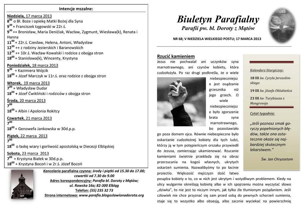 Intencje mszalne: Niedziela, 17 marca 2013 800 o Bł. Boże i opiekę Matki Bożej dla Syna 930 + Franciszek Łęgowski w 22r.ś. 930 ++ Bronisław, Maria Deniźiak, Wacław, Zygmunt, Wiesława(k), Renata i Hanna 1100 + 22r.ś. Czesław, Helena, Antoni, Władysław 1230 ++ z rodziny Jezierskich i Baranowskich 1230 ++ 10r.ś. Wacław Kowalski i rodzice z obojga stron 1800 + Stanisława(k), Wincenty, Krystyna Poniedziałek, 18 marca 2013 930 + Kazimiera Wójcik 1800 + Józef Marczyk w 11r.ś. oraz rodzice z obojga stron Wtorek, 19 marca 2013 700 + Władysław Dudar 1800 + Józef Ćwikliński i rodziców z obojga stron Środa, 20 marca 2013 700 1800 + Albin i Apolonia Rokitcy Czwartek, 21 marca 2013 700 1800 + Genowefa Jankowska w 30d.p.p. Piątek, 22 marca 2013 700 1800 o łaskę wiary i gorliwość apostolską w Diecezji Elbląskiej Sobota, 23 marca 2013 700 + Krystyna Białek w 30d.p.p. 1800 + Krystyna Bocoń i w 2r.ś. Józef Bocoń Kancelaria parafialna czynna: środy i piątki od 15.30 do 17.00; czwartki od 7.30 do 9.00 Adres korespondencyjny: Parafia bł. Doroty z Mątów; ul. Rawska 16a; 82-300 Elbląg Telefon: (55) 235 32 73 Strona internetowa: www.parafia.blogoslawionadorota.org Biuletyn Parafialny Parafii pw. bł. Doroty z Mątów NR 68; V NIEDZIELA WIELKIEGO POSTU; 17 MARCA 2013 Rzucić kamieniem Jezus nie pochwalał ani uczynków syna marnotrawnego, ani czynów kobiety, która Kalendarz liturgiczny: cudzołożyła. Po raz drugi podkreśla, że o wiele 18 III św. Cyryla Jerozolimniebezpieczniejsz skiego e jest osądzanie grzesznika niż 19 III św. Józefa Oblubieńca jego grzech. O 23 III św. Turybiusza z wiele Mongrovejo niebezpieczniejsz e było zgorszenie Cytat tygodnia: brata syna marnotrawnego, „Jeśli poznasz smak gobo pozostawiało ryczy popełnionych błędów, także ona ostago poza domem ojca. Równie niebezpieczne było tecznie okaże się najoskarżanie cudzołożnej kobiety dla tych ludzi, bardziej skutecznym którzy ją w tym potępieńczym orszaku przywiedli lekarstwem.” do Jezusa, zamierzając ukamienować. Rzucanie kamieniami świetnie przekłada się na obraz Św. Jan Chryzostom przerzucania na kogoś własnych, ukrytych oskarżeń sumienia. Nazwalibyśmy to po łacinie proiectio. Większość mężczyzn dość łatwo posądza kobiety o to, co w nich jest ukrytym i wstydliwym problemem. Kiedy na ulicy wulgarnie określają kobietę albo w ich spojrzeniu można wyczytać słowo „dziwka”, to nie jest to niczym innym, jak tylko źle tłumionym pożądaniem. Jeśli człowiek nie chce przyznać się sam przed sobą do pewnych schorzeń sumienia, staje się to wszystko albo obsesją, albo zacznie wyciekać na powierzchnię świadomości w postaci rzutowania na inne osoby swoich stłumionych wynaturzeń, w postaci projekcji. Przypisuje się wtedy in- nym dokładnie to, czego w sobie samym nie chce się uznać. Inni stają się lustrami lub ekranami naszych wewnętrznych potworów. Święci znani… i nie znani Św. Cyryl Jerozolimski Cyryl urodził się około 315 roku w Jerozolimie. Pochodził z rodziny chrześcijańskiej, bardzo przywiązanej do wiary świętej. Zwyczajem pobożnych rodzin Cyryl od młodości zaprawiał się w ascezie chrześcijańskiej w jednym z klasztorów Palestyny. Z rąk biskupa Jerozolimy, św. Makarego, przyjął święcenia diakonatu (334), a z rąk jego następcy, św. Maksyma, otrzymał święcenia kapłańskie (344). Po śmierci św. Maksyma na stolicę jerozolimską został wybrany św. Cyryl. Ze względu na rangę pierwszej w świecie stolicy biskupiej wybór musiał zatwierdzić synod w Konstantynopolu, cesarz i papież. Cyryl z takim zapałem zabrał się do pasterzowania, że współczesny mu św. Bazyli Wielki (+ 379) wyraża o nim najwyższe pochwały. Trzykrotnie był zsyłany na wygnanie z powodu zdecydowanej postawy wobec arian. Najpierw wystąpił przeciwko niemu ariański metropolita Cezarei Palestyńskiej, Akacjusz. Skłonił on ariańskiego cesarza Konstancjusza, żeby ten skazał Cyryla jako "heretyka" na wygnanie (351). Święty został zesłany do Tarsu, rodzinnego miasta św. Pawła Apostoła. Tamtejszy biskup przyjął go z wielką czcią. Synod w Seleucji potępił arianizm, Akacjusza skazał na wygnanie, a św. Cyryla odwołał z banicji. Po 9 latach Cyryl mógł wreszcie powrócić do swojej owczarni. Akacjusz jednak nie myślał bynajmniej ustąpić. Korzystając z ponownej życzliwości cesarza wymógł na nim, by na synodzie w Konstantynopolu Cyryl został ponownie potępiony i skazany na wygnanie. Tym razem tułaczka biskupa nie trwała długo, bo w kilka miesięcy potem kolejny cesarz, Julian Apostata, pozwolił mu powrócić. Nie niepokojono go przez 19 lat. W tym czasie rozwinął pełną działalność, aby przywrócić jedność Kościołowi w Jerozolimie. Wtedy powstała większość jego katechez, czyli mów, w których wyjaśnił całokształt prawd wiary Chrystusowej. Po rychłej śmierci Juliana Apostaty panowanie objął znowu cesarz ariański, Walens (364-378). Cyryl musiał po raz trzeci opuścić swoją owczarnię. Pozostał na banicji 8 lat, czyli aż do swojej śmierci, bowiem następca cesarza Walensa, Walentynian, także arianin, nie pozwolił mu wrócić. Cyryl pożegnał ziemię dla nieba daleko od diecezji 18 marca 386 roku, gdy miał ok. 71 lat życia i 38 lat pasterzowania. HUMOR Jerozolima, rok ok. 30. Na placu stoi grupka ludzi, trzymając w ręku kamienie, a pod murem nierządnica. Na środku stoi Jezus i mówi: "Kto jest bez winy, niech pierwszy rzuci kamień". Wszystkim ręce opadły. Nagle z tyłu nad głowami wyleciał do góry kamień i spadł obok nierządnicy. Jezus spojrzał uważnie: - Ile razy mam powtarzać, żeby się mama nie mieszała? Ogłoszenia parafialne – V Niedziela Wielkiego Postu 1. We wtorek Uroczystość św. Józefa – dzień uroczystego rozpoczęcia pontyfikatu papieża Franciszka jak również dzień imienin J.E. Ks. Bpa Józefa Wysockiego. Msza 