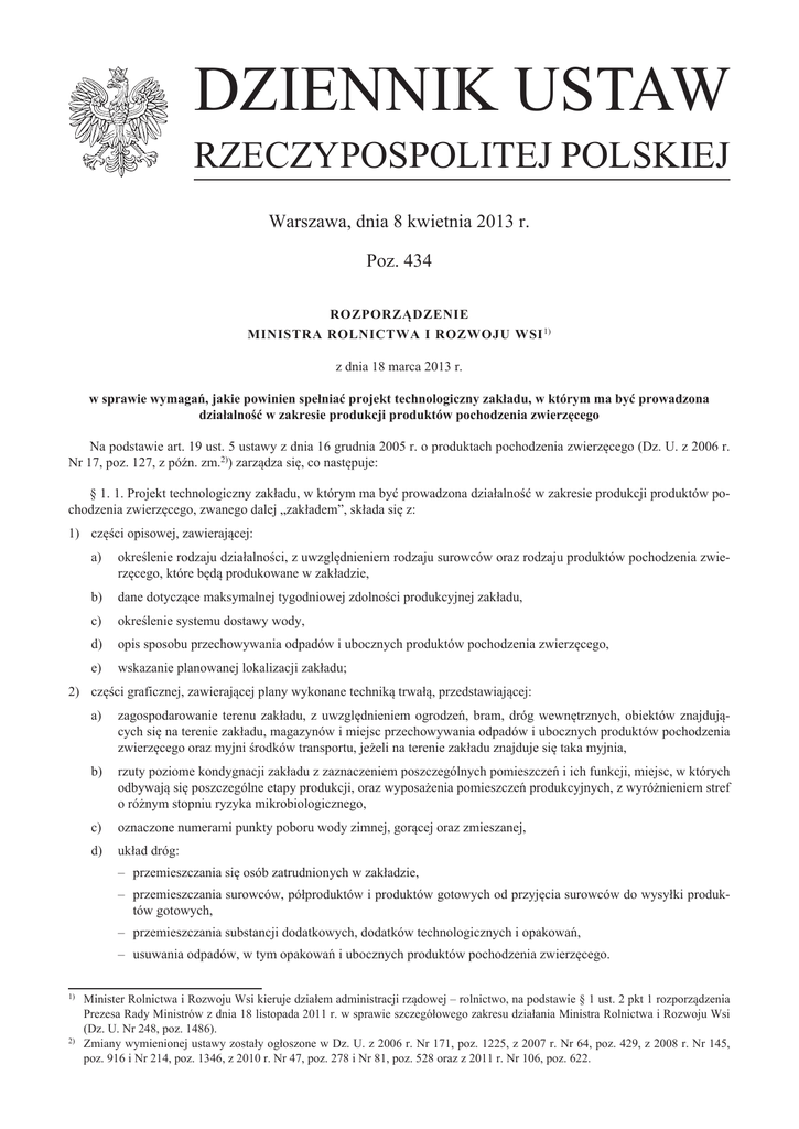 DZIENNIK USTAW RZECZYPOSPOLITEJ POLSKIEJ Warszawa, dnia 8 kwietnia 2013 r. Poz. 434 ROZPORZĄDZENIE MINISTRA ROLNICTWA I ROZWOJU WSI 1) z dnia 18 marca 2013 r. w sprawie wymagań, jakie powinien spełniać projekt technologiczny zakładu, w którym ma być prowadzona działalność w zakresie produkcji produktów pochodzenia zwierzęcego Na podstawie art. 19 ust. 5 ustawy z dnia 16 grudnia 2005 r. o produktach pochodzenia zwierzęcego (Dz. U. z 2006 r. Nr 17, poz. 127, z późn. zm.2)) zarządza się, co następuje: § 1. 1. Projekt technologiczny zakładu, w którym ma być prowadzona działalność w zakresie produkcji produktów pochodzenia zwierzęcego, zwanego dalej „zakładem”, składa się z: 1)części opisowej, zawierającej: a)określenie rodzaju działalności, z uwzględnieniem rodzaju surowców oraz rodzaju produktów pochodzenia zwierzęcego, które będą produkowane w zakładzie, b)dane dotyczące maksymalnej tygodniowej zdolności produkcyjnej zakładu, c)określenie systemu dostawy wody, d)opis sposobu przechowywania odpadów i ubocznych produktów pochodzenia zwierzęcego, e)wskazanie planowanej lokalizacji zakładu; 2)części graficznej, zawierającej plany wykonane techniką trwałą, przedstawiającej: a)zagospodarowanie terenu zakładu, z uwzględnieniem ogrodzeń, bram, dróg wewnętrznych, obiektów znajdujących się na terenie zakładu, magazynów i miejsc przechowywania odpadów i ubocznych produktów pochodzenia zwierzęcego oraz myjni środków transportu, jeżeli na terenie zakładu znajduje się taka myjnia, b)rzuty poziome kondygnacji zakładu z zaznaczeniem poszczególnych pomieszczeń i ich funkcji, miejsc, w których odbywają się poszczególne etapy produkcji, oraz wyposażenia pomieszczeń produkcyjnych, z wyróżnieniem stref o różnym stopniu ryzyka mikrobiologicznego, c)oznaczone numerami punkty poboru wody zimnej, gorącej oraz zmieszanej, d)układ dróg: – przemieszczania się osób zatrudnionych w zakładzie, – przemieszczania surowców, półproduktów i produktów gotowych od przyjęcia surowców do wysyłki produktów gotowych, – przemieszczania substancji dodatkowych, dodatków technologicznych i opakowań, – usuwania odpadów, w tym opakowań i ubocznych produktów pochodzenia zwierzęcego. Minister Rolnictwa i Rozwoju Wsi kieruje działem administracji rządowej – rolnictwo, na podstawie § 1 ust. 2 pkt 1 rozporządzenia Prezesa Rady Ministrów z dnia 18 listopada 2011 r. w sprawie szczegółowego zakresu działania Ministra Rolnictwa i Rozwoju Wsi (Dz. U. Nr 248, poz. 1486). 2) Zmiany wymienionej ustawy zostały ogłoszone w Dz. U. z 2006 r. Nr 171, poz. 1225, z 2007 r. Nr 64, poz. 429, z 2008 r. Nr 145, poz. 916 i Nr 214, poz. 1346, z 2010 r. Nr 47, poz. 278 i Nr 81, poz. 528 oraz z 2011 r. Nr 106, poz. 622. 1) Dziennik Ustaw –2– Poz. 434 2. Plany, o których mowa w ust. 1 pkt 2: 1)lit. a − są wykonane w skali 1:500; 2)lit. b−d − są wykonane w skali 1:100 albo 1:200. § 2. Projekt technologiczny zakładu, w którym ma być prowadzona działalność marginalna, lokalna i ograniczona, składa się z: 1)części opisowej, zawierającej elementy, o których mowa w § 1 ust. 1 pkt 1; 2)części graficznej, zawierającej plany wykonane techniką trwałą w skali 1:100, przedstawiającej rzuty poziome kondygnacji zakładu, z zaznaczeniem poszczególnych pomieszczeń i ich funkcji, miejsc, w których odbywają się poszczególne etapy produkcji, oraz wyposażenia pomieszczeń produkcyjnych z uwzględnieniem punktów poboru wody, z wyróżnieniem stref o różnym stopniu ryzyka mikrobiologicznego oraz z zaznaczeniem dróg przemieszczania produkowanej żywności od przyjęcia surowców do wysyłki produktów gotowych. § 3. Projekt technologiczny zakładu, w którym ma być prowadzona działalność w zakresie produkcji produktów pochodzenia zwierzęcego przeznaczonych do sprzedaży bezpośredniej, obejmuje część opisową, zawierającą: 1)określenie rodzaju działalności, z uwzględnieniem rodzaju surowców oraz rodzaju produktów pochodzenia zwierzęcego, które będą produkowane w zakładzie; 2)dane dotyczące maksymalnej tygodniowej zdolności produkcyjnej zakładu, a w przypadku produkcji produktów pszczelich nieprzetworzonych – dane o maksymalnej rocznej zdolności produkcyjnej; 3)określenie systemu dostawy wody; 4)opis sposobu przechowywania odpadów i ubocznych produktów pochodzenia zwierzęcego; 5)wskazanie planowanej lokalizacji zakładu. § 4. Projekt technologiczny zakładu, w którym ma być prowadzona działalność w zakresie produkcji produktów pochodzenia zwierzęcego polegająca na schładzaniu i przechowywaniu mleka surowego po dostarczeniu go z gospodarstw produkcji mleka w rozumieniu pkt 4.2 załącznika I do rozporządzenia (WE) nr 853/2004 Parlamentu Europejskiego i Rady z dnia 29 kwietnia 2004 r. ustanawiającego szczególne przepisy dotyczące higieny w odniesieniu do żywności pochodzenia zwierzęcego (Dz. Urz. UE L 139 z 30.04.2004, str. 55, z późn. zm.; Dz. Urz. UE Polskie wydanie specjalne, rozdz. 3, t. 45, str. 14), obejmuje część opisową, zawierającą elementy, o których mowa w § 1 ust. 1 pkt 1. § 5. Do projektów technologicznych zakładów przesłanych wraz z wnioskiem o zatwierdzenie tych projektów przed dniem wejścia w życie niniejszego rozporządzenia stosuje się wymagania określone w przepisach dotychczasowych. § 6. Traci moc rozporządzenie Ministra Rolnictwa i Rozwoju Wsi z dnia 29 marca 2006 r. w sprawie wymagań, jakim powinien odpowiadać projekt technologiczny zakładu, w którym ma być prowadzona działalność w zakresie produkcji produktów pochodzenia zwierzęcego (Dz. U. Nr 59, poz. 415 oraz z 2007 r. Nr 204, poz. 1477). § 7. Rozporządzenie wchodzi w życie po upływie 30 dni od dnia ogłoszenia. Minister Rolnictwa i Rozwoju Wsi: wz. K. Plocke