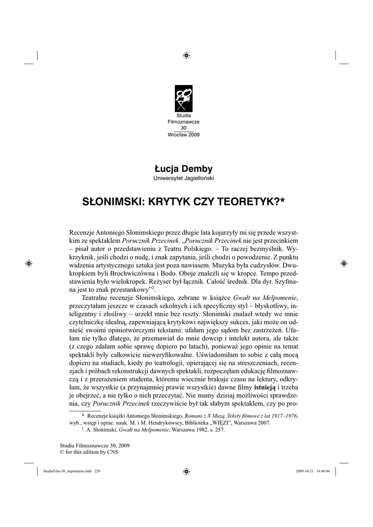Studia Filmoznawcze 30 Wroc³aw 2009 £ucja Demby Uniwersytet Jagielloñski S£ONIMSKI: KRYTYK CZY TEORETYK?* Recenzje Antoniego Słonimskiego przez długie lata kojarzyły mi się przede wszystkim ze spektaklem Porucznik Przecinek. „Porucznik Przecinek nie jest przecinkiem – pisał autor o przedstawieniu z Teatru Polskiego. – To raczej bezmyślnik. Wykrzyknik, jeśli chodzi o nudę, i znak zapytania, jeśli chodzi o powodzenie. Z punktu widzenia artystycznego sztuka jest poza nawiasem. Muzyka była cudzysłów. Dwukropkiem byli Brochwiczówna i Bodo. Oboje znaleźli się w kropce. Tempo przedstawienia było wielokropek. Reżyser był łącznik. Całość średnik. Dla dyr. Szyfmana jest to znak przestankowy”1. Teatralne recenzje Słonimskiego, zebrane w książce Gwałt na Melpomenie, przeczytałam jeszcze w czasach szkolnych i ich specyficzny styl – błyskotliwy, inteligentny i złośliwy – urzekł mnie bez reszty. Słonimski znalazł wtedy we mnie czytelniczkę idealną, zapewniającą krytykowi największy sukces, jaki może on odnieść swoimi opiniotwórczymi tekstami: ufałam jego sądom bez zastrzeżeń. Ufałam nie tylko dlatego, że przemawiał do mnie dowcip i intelekt autora, ale także (z czego zdałam sobie sprawę dopiero po latach), ponieważ jego opinie na temat spektakli były całkowicie nieweryfikowalne. Uświadomiłam to sobie z całą mocą dopiero na studiach, kiedy po teatrologii, opierającej się na streszczeniach, recenzjach i próbach rekonstrukcji dawnych spektakli, rozpoczęłam edukację filmoznawczą i z przerażeniem studenta, któremu wiecznie brakuje czasu na lektury, odkryłam, że wszystkie (a przynajmniej prawie wszystkie) dawne filmy istnieją i trzeba je obejrzeć, a nie tylko o nich przeczytać. Nie mamy dzisiaj możliwości sprawdzenia, czy Porucznik Przecinek rzeczywiście był tak słabym spektaklem, czy po pro* Recenzje książki Antoniego Słonimskiego, Romans z X Muzą. Teksty filmowe z lat 1917–1976, wyb., wstęp i oprac. nauk. M. i M. Hendrykowscy, Biblioteka „WIĘZI”, Warszawa 2007. 1 A. Słonimski, Gwałt na Melpomenie, Warszawa 1982, s. 257. Studia Filmoznawcze 30, 2009 © for this edition by CNS StudiaFilm-30_imprimatur.indb 229 2009-10-21 14:48:04 230 | £ucja Demby stu nie przypadł do gustu recenzentowi. Inaczej jest w przypadku filmu. Małgorzata i Marek Hendrykowscy, dokonując wyboru pism Antoniego Słonimskiego na temat kina, dali nam, współczesnym czytelnikom, a zwłaszcza filmoznawcom, możliwość takiej weryfikacji: wiele filmów, o których pisze autor, nadal można bez trudu obejrzeć. Jednocześnie przywrócili oni Słonimskiego krytyce filmowej, przypominając, że, wbrew utartym poglądom, to jego właśnie, a nie Karola Irzykowskiego, należy uznać za pierwszego polskiego przedstawiciela tej dziedziny. Obok Gwałtu na Melpomenie zaistniał dzięki temu Romans z X Muzą. Słonimski pisał o kinie przede wszystkim w „Kurierze Polskim” – od roku 1920 był redaktorem tego poczytnego dziennika, w którym objął później dział kultury i sztuki. Jego związki ze sztuką filmową nie kończą się jednak na tym – autorzy opracowania w niezwykle wyczerpującym wstępie do książki przypominają także inne aspekty jego miłości do X Muzy (scenariusze, wiersze, powieści). Jako krytyk jest Słonimski postacią fascynującą z wielu powodów. Sam fakt, że recenzje filmowe pisze znany poeta, nadaje im szczególnego charakteru – zwłaszcza gdy poeta ten obdarzony jest nie tylko poczuciem liryzmu, ale również dowcipem i przysłowiowym „ostrym językiem”. Słonimski jest jednak także – co ciekawe – rówieśnikiem kina. Urodzony w roku 1895 poeta mógł więc pisać o kinie z perspektywy dziś już nam zupełnie niedostępnej, czyli tak, jak określił to kiedyś Erwin Panofsky w odniesieniu do samego siebie i swego pokolenia: sztuka ta rodziła się i rozwijała na jego oczach2. Słonimski jako krytyk jest też postacią kontrowersyjną; w sposób nieco przekorny przyznawał się zresztą do tego on sam. Komentując swoje recenzje teatralne, przywoływał opinię Witkacego, który twierdził, iż „Słonimski [...] bezwzględnie nie powinien, nie ma prawa (nie mając swego systemu) być teatralnym krytykiem, nawet pomimo tego, że w walce z lichotą, z miernotą ma czasem słuszność”3. Na gruncie piśmiennictwa filmowego jego oponentem był przede wszystkim Karol Irzykowski, który zarzucał mu brak obiektywizmu i profesjonalnych kompetencji krytyka. Oba zarzuty, choć dotyczą innych dziedzin sztuki, sprowadzają się w gruncie rzeczy do tego samego: zarówno wtedy, kiedy chwalił, jak i wówczas, gdy bezlitośnie wyśmiewał, Słonimski kierował się tylko i wyłącznie swoimi subiektywnymi odczuciami – i uważał, że jako krytyk ma do tego prawo. Trzeba zresztą przyznać, że subiektywne opinie autora są świadectwem jego niezwykłej intuicji i dobrego gustu w odniesieniu do rodzącej się przecież dopiero młodej sztuki. Potępiając kicz i miernotę (zwłaszcza w rodzimej kinematografii), Słonimski wyraźnie wskazuje na to, co zasługuje na uznanie: filmy Davida W. Griffitha, Charliego Chaplina, Friedricha W. Murnaua. Wnikliwie analizuje Gabinet doktora Caligariego (1920, reż. R. Wiene) i jako pierwszy, przed Siergiejem Eisensteinem, wskazuje na pokrewieństwo narracyjne filmów Griffitha i powieści Charlesa Dickensa. Jego felietony na temat dojrzałych filmów Chaplina, 2 Por. E. Panofsky, Styl i medium w filmie, przeł. J. Mach, [w:] Estetyka i film, pod red. A. Helman, Warszawa 1972, s. 128. 3 A. Słonimski, dz. cyt., s. 5. Studia Filmoznawcze 30, 2009 © for this edition by CNS StudiaFilm-30_imprimatur.indb 230 2009-10-21 14:48:04 S³onimski: krytyk czy teoretyk? | 231 którego uważał za jedynego twórcę prawdziwych arcydzieł filmowych, mogą zainteresować również współczesnego czytelnika. Obok tych rozważnych i dojrzałych ocen oraz prognoz dla kina w 