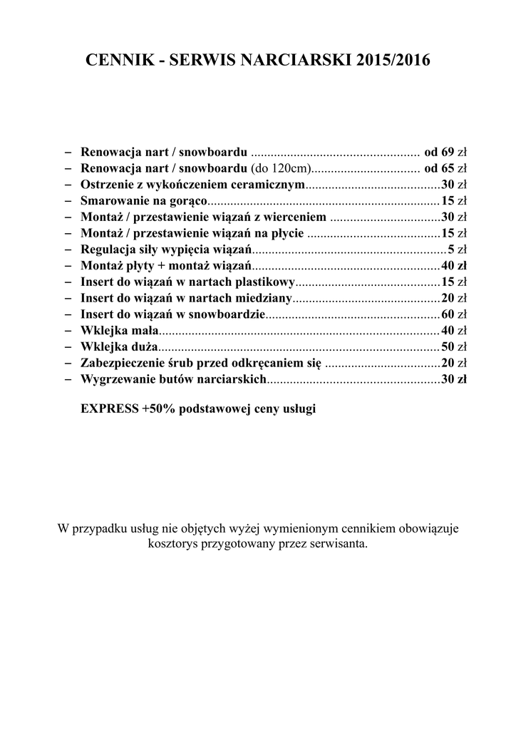 CENNIK - SERWIS NARCIARSKI 2015/2016 – – – – – – – – – – – – – – – Renowacja nart / snowboardu ................................................... od 69 zł Renowacja nart / snowboardu (do 120cm)................................. od 65 zł Ostrzenie z wykończeniem ceramicznym.........................................30 zł Smarowanie na gorąco....................................................................... 15 zł Montaż / przestawienie wiązań z wierceniem .................................30 zł Montaż / przestawienie wiązań na płycie ........................................15 zł Regulacja siły wypięcia wiązań...........................................................5 zł Montaż płyty + montaż wiązań.........................................................40 zł Insert do wiązań w nartach plastikowy............................................15 zł Insert do wiązań w nartach miedziany.............................................20 zł Insert do wiązań w snowboardzie.....................................................60 zł Wklejka mała..................................................................................... 40 zł Wklejka duża..................................................................................... 50 zł Zabezpieczenie śrub przed odkręcaniem się ...................................20 zł Wygrzewanie butów narciarskich....................................................30 zł EXPRESS +50% podstawowej ceny usługi W przypadku usług nie objętych wyżej wymienionym cennikiem obowiązuje kosztorys przygotowany przez serwisanta.