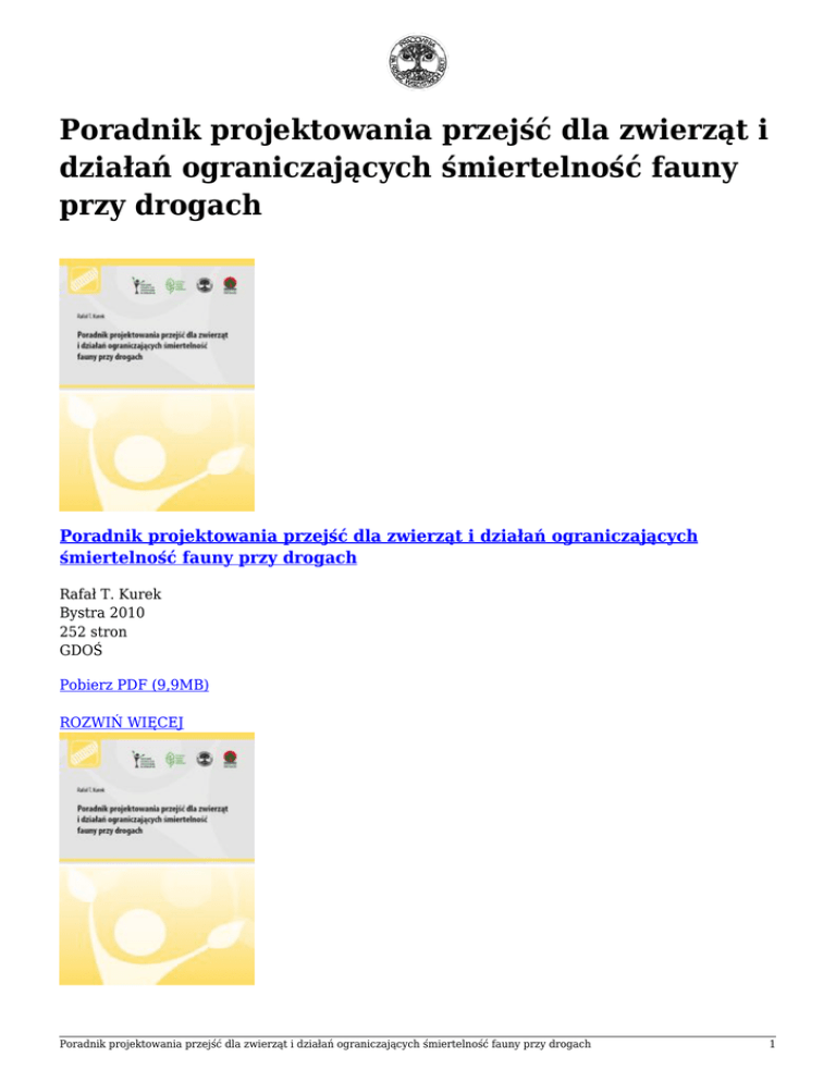 Poradnik projektowania przejść dla zwierząt i działań ograniczających śmiertelność fauny przy drogach Poradnik projektowania przejść dla zwierząt i działań ograniczających śmiertelność fauny przy drogach Rafał T. Kurek Bystra 2010 252 stron GDOŚ Pobierz PDF (9,9MB) ROZWIŃ WIĘCEJ Poradnik projektowania przejść dla zwierząt i działań ograniczających śmiertelność fauny przy drogach 1 Poradnik projektowania przejść dla zwierząt i działań ograniczających śmiertelność fauny przy drogach Rafał T. Kurek Bystra 2010 252 stron GDOŚ Pobierz PDF (9,9MB) Budowa przejść dla zwierząt jest od wielu lat najważniejszą i powszechnie stosowaną metodą minimalizacji negatywnego oddziaływania dróg na dziką faunę. Duże znaczenie przyrodnicze, a także znaczące koszty budowy przejść powodują, że należy dołożyć wszelkich starań, by powstające obiekty posiadały możliwie najwyższą skuteczność. Na każdym etapie planowania, projektowania, a także budowy i utrzymania przejść należy uwzględnić specyfikę tych obiektów w stosunku do innych budowli inżynierskich, wynikającą z wymagań i preferencji poszczególnych gatunków zwierząt, dla których są przeznaczone. Kilkunastoletnie doświadczenia z budowy przejść dla zwierząt w Polsce wskazują jednoznacznie, że są to obiekty trudne do realizacji, a wdrożenie optymalnych rozwiązań nie jest możliwe bez prowadzenia konstruktywnego dialogu pomiędzy przyrodnikami i inżynierami. Intencją autorów było, aby publikacja niniejsza stała się przydatnym narzędziem dla wszystkich podmiotów i instytucji uczestniczących zarówno w opracowaniu dokumentacji środowiskowej i projektowej, jak i wydających decyzje administracyjne konieczne do realizacji inwestycji drogowych. Publikacja została przygotowana w ramach projektu „Ochrona obszarów siedliskowych i korytarzy ekologicznych dzikiej fauny przy drogach szybkiego ruchu w Polsce”, realizowanego przez Stowarzyszenie Pracownia na rzecz Wszystkich Istot ze środków Funduszu dla Organizacji Pozarządowych, we współpracy i pod patronatem Generalnego Dyrektora Ochrony Środowiska. Poradnik projektowania przejść dla zwierząt i działań ograniczających śmiertelność fauny przy drogach 2