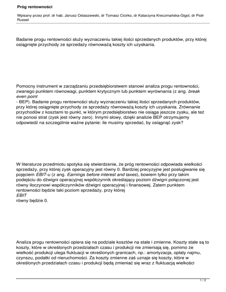 Próg rentowności Wpisany przez prof. dr hab. Janusz Ostaszewski, dr Tomasz Cicirko, dr Katarzyna Kreczmańska-Gigol, dr Piotr Russel Badanie progu rentowności służy wyznaczeniu takiej ilości sprzedanych produktów, przy której osiągnięte przychody ze sprzedaży równoważą koszty ich uzyskania. Pomocny instrument w zarządzaniu przedsiębiorstwem stanowi analiza progu rentowności, zwanego punktem równowagi, punktem krytycznym lub punktem wyrównania (z ang. break even point - BEP). Badanie progu rentowności służy wyznaczeniu takiej ilości sprzedanych produktów, przy której osiągnięte przychody ze sprzedaży równoważą koszty ich uzyskania. Zrównanie przychodów z kosztami to punkt, w którym przedsiębiorstwo nie osiąga jeszcze zysku, ale też nie ponosi strat (zysk jest równy zero). Innymi słowy, dzięki analizie BEP otrzymujemy odpowiedź na szczególnie ważne pytanie: ile musimy sprzedać, by osiągnąć zysk? W literaturze przedmiotu spotyka się stwierdzenie, że próg rentowności odpowiada wielkości sprzedaży, przy której zysk operacyjny jest równy 0. Bardziej precyzyjne jest posługiwanie się pojęciem EBIT-u (z ang. Earnings before interest and taxes), bowiem tylko przy takim podejściu do dźwigni operacyjnej współczynnik określający poziom dźwigni połączonej jest równy iloczynowi współczynników dźwigni operacyjnej i finansowej. Zatem punktem rentowności będzie taki poziom sprzedaży, przy której EBIT równy będzie 0. Analiza progu rentowności opiera się na podziale kosztów na stałe i zmienne. Koszty stałe są to koszty, które w określonych przedziałach czasu i produkcji nie zmieniają się, pomimo że wielkość produkcji ulega fluktuacji w określonych granicach, np.: amortyzacja, opłaty najmu, czynszu, podatki od nieruchomości. Za koszty zmienne zaś uznaje się koszty, które w określonych przedziałach czasu i produkcji będą zmieniać się wraz z fluktuacją wielkości 1/2 Próg rentowności Wpisany przez prof. dr hab. Janusz Ostaszewski, dr Tomasz Cicirko, dr Katarzyna Kreczmańska-Gigol, dr Piotr Russel produkcji, np. koszty surowców, materiałów, wynagrodzeń naliczanych w systemie akordowym. Zmienność kosztów względem rozmiarów produkcji często ma charakter krzywoliniowy - koszty zmienne o charakterze progresywnym lub degresywnym. W analizie progu rentowności, celem uproszczenia obliczeń, wprowadza się założenie, że zmienność kosztów jest wprost proporcjonalna do wielkości produkcji. W odniesieniu do kosztów stałych przyjmuje się natomiast założenie, że w rozpatrywanym okresie mają one charakter kosztów bezwzględnie stałych, tzn., że nie zależą one w żadnym stopniu od rozmiarów produkcji. Założenie o bezwzględnej stałości oznacza również, że koszty stałe nie są zależne od upływającego czasu, oraz że w analizowanym okresie nie są nabywane aktywa trwałe podlegające umorzeniu (zachowany jest niezmienny poziom odpisów amortyzacyjnych). Kolejne założenia przyjęte w analizie progu rentowności są następujące. Pełna treść artykułu, z rysunkiem, wzorami i przykładem: plik pdf Uwaga: niniejszy artykuł stanowi podrozdział 2.3.1 z rozdziału 2 książki prof. dr. hab. Janusza Ostaszewskiego, dr. Tomasza Cicirko, dr Katarzyny Kreczmańskiej-Gigol, dr. Piotra Russela „Finanse spółki akcyjnej. Wydanie 3 rozszerzone" wydanej przez Difin, 2009 r. Więcej informacji o tej książce podaliśmy w dziale „Literatura biznesu" w biuletynie nr 7 (8) 2009 r. 2/2