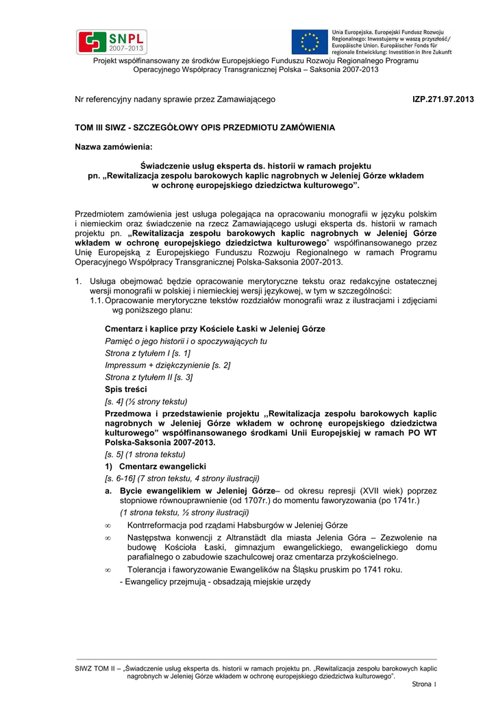 Projekt współfinansowany ze środków Europejskiego Funduszu Rozwoju Regionalnego Programu Operacyjnego Współpracy Transgranicznej Polska – Saksonia 2007-2013 Nr referencyjny nadany sprawie przez Zamawiającego IZP.271.97.2013 TOM III SIWZ - SZCZEGÓŁOWY OPIS PRZEDMIOTU ZAMÓWIENIA Nazwa zamówienia: Świadczenie usług eksperta ds. historii w ramach projektu pn. „Rewitalizacja zespołu barokowych kaplic nagrobnych w Jeleniej Górze wkładem w ochronę europejskiego dziedzictwa kulturowego”. Przedmiotem zamówienia jest usługa polegająca na opracowaniu monografii w języku polskim i niemieckim oraz świadczenie na rzecz Zamawiającego usługi eksperta ds. historii w ramach projektu pn. „Rewitalizacja zespołu barokowych kaplic nagrobnych w Jeleniej Górze wkładem w ochronę europejskiego dziedzictwa kulturowego” współfinansowanego przez Unię Europejską z Europejskiego Funduszu Rozwoju Regionalnego w ramach Programu Operacyjnego Współpracy Transgranicznej Polska-Saksonia 2007-2013. 1. Usługa obejmować będzie opracowanie merytoryczne tekstu oraz redakcyjne ostatecznej wersji monografii w polskiej i niemieckiej wersji językowej, w tym w szczególności: 1.1. Opracowanie merytoryczne tekstów rozdziałów monografii wraz z ilustracjami i zdjęciami wg poniższego planu: Cmentarz i kaplice przy Kościele Łaski w Jeleniej Górze Pamięć o jego historii i o spoczywających tu Strona z tytułem I [s. 1] Impressum + dziękczynienie [s. 2] Strona z tytułem II [s. 3] Spis treści [s. 4] (½ strony tekstu) Przedmowa i przedstawienie projektu ,,Rewitalizacja zespołu barokowych kaplic nagrobnych w Jeleniej Górze wkładem w ochronę europejskiego dziedzictwa kulturowego” współfinansowanego środkami Unii Europejskiej w ramach PO WT Polska-Saksonia 2007-2013. [s. 5] (1 strona tekstu) 1) Cmentarz ewangelicki [s. 6-16] (7 stron tekstu, 4 strony ilustracji) a. Bycie ewangelikiem w Jeleniej Górze– od okresu represji (XVII wiek) poprzez stopniowe równouprawnienie (od 1707r.) do momentu faworyzowania (po 1741r.) (1 strona tekstu, ½ strony ilustracji) • Kontrreformacja pod rządami Habsburgów w Jeleniej Górze • Następstwa konwencji z Altranstädt dla miasta Jelenia Góra – Zezwolenie na budowę Kościoła Łaski, gimnazjum ewangelickiego, ewangelickiego domu parafialnego o zabudowie szachulcowej oraz cmentarza przykościelnego. • Tolerancja i faworyzowanie Ewangelików na Śląsku pruskim po 1741 roku. - Ewangelicy przejmują - obsadzają miejskie urzędy ________________________________________________________________________________________________ SIWZ TOM II – „Świadczenie usług eksperta ds. historii w ramach projektu pn. „Rewitalizacja zespołu barokowych kaplic nagrobnych w Jeleniej Górze wkładem w ochronę europejskiego dziedzictwa kulturowego”. Strona 1 Projekt współfinansowany ze środków Europejskiego Funduszu Rozwoju Regionalnego Programu Operacyjnego Współpracy Transgranicznej Polska – Saksonia 2007-2013 b. Własne miejsce wiecznego spoczynku (2 strony tekstu, 1 ½ strony ilustracji) • Pierwszy tymczasowy ewangelicki drewniany kościół na dzisiejszym placu kościelnym (3 maj 1709 – 8 maj 1718) • Budowa cmentarza przykościelnego (od 16 stycznia 1710) • Wzory historyczne i dotyczące historii sztuki przy budowie przykościelnego cmentarza • Cmentarz przykościelny jako miejsce żałoby, zadumy, wyciszenia i medytacji c. Element niebiański – Śmierć, pochówek oraz życie pozagrobowe w rozumieniu wiary ewangelickiej (2 strony tekstu, 1 strona ilustracji) • Pochówki i rytuały pogrzebowe ewangelickich jeleniogórzan w XVII i XVIII wieku. • Odzwierciedlenie sztuki grobowej oraz napisów na jeleniogórskim cmentarzu przykościelnym d. Element ziemski – Wspaniałe kaplice nagrobne i ich twórcy: Kupcy woalu z cechu kupieckiego w Jeleniej Górze (2 strony tekstu, 1 strona ilustracji) • Kim byli kupcy woalu? W jaki sposób stali się symbolem bogactwa, wpływów i potęgi gospodarczej w Jeleniej Górze? • Reprezentatywna wola bycia ponad śmiercią; pełniące funkcję krypt rodzinnych i wieczystego pałacu – nawiązanie architektoniczne do pałaców i sztuki sakralnej z okresu baroku Co było źródłem bogactwa kupców w mieście? – Tkactwo lnu i woalu na Śląsku – Utrzymanie dla ludności, bogactwo dla handlarzy i kupców [s. 17-21] (3 strony tekstu, 2 strony ilustracji) Od wyrobów na zamówienie specjalne do przeboju eksportowego– Śląskie wyroby z lnu – stara tradycja rzemieślnicza – uprawa lnu, -obróbka, przędzenie i tkanie w kotlinie Jeleniogórskiej– historia „jeleniogórskiego woalu” (1 strona tekstu, ½ strony ilustracji) Jelenia Góra – brama na świat dla śląskiego handlu wyrobami lnianymi Rynek i centrum handlowe bohemskiego i śląskiego przemysłu lnianego po obu stronach Sudetów – Rynek jeleniogórski z podcieniami; tutaj targowali się śląscy tkacze z bogatymi kupcami woalu – domy kupców woalu, patrycjuszy jeleniogórskich – siedziby rycerskie kupców woalu w kotlinie jeleniogórskiej (1 strona tekstu, 1 strona ilustracji) Przywilej przynoszący bogactwo – Wybielanie, impregnacja i farbowanie, przywilej kupców woali (wybielanie wkomponowane w krajobraz miasta Jelenia Góra – bielarnia w miejscowości Wolany) (1 strona tekstu, ½ strony ilustracji) Imperium kupieckie kupców woali z Jeleniej Góry. [s. 22-25] (2 ½ strony tekstu, 1 ½ strony ilustracji) Handel światowy „made in Silesia“ – Eksport śląskich wyrobów lnianych do Ameryki, Afryki i Azji – śląskie wyroby lniane w atlantyckim handlu trójkątnym – czarnoskórzy niewolnicy na amerykańskich plantacjach bawełny ubrani w śląskie wyroby lniane (1 strona tekstu, ½ strony ilustracji) Kupcy woalu jako „global players” (światowi gracze) swego czasu – Kontakty handlowe na cały świat poprzez podróże handlowe do Holandii, Anglii i Francji – Targi jako miejsca spotkań pa