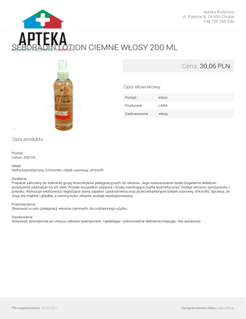 Apteka Rodzinna ul. Piastów 8, 74-500 Chojna +48 725 298 530 SEBORADIN LOTION CIEMNE WŁOSY 200 ML Cena: 30,06 PLN Opis słownikowy Postać lotion Producent LARA Zastosowanie włosy Opis produktu Postać Lotion, 200 ml Skład Nafta kosmetyczna, D-limonen, olejek sosnowy, chlorofil. Działanie Preparat zaliczany do szerokiej grupy kosmetyków pielęgnacyjnych do włosów. Jego zastosowanie dzięki bogatemu składowi pozytywnie oddziałuje na ich stan. Przede wszystkim odżywia i działa nawilżająco (nafta kosmetyczna). Dodaje włosom sprężystości i połysku. Wykazuje właściwości łagodzące stany zapalne i podrażnienia oraz przeciwbakteryjne (olejek sosnowy, chlorofil). Sprawia, że stają się miękkie i gładkie, a ciemny kolor włosów zostaje wyeksponowany. Przeznaczenie Stosować w celu pielęgnacji włosów ciemnych, do codziennego użytku. Dawkowanie Stosować zewnętrznie po umyciu włosów szamponem, nakładając i jednocześnie delikatnie masując. Nie spłukiwać. Plik wygenerowano: 02-03-2017 Powered by TCPDF (www.tcpdf.org) Oprogramowanie sklepu: AptusShop