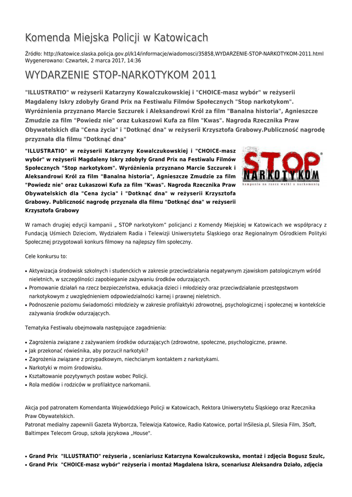 Komenda Miejska Policji w Katowicach Źródło: http://katowice.slaska.policja.gov.pl/k14/informacje/wiadomosci/35858,WYDARZENIE-STOP-NARKOTYKOM-2011.html Wygenerowano: Czwartek, 2 marca 2017, 14:36 WYDARZENIE STOP-NARKOTYKOM 2011 "ILLUSTRATIO" w reżyserii Katarzyny Kowalczukowskiej i "CHOICE-masz wybór" w reżyserii Magdaleny Iskry zdobyły Grand Prix na Festiwalu Filmów Społecznych "Stop narkotykom". Wyróżnienia przyznano Marcie Szczurek i Aleksandrowi Król za film "Banalna historia", Agnieszcze Zmudzie za film "Powiedz nie" oraz Łukaszowi Kufa za film "Kwas". Nagroda Rzecznika Praw Obywatelskich dla "Cena życia" i "Dotknąć dna" w reżyserii Krzysztofa Grabowy.Publiczność nagrodę przyznała dla filmu "Dotknąć dna" "ILLUSTRATIO" w reżyserii Katarzyny Kowalczukowskiej i "CHOICE-masz wybór" w reżyserii Magdaleny Iskry zdobyły Grand Prix na Festiwalu Filmów Społecznych "Stop narkotykom". Wyróżnienia przyznano Marcie Szczurek i Aleksandrowi Król za film "Banalna historia", Agnieszcze Zmudzie za film "Powiedz nie" oraz Łukaszowi Kufa za film "Kwas". Nagroda Rzecznika Praw Obywatelskich dla "Cena życia" i "Dotknąć dna" w reżyserii Krzysztofa Grabowy. Publiczność nagrodę przyznała dla filmu "Dotknąć dna" w reżyserii Krzysztofa Grabowy W ramach drugiej edycji kampanii „ STOP narkotykom” policjanci z Komendy Miejskiej w Katowicach we współpracy z Fundacją Uśmiech Dzieciom, Wydziałem Radia i Telewizji Uniwersytetu Śląskiego oraz Regionalnym Ośrodkiem Polityki Społecznej przygotowali konkurs filmowy na najlepszy film społeczny. Cele konkursu to: ● Aktywizacja środowisk szkolnych i studenckich w zakresie przeciwdziałania negatywnym zjawiskom patologicznym wśród nieletnich, w szczególności zapobieganie zażywaniu środków odurzających. ● Promowanie działań na rzecz bezpieczeństwa, edukacja dzieci i młodzieży oraz przeciwdziałanie przestępstwom narkotykowym z uwzględnieniem odpowiedzialności karnej i prawnej nieletnich. ● Podnoszenie poziomu świadomości młodzieży w zakresie profilaktyki zdrowotnej, psychologicznej i społecznej w kontekście zażywania środków odurzających. Tematyka Festiwalu obejmowała następujące zagadnienia: ● Zagrożenia związane z zażywaniem środków odurzających (zdrowotne, społeczne, psychologiczne, prawne. ● Jak przekonać rówieśnika, aby porzucił narkotyki? ● Zagrożenia związane z przypadkowym, niechcianym kontaktem z narkotykami. ● Narkotyki w moim środowisku. ● Kształtowanie pozytywnych postaw wobec Policji. ● Rola mediów i rodziców w profilaktyce narkomanii. Akcja pod patronatem Komendanta Wojewódzkiego Policji w Katowicach, Rektora Uniwersytetu Śląskiego oraz Rzecznika Praw Obywatelskich. Patronat medialny zapewnili Gazeta Wyborcza, Telewizja Katowice, Radio Katowice, portal InSilesia.pl, Silesia Film, 3Soft, Baltimpex Telecom Group, szkoła językowa „House". ● Grand Prix "ILLUSTRATIO" reżyseria , sceniariusz Katarzyna Kowalczukowska, montaż i zdjęcia Bogusz Szulc, ● Grand Prix "CHOICE-masz wybór" reżyseria i montaż Magdalena Iskra, scenariusz Aleksandra Działo, zdjęcia Alicja Majewska, producent 4M&A Amatorksa Wytwórnia Filmowa i Gimnazjum nr 53 w Warszawie, ● Wyróżnienie "Banalna historia" scenariusz i reżyseria Marta Szczurek i Aleksander Król, zdjęcia i montaż Bronisław Brachaczek, producent SOSW Cieszyn ● Wyróżnienie "Powiedz nie" reżyseria Agnieszka Zmuda, scenariusz i produkcja Paulina Stanisławska, zdjęcia Adrianna Michalak, montaż Barbara Żmuda, ● Wyróżnienie "Kwas" reżyseria, scenariusz i produkcja Łukasz Kufa, zdjęcia i montaż Tomasz Żak, ● Nagroda Rzecznika Praw Obywatelskich dla "Cena życia" i "Dotknąć dna" w reżyserii Krzysztofa Grabowy, scenariusz i montaż Grabson Films & Przemo Studio, zdjęcia Przemysław Waliszczewicz ● Nagroda publiczności dla filmu "Dotknąć dna" Zainstaluj wtyczkę Flash, aby zobaczyć odtwarzacz. pobierz film - 15.3 MB Zainstaluj wtyczkę Flash, aby zobaczyć odtwarzacz. pobierz film - 15.32 MB Zainstaluj wtyczkę Flash, aby zobaczyć odtwarzacz. pobierz film - 9.67 MB Zainstaluj wtyczkę Flash, aby zobaczyć odtwarzacz. pobierz film - 10.33 MB Zainstaluj wtyczkę Flash, aby zobaczyć odtwarzacz. pobierz film - 12.75 MB Ocena: 0/5 (0) Tweetnij