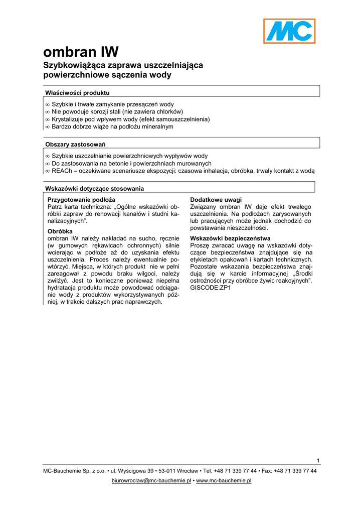 ombran IW Szybkowiążąca zaprawa uszczelniająca powierzchniowe sączenia wody Właściwości produktu • • • • Szybkie i trwałe zamykanie przesączeń wody Nie powoduje korozji stali (nie zawiera chlorków) Krystalizuje pod wpływem wody (efekt samouszczelnienia) Bardzo dobrze wiąże na podłożu mineralnym Obszary zastosowań • Szybkie uszczelnianie powierzchniowych wypływów wody • Do zastosowania na betonie i powierzchniach murowanych • REACh – oczekiwane scenariusze ekspozycji: czasowa inhalacja, obróbka, trwały kontakt z wodą Wskazówki dotyczące stosowania Przygotowanie podłoża Patrz karta techniczna: „Ogólne wskazówki obróbki zapraw do renowacji kanałów i studni kanalizacyjnych”. Obróbka ombran IW należy nakładać na sucho, ręcznie (w gumowych rękawicach ochronnych) silnie wcierając w podłoże aż do uzyskania efektu uszczelnienia. Proces należy ewentualnie powtórzyć. Miejsca, w których produkt nie w pełni zareagował z powodu braku wilgoci, należy zwilżyć. Jest to konieczne ponieważ niepełna hydratacja produktu może powodować odciąganie wody z produktów wykorzystywanych później, w trakcie dalszych prac naprawczych. Dodatkowe uwagi Związany ombran IW daje efekt trwałego uszczelnienia. Na podłożach zarysowanych lub pracujących może jednak dochodzić do powstawania nieszczelności. Wskazówki bezpieczeństwa Proszę zwracać uwagę na wskazówki dotyczące bezpieczeństwa znajdujące się na etykietach opakowań i kartach technicznych. Pozostałe wskazania bezpieczeństwa znajdują się w karcie informacyjnej „Środki ostrożności przy obróbce żywic reakcyjnych”. GISCODE:ZP1 1 MC-Bauchemie Sp. z o.o. • ul. Wyścigowa 39 • 53-011 Wrocław • Tel. +48 71 339 77 44 • Fax: +48 71 339 77 44 [email protected] • www.mc-bauchemie.pl Właściwości techniczne ombran IW Parametr Jednostka Wartość* Uwagi Czas obróbki sekundy < 30 przy temp +20°C i 50% wilgotności powietrza Temperatura stosowania °C + 5 do + 30 temp. powietrza, podłoża i materiału Zużycie** kg/m²/mm w zależności od rodzaju podłoża suchej zaprawy Charakterystyka produktu ombran IW Kolor Szary Dostawa Pojemniki 10 kg Środki do czyszczenia narzędzi Woda Szczelnie zamknięte oryginalne opakowania mogą być składowane przez co najmniej jeden rok w suchym pomieszczeniu w temperaturach pomiędzy + 5°C i + 25° C. Te same warunki dotyczą transportu. Należy całkowicie opróżniać opakowania. Dodatkowe informacje znajdują się w broszurce informacyjnej „System utylizacji pustych opakowań opracowany przez firmę MC”, którą na Państwa życzenie chętnie wyślemy. Składowanie Utylizacja opakowań * Podane parametry są podane dla temperatury +23°C i 50% wilgotności względnej powietrza. ** Zużycie zależy od szorstkości i temperatury podłoża oraz od temperatury składowania i obróbki. W celu określenia zużycia w danym obiekcie zalecamy wykonanie uprzednich prób. Uwaga: Wszelkie informacje zawarte w niniejszej karcie oparte są na naszym doświadczeniu i najlepszej wiedzy, jednakże nie mogą być traktowane jako prawnie wiążące. Należy bezwzględnie każdorazowo stosować się do prawodawstwa miejscowego, w zakresie przeznaczenia oraz zastosowania w obiektach budowlanych. Przy spełnieniu powyższych wymogów odpowiadamy za poprawność przekazanych informacji w ramach naszych Ogólnych Warunków Sprzedaży, Dostaw i Płatności. Wszelkie doradztwo ze strony naszych Współpracowników, odbiegające od treści naszych kart technicznych, jest wiążące jedynie w przypadku pisemnego ich potwierdzenia. W każdym przypadku należy stosować się do ogólnie obowiązujących zasad sztuki budowlanej. Wydanie 07/2013. Niniejszy druk został aktualizowany pod względem technicznym. Unieważnia się dotychczasowe wydania i nie wolno ich stosować. W przypadku wydania nowej karty, zaktualizowanej pod względem technicznym, wydanie niniejsze traci ważność. 2 MC-Bauchemie Sp. z o.o. • ul. Wyścigowa 39 • 53-011 Wrocław • Tel. +48 71 339 77 44 • Fax: +48 71 339 77 44 [email protected] • www.mc-bauchemie.pl
