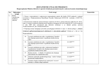 ZESTAWIENIE UWAG DO PROJEKTU Rozporządzenia Ministra Zdrowia w sprawie świadczeń gwarantowanych z zakresu leczenia stomatologicznego Lp. 1. Zgłaszający uwagi Prezes Narodowego Funduszu Zdrowia Stanowisko Treść uwagi 1. Proszę o wprowadzenie w najnowszym rozporządzeniu opisów dla kodów ICD-9 spójnych z opisami zawartymi w Międzynarodowej Klasyfikacji Procedur Medycznych ICD-9-CM (tożsamą z ICD-9 PL, wersja 5.8). 2. Pozostawienie świadczeń: proteza dziecięca częściowa (23.2611), proteza dziecięca całkowita (23. 2612), tylko w wykazie świadczeń ortodontycznych ograniczy dostępność do tych świadczeń (38 % tych świadczeń w roku 2009 było wykonanych poza zakresem ortodoncji ), co wzbudzi protesty zarówno świadczeniodawców, jak i świadczeniobiorców 3. Proponuję usunąć następujące procedury przysługujące kobietom w ciąży i w okresie połogu z „wykazu świadczeń ogólnostomatologicznych udzielanych w znieczuleniu ogólnym” (Tabela nr 1.; Zał. nr 3 do Rozporządzenia): 54. Leczenie endodontyczne zęba z wypełnieniem 2 kanałów (nie obejmuje opracowania i wypełnienia ubytku korony zęba) 23.1308**** 55. Leczenie endodontyczne zęba z wypełnieniem 3 kanałów (nie obejmuje opracowania i wypełnienia ubytku korony zęba) 23.1309**** 56. Leczenie endodontyczne zęba z zakażonymi kanałami z wypełnieniem 2 kanałów (nie obejmuje opracowania i wypełnienia ubytku korony zęba) 23.1312**** 57. Kiretaż otwarty – w obrębie 1/4 uzębienia (nie obejmuje znieczulenia oraz zaopatrzenia rany) 23.1608**** 60. Założenie opatrunku paradontologicznego – każde 3 kolejne przestrzenie międzyzębowe 23.1620**** 63. Usunięcie złogów nazębnych nie częściej niż 1 raz na 6 miesięcy w obrębie całego uzębienia 23.1601b***** ZESTAWIENIE UWAG DO PROJEKTU Rozporządzenia Ministra Zdrowia w sprawie świadczeń gwarantowanych z zakresu leczenia stomatologicznego 64. Badanie kontrolne nie częściej niż 1 raz na kwartał 23.0102***** **** świadczenie jest udzielane dzieciom i młodzieży do ukończenia 18. roku życia oraz kobietom w ciąży i w okresie połogu, który trwa 42 dni od dnia porodu ***** świadczenie jest udzielane kobietom w ciąży i w okresie połogu, który trwa 42 dni od dnia porodu ponieważ znieczulenie ogólne u kobiet w ciąży nie jest wskazane i może budzić kontrowersje środowiska medycznego. 4. W „wykazie świadczeń ogólnostomatologicznych dla dzieci i młodzieży do ukończenia 18. roku życia”” (Tabela nr 1.; Zał. nr 2 do Rozporządzenia), „Lp. 53” powinien zmienić brzmienie na „Lp. 52”. 5. W „wykazie świadczeń ortodoncji dla dzieci i młodzieży do ukończenia 18. roku życia”” (Tabela nr 1.; Zał. nr 6 do Rozporządzenia) objaśnienie „Leczenie ortodontyczne wad zgryzu z zastosowaniem aparatu do zdejmowania jedno- i dwuszczękowego do ukończenia 12. roku życia; kontrola wyników leczenia po jego zakończeniu w tak zwanym okresie retencji do ukończenia 13. roku życia (dotyczy dzieci leczonych w ramach świadczeń gwarantowanych); raz w roku kalendarzowym naprawa aparatu ortodontycznego wykonanego w ramach świadczeń gwarantowanych do ukończenia 13. roku życia (nie przysługuje wymiana i naprawa aparatu ortodontycznego uszkodzonego z powodu nieprawidłowego użytkowania).”, jest nieprecyzyjne, oraz zostało przypisane tylko niektórym procedurom, podczas gdy na podstawie rozporządzenia Ministra Zdrowia z dnia 24 listopada 2004 r., w sprawie wykazu gwarantowanych świadczeń lekarza dentysty i materiałów stomatologicznych oraz rodzaju dokumentu potwierdzającego uprawnienia do tych świadczeń (Dz.U.04.261.2601), świadczenia ortodoncji przysługiwały dzieciom do ukończenia 12 roku życia. Projekt zmiany Rozporządzenia (podobnie jak obecnie obowiązujące Rozporządzenie) rozszerza grupę świadczeniobiorców, którym przysługują świadczenia ortodoncji, o tych pomiędzy rokiem 13 a 18 rokiem życia. W związku z powyższym proponuję do procedur z zakresu ortodoncji wprowadzić opisy zgodnie z ZESTAWIENIE UWAG DO PROJEKTU Rozporządzenia Ministra Zdrowia w sprawie świadczeń gwarantowanych z zakresu leczenia stomatologicznego propozycją zawartą w załączniku (tabela granatowa – kolumna „Uwagi”), np.: 65 89 98 Rentgenodiagnostyka - zdjęcie pantomograficzne z opisem Obejmuje: wykonanie techniczne zdjęcia Wycisk jednej szczęki dla diagnozy, planowania i kontroli Naprawa aparatu z wyciskiem 23.0304 23.2302 23.2502 Świadczenie przysługuje1 raz w trakcie całego leczenia ortodontycznego, tj. do ukończenia 12. roku życia. Świadczenie przysługuje w powiązaniu ze świadczeniami stomatologicznymi finansowanymi ze środków publicznych W ramach leczenia ortodontycznego świadczenie przysługuje do ukończenia 12. roku życia Naprawa ruchomego aparatu ortodontycznego wykonanego w ramach świadczeń gwarantowanych do ukończenia 13. roku życia przysługuje raz w roku kalendarzowym (nie przysługuje wymiana i naprawa aparatu ortodontycznego uszkodzonego z powodu nieprawidłowego użytkowania) Zarówno zdjęcie pantomograficzne, jak i cefalometryczne jest niezbędne w trakcie leczenia ortodontycznego – stąd propozycja aby przysługiwały one do ukończenia 12. roku życia, jeśli nie będzie zapisów ograniczających – świadczeniodawcy będą mieli podstawę wykonywać przedmiotowe procedury w ramach środków z NFZ, dzieciom i młodzieży do 18. roku życia – czyli tym którym leczenie ortodontyczne już nie przysługuje, (zgodnie z tym na co wskazuje nazwa wykazu świadczeń ortodoncji), bez powiązania ich z innymi świadczeniami stomatologicznymi finansowanymi ze środków publicznych. 6. W przypadku procedur: 23.1203, 23.1204, 23.1205, 23.1208, 23.1210, 23.1308, 23.1309, 23.1312, nie wprowadzono zapisu, który funkcjonował w rozporządzeniu Ministra Zdrowia z dnia 24 listopada 2004 r., w sprawie wykazu gwarantowanych świadczeń lekarza dentysty i materia
