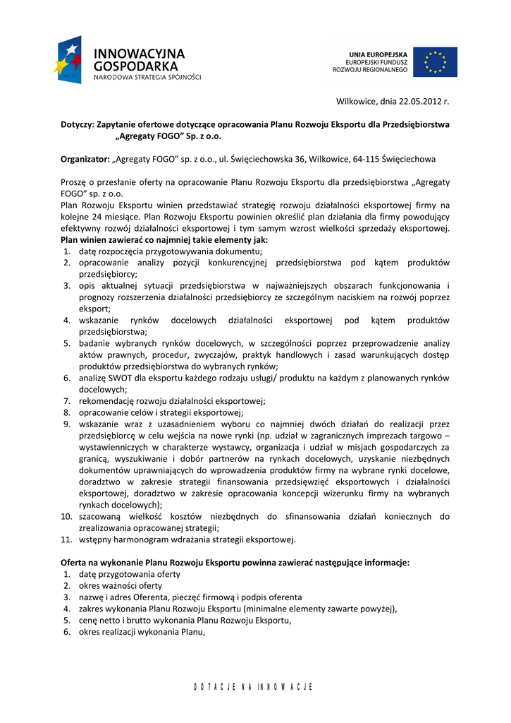 Wilkowice, dnia 22.05.2012 r. Dotyczy: Zapytanie ofertowe dotycz ce opracowania Planu Rozwoju Eksportu dla Przedsi biorstwa „Agregaty FOGO” Sp. z o.o. Organizator: „Agregaty FOGO” sp. z o.o., ul. wi ciechowska 36, Wilkowice, 64-115 wi ciechowa Prosz o przes anie oferty na opracowanie Planu Rozwoju Eksportu dla przedsi biorstwa „Agregaty FOGO” sp. z o.o. Plan Rozwoju Eksportu winien przedstawia strategi rozwoju dzia alno ci eksportowej firmy na kolejne 24 miesi ce. Plan Rozwoju Eksportu powinien okre li plan dzia ania dla firmy powoduj cy efektywny rozwój dzia alno ci eksportowej i tym samym wzrost wielko ci sprzeda y eksportowej. Plan winien zawiera co najmniej takie elementy jak: 1. dat rozpocz cia przygotowywania dokumentu; 2. opracowanie analizy pozycji konkurencyjnej przedsi biorstwa pod k tem produktów przedsi biorcy; 3. opis aktualnej sytuacji przedsi biorstwa w najwa niejszych obszarach funkcjonowania i prognozy rozszerzenia dzia alno ci przedsi biorcy ze szczególnym naciskiem na rozwój poprzez eksport; 4. wskazanie rynków docelowych dzia alno ci eksportowej pod k tem produktów przedsi biorstwa; 5. badanie wybranych rynków docelowych, w szczególno ci poprzez przeprowadzenie analizy aktów prawnych, procedur, zwyczajów, praktyk handlowych i zasad warunkuj cych dost p produktów przedsi biorstwa do wybranych rynków; 6. analiz SWOT dla eksportu ka dego rodzaju us ugi/ produktu na ka dym z planowanych rynków docelowych; 7. rekomendacj rozwoju dzia alno ci eksportowej; 8. opracowanie celów i strategii eksportowej; 9. wskazanie wraz z uzasadnieniem wyboru co najmniej dwóch dzia do realizacji przez przedsi biorc w celu wej cia na nowe rynki (np. udzia w zagranicznych imprezach targowo – wystawienniczych w charakterze wystawcy, organizacja i udzia w misjach gospodarczych za granic , wyszukiwanie i dobór partnerów na rynkach docelowych, uzyskanie niezb dnych dokumentów uprawniaj cych do wprowadzenia produktów firmy na wybrane rynki docelowe, doradztwo w zakresie strategii finansowania przedsi wzi eksportowych i dzia alno ci eksportowej, doradztwo w zakresie opracowania koncepcji wizerunku firmy na wybranych rynkach docelowych); 10. szacowan wielko kosztów niezb dnych do sfinansowania dzia koniecznych do zrealizowania opracowanej strategii; 11. wst pny harmonogram wdra ania strategii eksportowej. Oferta na wykonanie Planu Rozwoju Eksportu powinna zawiera nast puj ce informacje: 1. dat przygotowania oferty 2. okres wa no ci oferty 3. nazw i adres Oferenta, piecz firmow i podpis oferenta 4. zakres wykonania Planu Rozwoju Eksportu (minimalne elementy zawarte powy ej), 5. cen netto i brutto wykonania Planu Rozwoju Eksportu, 6. okres realizacji wykonania Planu, DOTACJE NA INNOWACJE Ocena ofert zostanie dokonana w oparciu o nast puj ce kryteria: 1. Cena netto: 60 punktów Kryterium ceny b dzie oceniane wg wzoru: Cena najni sza --------------------------------- x 60 pkt = liczba punktów ocenianej oferty Cena ocenianej oferty 2. Do wiadczenie oferenta w doradztwie eksportowym: 20% Oceniane b dzie do wiadczenie ogó em zwi zane ze zrealizowanymi przez oferenta zleceniami dotycz cymi doradztwa o charakterze eksportowym (pod uwag b brane nast puj ce us ugi: opracowane plany rozwoju eksportu, zorganizowane misje gospodarcze, zrealizowane us ugi promocji podczas zagranicznych imprez targowo-wystawienniczych, wyszukiwanie i dobór partnerów na rynkach zagranicznych, organizacja spotka z partnerami zagranicznymi). Podstaw przyznania punktów stanowi b dzie wykaz zrealizowanych us ug, z podaniem nazwy us ugi, nazwy klienta oraz terminu realizacji us ugi Kryterium b dzie oceniane wg wzoru: Badana liczba zrealizowanych us ug eksportowych ------------------------------------------------------------------------------- x 20 pkt = liczba pkt ocenianej oferty Najwi ksza liczba us ug eksportowych w ród z onych ofert 3. Warunki p atno ci: 20 pkt Podstaw przyznania punktów stanowi b dzie wskazana przez oferenta liczba dni na dokonanie zap aty, liczona od daty przekazania przedmiotu zamówienia protoko em zdawczo-odbiorczym: - zap ata w ci gu 14 dni – 5 pkt - zap ata w ci gu 30 dni – 10 pkt - zap ata w ci gu 60 dni – 15 pkt - zap ata w ci gu 90 lub wi cej dni – 20 pkt Zwyci zc zostanie Oferent, którego oferta zdob dzie najwy sz liczb punktów po zsumowaniu punktacji we wszystkich kryteriach. Termin sk adania ofert: do 29 maja 2012 r. – osobi cie, poczt tradycyjn lub elektroniczn na adres: Agregaty FOGO Sp. z o.o., ul. wi ciechowska 36, Wilkowice, 64-115 wi ciechowa e-mail: [email protected] Osoba do kontaktu: Ewa Gmerek, tel. 65 534 11 80 w. 103 Z powa aniem Tomasz B aszak DOTACJE NA INNOWACJE