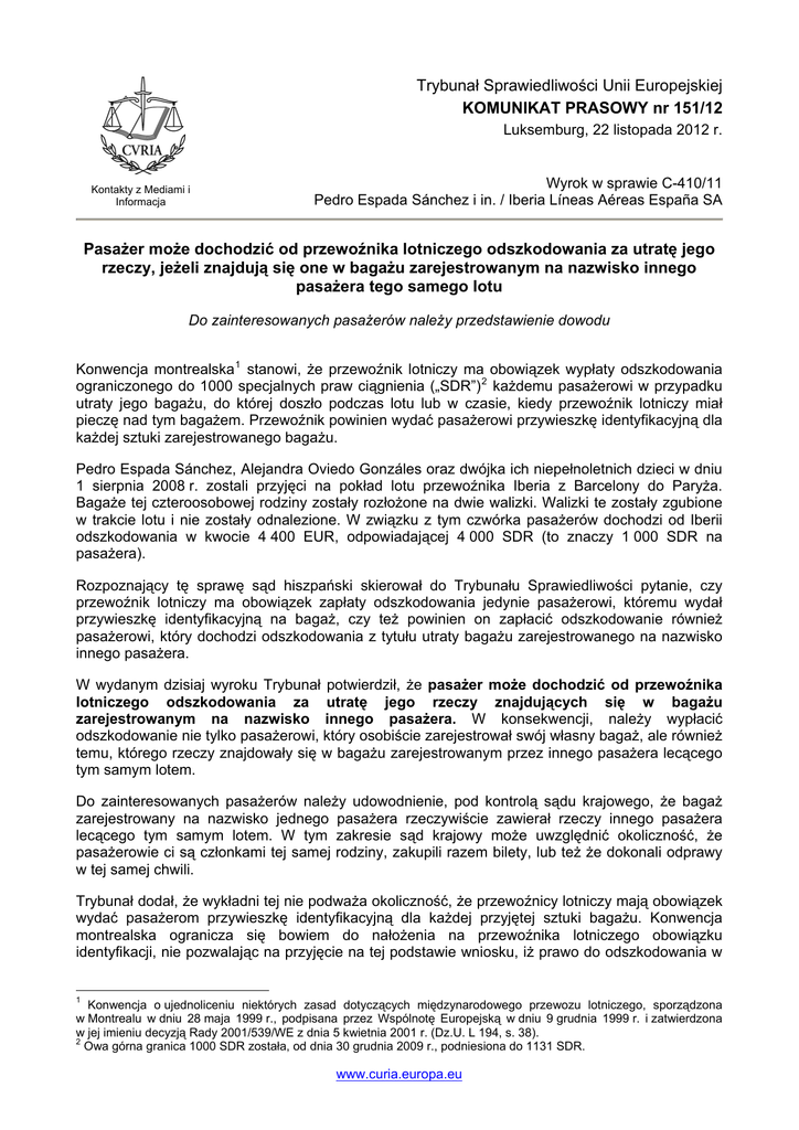 Trybunał Sprawiedliwości Unii Europejskiej KOMUNIKAT PRASOWY nr 151/12 Luksemburg, 22 listopada 2012 r. Kontakty z Mediami i Informacja Wyrok w sprawie C-410/11 Pedro Espada Sánchez i in. / Iberia Líneas Aéreas España SA Pasażer może dochodzić od przewoźnika lotniczego odszkodowania za utratę jego rzeczy, jeżeli znajdują się one w bagażu zarejestrowanym na nazwisko innego pasażera tego samego lotu Do zainteresowanych pasażerów należy przedstawienie dowodu Konwencja montrealska 1 stanowi, że przewoźnik lotniczy ma obowiązek wypłaty odszkodowania ograniczonego do 1000 specjalnych praw ciągnienia („SDR”) 2 każdemu pasażerowi w przypadku utraty jego bagażu, do której doszło podczas lotu lub w czasie, kiedy przewoźnik lotniczy miał pieczę nad tym bagażem. Przewoźnik powinien wydać pasażerowi przywieszkę identyfikacyjną dla każdej sztuki zarejestrowanego bagażu. Pedro Espada Sánchez, Alejandra Oviedo Gonzáles oraz dwójka ich niepełnoletnich dzieci w dniu 1 sierpnia 2008 r. zostali przyjęci na pokład lotu przewoźnika Iberia z Barcelony do Paryża. Bagaże tej czteroosobowej rodziny zostały rozłożone na dwie walizki. Walizki te zostały zgubione w trakcie lotu i nie zostały odnalezione. W związku z tym czwórka pasażerów dochodzi od Iberii odszkodowania w kwocie 4 400 EUR, odpowiadającej 4 000 SDR (to znaczy 1 000 SDR na pasażera). Rozpoznający tę sprawę sąd hiszpański skierował do Trybunału Sprawiedliwości pytanie, czy przewoźnik lotniczy ma obowiązek zapłaty odszkodowania jedynie pasażerowi, któremu wydał przywieszkę identyfikacyjną na bagaż, czy też powinien on zapłacić odszkodowanie również pasażerowi, który dochodzi odszkodowania z tytułu utraty bagażu zarejestrowanego na nazwisko innego pasażera. W wydanym dzisiaj wyroku Trybunał potwierdził, że pasażer może dochodzić od przewoźnika lotniczego odszkodowania za utratę jego rzeczy znajdujących się w bagażu zarejestrowanym na nazwisko innego pasażera. W konsekwencji, należy wypłacić odszkodowanie nie tylko pasażerowi, który osobiście zarejestrował swój własny bagaż, ale również temu, którego rzeczy znajdowały się w bagażu zarejestrowanym przez innego pasażera lecącego tym samym lotem. Do zainteresowanych pasażerów należy udowodnienie, pod kontrolą sądu krajowego, że bagaż zarejestrowany na nazwisko jednego pasażera rzeczywiście zawierał rzeczy innego pasażera lecącego tym samym lotem. W tym zakresie sąd krajowy może uwzględnić okoliczność, że pasażerowie ci są członkami tej samej rodziny, zakupili razem bilety, lub też że dokonali odprawy w tej samej chwili. Trybunał dodał, że wykładni tej nie podważa okoliczność, że przewoźnicy lotniczy mają obowiązek wydać pasażerom przywieszkę identyfikacyjną dla każdej przyjętej sztuki bagażu. Konwencja montrealska ogranicza się bowiem do nałożenia na przewoźnika lotniczego obowiązku identyfikacji, nie pozwalając na przyjęcie na tej podstawie wniosku, iż prawo do odszkodowania w 1 Konwencja o ujednoliceniu niektórych zasad dotyczących międzynarodowego przewozu lotniczego, sporządzona w Montrealu w dniu 28 maja 1999 r., podpisana przez Wspólnotę Europejską w dniu 9 grudnia 1999 r. i zatwierdzona w jej imieniu decyzją Rady 2001/539/WE z dnia 5 kwietnia 2001 r. (Dz.U. L 194, s. 38). 2 Owa górna granica 1000 SDR została, od dnia 30 grudnia 2009 r., podniesiona do 1131 SDR. www.curia.europa.eu przypadku utraty bagażu ma zastosowanie wyłącznie do pasażera, który zarejestrował jedną lub kilka sztuk bagażu. Wniosek ten potwierdzają ponadto cele założone przez konwencję montrealską, która zmierza do zapewnienia ochrony interesów konsumentów w dziedzinie międzynarodowego transportu lotniczego i do zapewnienia im słusznego odszkodowania opartego na zasadzie naprawienia szkody. UWAGA: Odesłanie prejudycjalne pozwala sądom państw członkowskich, w ramach rozpatrywanego przez nie sporu, zwrócić się do Trybunału z pytaniem o wykładnię prawa Unii lub o ocenę ważności aktu Unii. Trybunał nie rozpoznaje sporu krajowego. Do sądu krajowego należy rozstrzygnięcie sprawy zgodnie z orzeczeniem Trybunału. Orzeczenie to wiąże w ten sam sposób inne sądy krajowe, które spotkają się z podobnym problemem. Dokument nieoficjalny, sporządzony na użytek mediów, który nie wiąże Trybunału Sprawiedliwości. Pełny tekst wyroku znajduje się na stronie internetowej CURIA w dniu ogłoszenia Osoba odpowiedzialna za kontakty z mediami: Ireneusz Kolowca (+352) 4303 2793 Nagranie wideo z ogłoszenia wyroku jest dostępne przez „Europe by Satellite” (+32) 2 2964106 www.curia.europa.eu