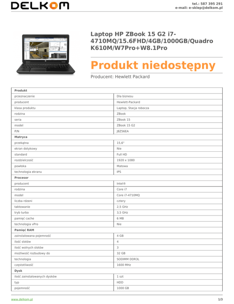 tel.: 587 395 291 e-mail: [email protected] Laptop HP ZBook 15 G2 i74710MQ/15.6FHD/4GB/1000GB/Quadro K610M/W7Pro+W8.1Pro Produkt niedostępny Producent: Hewlett Packard Produkt przeznaczenie Dla biznesu producent Hewlett-Packard klasa produktu Laptop, Stacja robocza rodzina ZBook seria ZBook 15 model ZBook 15 G2 P/N J8Z56EA Matryca przekątna 15,6" ekran dotykowy Nie standard Full HD rozdzielczość 1920 x 1080 powłoka Matowa technologia ekranu IPS Procesor producent Intel® rodzina Core i7 model Core i7-4710MQ liczba rdzeni cztery taktowanie 2,5 GHz tryb turbo 3,5 GHz pamięć cache 6 MB technologia vPro Nie Pamięć RAM zainstalowana pojemność 4 GB ilość slotów 4 ilość wolnych slotów 3 możliwość rozbudowy do 32 GB technologia SODIMM DDR3L częstotliwość 1600 MHz Dysk ilość zainstalowanych dysków 1 szt typ HDD pojemność 1000 GB www.delkom.pl 1/3 tel.: 587 395 291 e-mail: [email protected] interfejs SATA II prędkość obrotowa 7200 rpm wolne sloty 1x M.2 Karta graficzna producent karty zintegrowanej Intel® model karty zintegrowanej HD Graphics 4600 producent karty dedykowanej nVidia® model karty dedykowanej Quadro K610M pamięć karty dedykowanej 1 GB Napędy napęd optyczny Nagrywarka DVD Multimedia karta dźwiękowa HD Audio głośniki ilość 2 wbudowana kamera 2,0 Mpix wbudowany mikrofon Tak czytnik kart pamięci Tak Komunikacja karta sieciowa przewodowa 10/100/1000 Mbps typ bezprzewodowej karty sieciowej 802.11 b/g/n/ac wbudowany modem Możliwość wbudownia bluetooth 4.0 NFC (near field connection) Nie WiDi (Intel® Wireless Display) Tak Interfejsy WE/WY HDMI Brak Display Port 1 szt VGA (RGB) 1 szt USB 3.0 3 szt USB 2.0 1 szt thunderbolt 1 szt RJ-45 [LAN] 1 szt wyjście słuchawkowe Combo wejście mikrofonu Combo złącze stacji dokującej Dedykowane Klawiatura układ klawiatury Qwerty (International) panel numeryczny Tak podświetlenie Tak odporność na zalanie Tak Urządzenie wskazujące typ 1 Touchpad typ 2 Trackpoint System operacyjny wersja www.delkom.pl Windows 7 Professional, Windows 8.1 Professional 2/3 tel.: 587 395 291 e-mail: [email protected] architektura 64 bit wersja językowa polska Systemy zabezpieczeń gniazdo na blokadę Kensington Tak czytnik linii papilarnych Tak moduł TPM Tak czytnik Smart Card Tak Akumulator technologia Litowo-jonowa ilość komór 8 komorowa pojemność baterii 75 Wh przybliżony czas pracy Do 13 godzin Właściwości fizyczne materiał obudowy Aluminium, Stop magnezu wzmocniona konstrukcja Tak kolor obudowy Grafitowy kolor pokrywy Grafitowy kolor klawiatury Czarny kolor ramki matrycy Czarny waga 3 kg wysokość (mm) 36 szerokość (mm) 382 głębokość (mm) 257 Gwarancja typ gwarancji Producenta rodzaj gwarancji Carry-In/Door-To-Door (dostarczenie do serwisu) gwarancja czas trwania 36 miesięcy międzynarodowa Nie Pozostałe informacje dodatkowe informacje www.delkom.pl 1 x ExpressCard/54 3/3