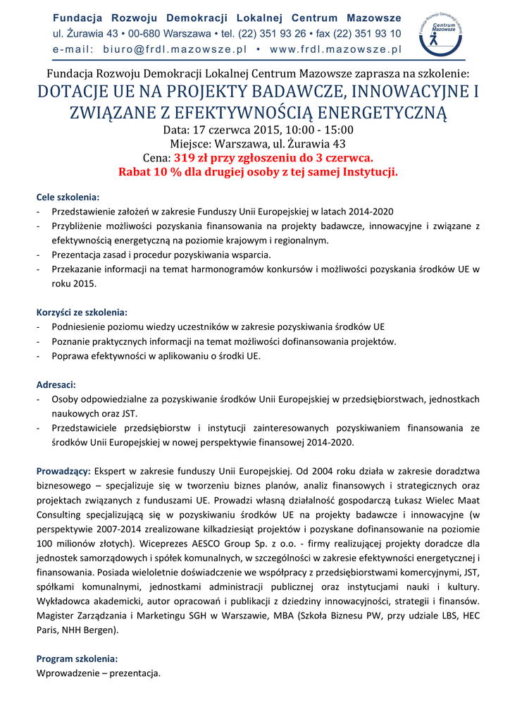 Fundacja Rozwoju Demokracji Lokalnej Centrum Mazowsze zaprasza na szkolenie: DOTACJE UE NA PROJEKTY BADAWCZE, INNOWACYJNE I ZWIĄZANE Z EFEKTYWNOŚCIĄ ENERGETYCZNĄ Data: 17 czerwca 2015, 10:00 - 15:00 Miejsce: Warszawa, ul. Żurawia 43 Cena: 319 zł przy zgłoszeniu do 3 czerwca. Rabat 10 % dla drugiej osoby z tej samej Instytucji. Cele szkolenia: - Przedstawienie założeń w zakresie Funduszy Unii Europejskiej w latach 2014-2020 - Przybliżenie możliwości pozyskania finansowania na projekty badawcze, innowacyjne i związane z efektywnością energetyczną na poziomie krajowym i regionalnym. - Prezentacja zasad i procedur pozyskiwania wsparcia. - Przekazanie informacji na temat harmonogramów konkursów i możliwości pozyskania środków UE w roku 2015. Korzyści ze szkolenia: - Podniesienie poziomu wiedzy uczestników w zakresie pozyskiwania środków UE - Poznanie praktycznych informacji na temat możliwości dofinansowania projektów. - Poprawa efektywności w aplikowaniu o środki UE. Adresaci: - Osoby odpowiedzialne za pozyskiwanie środków Unii Europejskiej w przedsiębiorstwach, jednostkach naukowych oraz JST. - Przedstawiciele przedsiębiorstw i instytucji zainteresowanych pozyskiwaniem finansowania ze środków Unii Europejskiej w nowej perspektywie finansowej 2014-2020. Prowadzący: Ekspert w zakresie funduszy Unii Europejskiej. Od 2004 roku działa w zakresie doradztwa biznesowego – specjalizuje się w tworzeniu biznes planów, analiz finansowych i strategicznych oraz projektach związanych z funduszami UE. Prowadzi własną działalność gospodarczą Łukasz Wielec Maat Consulting specjalizującą się w pozyskiwaniu środków UE na projekty badawcze i innowacyjne (w perspektywie 2007-2014 zrealizowane kilkadziesiąt projektów i pozyskane dofinansowanie na poziomie 100 milionów złotych). Wiceprezes AESCO Group Sp. z o.o. - firmy realizującej projekty doradcze dla jednostek samorządowych i spółek komunalnych, w szczególności w zakresie efektywności energetycznej i finansowania. Posiada wieloletnie doświadczenie we współpracy z przedsiębiorstwami komercyjnymi, JST, spółkami komunalnymi, jednostkami administracji publicznej oraz instytucjami nauki i kultury. Wykładowca akademicki, autor opracowań i publikacji z dziedziny innowacyjności, strategii i finansów. Magister Zarządzania i Marketingu SGH w Warszawie, MBA (Szkoła Biznesu PW, przy udziale LBS, HEC Paris, NHH Bergen). Program szkolenia: Wprowadzenie – prezentacja. 1. Fundusze Europejskie w Nowej Perspektywie Finansowej 2014-2020. 2. Procedury pozyskiwania dofinansowania ze środków Unii Europejskiej. 3. Projekty badawcze, innowacyjne i wspierające efektywność energetyczną. Dotacje UE na działalność badawczą, innowacyjną i poprawę efektywności energetycznej – prezentacja i ćwiczenia praktyczne. 4. Projekty badawcze – dostępne programy na poziomie krajowym i regionalnym, harmonogram konkursów, wymagania i kryteria oceny projektów, specyfika projektów badawczych – wartość naukowa projektu, metodologia i plan badań, Krajowe Inteligentne Specjalizacje, zespół badawczy, budżet projektu. 5. Projekty innowacyjne – dostępne programy, harmonogram naboru wniosków, wymagania i kryteria wyboru, specyfika projektów innowacyjnych – innowacyjność projektu, Krajowe Inteligentne Specjalizacje, budżet projektu, efekty ekonomiczne projektu. 6. Projekty wspierające efektywność energetyczną - – dostępne programy na poziomie krajowym i regionalnym, harmonogram konkursów, wymagania i kryteria oceny projektów, specyfika projektów – efekt ekologiczny, efektywność ekonomiczna projektów. 7. Podsumowanie – praktyczne aspekty pozyskiwania środków UE w Nowej Perspektywie Finansowej 2014-2020. Praktyczne ćwiczenia w zakresie definiowania projektów, określania celów i zadań oraz budżetu i wskaźników projektu. ZGŁOSZENIE DOTACJE UE NA PROJEKTY BADAWCZE, INNOWACYJNE I ZWIĄZANE Z EFEKTYWNOŚCIĄ ENERGETYCZNĄ Data: 17 czerwca 2015, 10:00 - 15:00 Miejsce: Warszawa, ul. Żurawia 43 Cena: 319 zł przy zgłoszeniu do 3 czerwca. Rabat 10 % dla drugiej osoby z tej samej Instytucji. Instytucja (dane do faktury): ................................................................................................ Adres: ................................................................................................................................. NIP: ..................................................................................................................................... L.p. Imię i nazwisko Wydział tel. e-mail 1.......................................................................................................................................... 2.......................................................................................................................................... 3.......................................................................................................................................... ........................................................... podpis i pieczątka osoby delegującej Zgłoszenia prosimy przesyłać do 10 czerwca 2015 r. fax: (22) 351 93 10, e-mail: [email protected] lub wybrać opcje zapisu przez stronę www.frdl.mazowsze.pl Przy zgłoszeniu w ramach Forów prosimy o wpisanie w uwagach: „Zgłoszenie w ramach Forum (nazwa odpowiedniego Forum)”. Ewentualną rezygnację ze szkolenia można zgłosić najpóźniej na dwa dni robocze przed szkoleniem. W przypadku niewykorzystania zgłoszonego uczestnictwa - Urząd będzie zobowiązany do sfinansowania 60% odpłatności za uczestnictwo i materiały. FRDL zastrzega sobie prawo odwołania szkolenia. Miejsce szkolenia: Warszawa, ul. Żurawia 43. Lokalizacja 300 metrów od Metra Centrum. Cena: 319 zł netto przy zgłoszeniu do 3 czerwca. Cena po 3 czerwca to 369 zł. Rabat 10 % dla drugiej osoby z tej samej Instytucji. Zwolnienie z VAT w przypadku finansowania 
