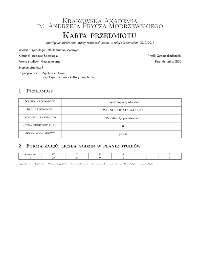 Krakowska Akademia im. Andrzeja Frycza Modrzewskiego Karta przedmiotu obowiązuje studentów, którzy rozpoczęli studia w roku akademickim 2012/2013 WydziałPsychologii i Nauk Humanistycznych Kierunek studiów: Socjologia Profil: Ogólnoakademicki Forma studiów: Niestacjonarne Kod kierunku: SOC Stopień studiów: I Specjalności: 1 2 Psychosocjologia Socjologia mediów i kultury popularnej Przedmiot Nazwa przedmiotu Psychologia społeczna Kod przedmiotu WPINH SOCA1N A4 12/13 Kategoria przedmiotu Przedmioty podstawowe Liczba punktów ECTS 6 Język wykładowy polski Forma zajęć, liczba godzin w planie studiów Semestr 1 W 20 C 20 K 0 S 0 L 0 Legenda: W — WykładC — Ćwiczenia/językiK — KonwersatoriumS — SeminariumL — Laboratorium, WarsztatyI — Inne, Praktyki I 0 Krakowska Akademia im. Andrzeja Frycza Modrzewskiego 3 Cele przedmiotu Cel 1 Zapoznanie uczestników ze stanem wiedzy współczesnej psychologii społecznej. Cel 2 Pokazanie podstawowych czynników społecznych wpływających na zachowanie jednostki. 4 Wymagania wstępne 1 brak wymagań 5 Modułowe efekty kształcenia MW1 Student będzie potrafił scharakteryzować najważniejsze nurty teoretyczne w psychologii społecznej. MU2 Student samodzielnie wyszuka istotne dla rozwiązania jakiegoś zagadnienia z zakresu psychologii społecznej informacje dostępne w literaturze przedmiotu (w tym w zbiorach elektronicznych). MK3 Student będzie potrafił posługiwać się podstawowymi pojęciami z zakresu psychologii społecznej umożliwiającymi analizowanie i rozumienie otaczających go zjawisk psychologicznych. MW4 Student będzie znał aplikacyjne aspekty wiedzy teoretycznej którą posiada. 6 Treści programowe Lp W1 W2 W3 W4 W5 W6 W7 W8 Wykład Tematyka zajęć Opis szczegółowy bloków tematycznych Psychologia społeczna jako nauka. Dziedziny psychologii społecznej. Podstawowe podejścia teoretyczne w psychologii społecznej: poznawcze, motywacyjne, wynikające z teorii uczenia, ewolucjonistyczne i społeczno-kulturowe. społecznej. Poznanie społeczne. Specyfika poznania społecznego. Uwaga i odbiór informacji społecznej. Struktury wiedzy społecznej: schematy ja; skrypty społeczne; stereotypy. Procesy aktywizacji i aplikacji struktur wiedzy. Motywowane poznanie: motywacja a poznanie wzajemne relacje. Metafora motywowanego taktyka w poznaniu społecznym. Naiwne teorie natury ludzkiej. Ukryte teorie osobowości. Teoria sprawcy i odbiorcy Wojciszke. Ja i jego rola w procesach interpersonalnych. Kwestie definicyjne rozumienie ja. Rozwój ja społecznego. Ja odzwierciedlone. Źródła wiedzy o własnej osobie: introspekcja, autopercepcja, porównania społeczne). Procesy atrybucji. Błędy atrybucyjne. Grupa i procesy grupowe. Czym jest grupa? Tożsamość społeczna. Aktywność grupowa. Facylitacja i inhibicja społeczna, Próżniactwo społeczne. Rodzaje zadań grupowych. Rywalizacja i współpraca. Postawy i zmiana postaw. Sztuka przekonywania i perswazji. Wpływ społeczny (mechanizmy i konsekwencje). Postawy i wartości. Struktura wartości. Struktura i funkcje postaw. Geneza postaw. Teorie i mechanizmy zmian postaw. Związek postaw z zachowaniem. Psychologiczne aspekty kształtowania postaw. Wpływ społeczny. Posłuszeństwo, uległość, konformizm. Normy społeczne. Wpływ mniejszości na większość. Wpływ społeczny a manipulacja. Mechanizmy i taktyki wywierania wpływu społecznego. Stereotypy i uprzedzenia. Źródła uprzedzeń. Różnice indywidualne jako determinanty uprzedzeń (autorytaryzm, orientacja na dominacje społeczną). Rola motywacji w kształtowaniu uprzedzeń. Teorie relacji międzygrupowych w wyjaśnianiu uprzedzeń. Badania Sheriffa, paradygmat grupy minimalnej. Agresja. Teorie agresji. Wyznaczniki agresji. Konflikt, asertywność i negocjacje. Degeneracja form życia społecznego (agresja interpersonalna, społeczne sankcjonowanie zła, problematyka przemocy). Alkohol, pornografia, prowokacja a agresja. Wpływ mediów na poziom agresji i przemocy w społeczeństwie. Strona 2/6 Liczba godzin 2 2 2 2 2 2 2 2 Krakowska Akademia im. Andrzeja Frycza Modrzewskiego Lp W9 W10 Wykład Tematyka zajęć Opis szczegółowy bloków tematycznych Zachowania prospołeczne. Źródła zachowań prospołecznych (perspektywa ewolucyjna, normy społeczne, modelowanie). Sytuacyjne determinanty zachowań prospołecznych (model Latane i Datleya; model Piliavin). Osobowe determinanty zachowań pomocowych (osobowość, kompetencje, nastrój, empatia, różnice związane z płcią, podobieństwo, przynależność grupowa, atrakcyjność, odpowiedzialność za niepowodzenie). Problematyka biorcy zachowań pomocowych. Atrakcyjność interpersonalna. Teorie i wyznaczniki atrakcyjności interpersonalnej. Autoprezentacja. Obronne i asertywne taktyki autoprezentacji. Intrapersonalne i interpersonalne konsekwencje autoprezentacji. Razem Strona 3/6 Liczba godzin 2 2 20 Krakowska Akademia im. Andrzeja Frycza Modrzewskiego Lp C1 Ćwiczenia/języki Tematyka zajęć Opis szczegółowy bloków tematycznych Psychologia społeczna jako nauka. Dziedziny psychologii społecznej. Podstawowe podejścia teoretyczne w psychologii społecznej: poznawcze, motywacyjne, wynikające z teorii uczenia, ewolucjonistyczne i społeczno-kulturowe. społecznej. Poznanie społeczne. Specyfika poznania społecznego. Uwaga i odbiór informacji społecznej. Struktury wiedzy społecznej: schematy ja; skrypty społeczne; stereotypy. Procesy aktywizacji i aplikacji struktur wiedzy. Motywowane poznanie: motywacja a poznanie wzajemne relacje. Metafora motywowanego taktyka w poznaniu społecznym. Naiwne teorie natury ludzkiej. Ukryte teorie osobowości. Teoria sprawcy i odbiorcy Wojciszke. Ja i jego rola w procesach interpersonalnych. Kwestie definicyjne rozumienie ja. Rozwój ja społecznego. Ja odzwierciedlone. Źródła wiedzy o własnej osobie: introspekcja, autopercepcja, porównania społeczne). Procesy atrybucji. Błędy atrybucyjne. Grupa i p