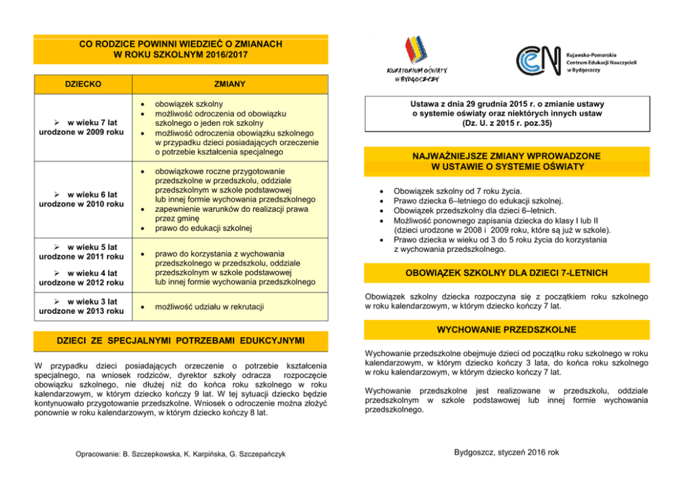 5 CO RODZICE POWINNI WIEDZIEĆ O ZMIANACH W ROKU SZKOLNYM 2016/2017 DZIECKO w wieku 7 lat urodzone w 2009 roku ZMIANY w wieku 6 lat urodzone w 2010 roku w wieku 5 lat urodzone w 2011 roku obowiązkowe roczne przygotowanie przedszkolne w przedszkolu, oddziale przedszkolnym w szkole podstawowej lub innej formie wychowania przedszkolnego zapewnienie warunków do realizacji prawa przez gminę prawo do edukacji szkolnej Ustawa z dnia 29 grudnia 2015 r. o zmianie ustawy o systemie oświaty oraz niektórych innych ustaw (Dz. U. z 2015 r. poz.35) NAJWAŻNIEJSZE ZMIANY WPROWADZONE W USTAWIE O SYSTEMIE OŚWIATY w wieku 4 lat urodzone w 2012 roku w wieku 3 lat urodzone w 2013 roku obowiązek szkolny możliwość odroczenia od obowiązku szkolnego o jeden rok szkolny możliwość odroczenia obowiązku szkolnego w przypadku dzieci posiadających orzeczenie o potrzebie kształcenia specjalnego prawo do korzystania z wychowania przedszkolnego w przedszkolu, oddziale przedszkolnym w szkole podstawowej lub innej formie wychowania przedszkolnego możliwość udziału w rekrutacji Obowiązek szkolny od 7 roku życia. Prawo dziecka 6–letniego do edukacji szkolnej. Obowiązek przedszkolny dla dzieci 6–letnich. Możliwość ponownego zapisania dziecka do klasy I lub II (dzieci urodzone w 2008 i 2009 roku, które są już w szkole). Prawo dziecka w wieku od 3 do 5 roku życia do korzystania z wychowania przedszkolnego. OBOWIĄZEK SZKOLNY DLA DZIECI 7-LETNICH Obowiązek szkolny dziecka rozpoczyna się z początkiem roku szkolnego w roku kalendarzowym, w którym dziecko kończy 7 lat. WYCHOWANIE PRZEDSZKOLNE DZIECI ZE SPECJALNYMI POTRZEBAMI EDUKCYJNYMI W przypadku dzieci posiadających orzeczenie o potrzebie kształcenia specjalnego, na wniosek rodziców, dyrektor szkoły odracza rozpoczęcie obowiązku szkolnego, nie dłużej niż do końca roku szkolnego w roku kalendarzowym, w którym dziecko kończy 9 lat. W tej sytuacji dziecko będzie kontynuowało przygotowanie przedszkolne. Wniosek o odroczenie można złożyć ponownie w roku kalendarzowym, w którym dziecko kończy 8 lat. Opracowanie: B. Szczepkowska, K. Karpińska, G. Szczepańczyk Wychowanie przedszkolne obejmuje dzieci od początku roku szkolnego w roku kalendarzowym, w którym dziecko kończy 3 lata, do końca roku szkolnego w roku kalendarzowym, w którym dziecko kończy 7 lat. Wychowanie przedszkolne jest realizowane w przedszkolu, oddziale przedszkolnym w szkole podstawowej lub innej formie wychowania przedszkolnego. Bydgoszcz, styczeń 2016 rok SZKOŁA PRZEDSZKOLE DZIECI 6-latki ZMIANY 7-latki Od roku szkolnego 2016/2017 obowiązkiem szkolnym objęte są dzieci od 7 roku życia. ZMIANY Dziecko w wieku 6 lat jest obowiązane odbyć roczne przygotowanie przedszkolne w przedszkolu, oddziale przedszkolnym w szkole podstawowej lub innej formie wychowania przedszkolnego. Na wniosek rodziców dziecko, które w danym roku kalendarzowym kończy 6 lat, może rozpocząć naukę w szkole podstawowej, jeśli: 3, 4, 5-latki UCZNIOWIE korzystało z wychowania przedszkolnego w roku szkolnym poprzedzającym rok szkolny, w którym ma rozpocząć naukę w szkole podstawowej albo posiada opinię o możliwości rozpoczęcia nauki w szkole podstawowej, wydaną przez publiczną lub niepubliczną poradnię psychologiczno-pedagogiczną. Od 1 września 2016 r. dziecko w wieku 4 i 5 lat ma prawo do korzystania z wychowania przedszkolnego, a od 2017 r. - takie samo prawo będzie miało dziecko 3-letnie. Zapewnienie warunków do realizacji prawa jest zadaniem własnym gminy. Rozpoczęcie spełniania przez dziecko obowiązku szkolnego może być odroczone o jeden rok szkolny na wniosek rodziców złożony do dyrektora szkoły, nie później niż do 31 sierpnia. Rodzice do wniosku muszą dołączyć opinię z poradni psychologiczno-pedagogicznej. W ustawie wprowadzono przepisy przejściowe obowiązujące w roku szkolnym 2016/2017. Zgodnie z tymi przepisami, na wniosek rodziców złożony do 31 marca 2016 roku do dyrektora szkoły, w roku szkolnym 2016/2017 do klasy pierwszej i drugiej mogą ponownie uczęszczać dzieci: urodzone w 2009 roku, które w roku szkolnym 2015/2016 rozpoczęły naukę w klasie pierwszej urodzone w I połowie 2008 roku, które w roku szkolnym 2015/2016 uczęszczają do klasy drugiej szkoły podstawowej. Dzieci te nie biorą udziału w postępowaniu rekrutacyjnym, nie podlegają klasyfikacji rocznej, a tym samym promowaniu oraz nie otrzymują świadectwa szkolnego promocyjnego.