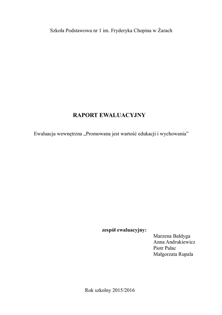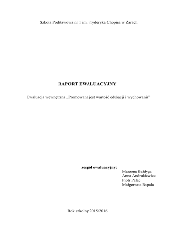Szkoła Podstawowa nr 1 im. Fryderyka Chopina w Żarach RAPORT EWALUACYJNY Ewaluacja wewnętrzna „Promowana jest wartość edukacji i wychowania” zespół ewaluacyjny: Marzena Bałdyga Anna Andrukiewicz Piotr Pałac Małgorzata Rupala Rok szkolny 2015/2016 Przedmiot ewaluacji: Promowana jest wartość edukacji i wychowania cele ewaluacji: Pozyskanie informacji na temat zainteresowania pracą szkoły i jej osiągnięciami. Zweryfikowanie działań promocyjnych szkoły. Pozyskanie informacji, w jakim stopniu promowana jest w szkole wartość edukacji. Wypracowanie sposobów promowania właściwych postaw i zachowań wśród uczniów w różnych okolicznościach. w razie potrzeby opracowanie planu działań mających na celu poprawę efektywności działań szkoły w zakresie promocji edukacji i wychowania. Pytania kluczowe: Czy szkoła prezentuje i upowszechnia informacje o swojej ofercie edukacyjnej oraz podejmowanych działaniach i osiągnięciach? W jaki sposób? Jakie informacje na temat pracy szkoły są upowszechniane? Czy pojawiają się w tym przekazie informacje o celowości i skuteczności podejmowanych przez szkołę działań? Jakie informacje o szkole i uczniach powinny być upowszechniane z punktu widzenia szkoły oraz z punktu widzenia środowiska lokalnego i partnerów szkoły? W jaki sposób promowane są w szkole indywidualne talenty i uzdolnienia? Jak wygląda organizacja i przebieg szkolnych uroczystości i imprez z uwzględnieniem postaw uczniów i nauczycieli? kryteria ewaluacji / wskaźniki: 1. Szkoła prezentuje i upowszechnia informacje o ofercie edukacyjnej oraz podejmowanych działaniach i osiągnięciach. 2. Szkoła informuje środowisko o celowości i skuteczności podejmowanych przez nią działań. 3. Szkoła promuje wartość edukacji i wychowania we własnym środowisku i na zewnątrz. 4. Szkoła jest pozytywnie odbierana w środowisku lokalnym. 5. Uczniowie chętnie podejmują wysiłek edukacyjny na miarę swoich możliwości. 6. Uczniowie szanują mienie szkoły. 7. Uczniowie godnie uczestniczą w uroczystościach, apelach, imprezach. 8. Uczniowie szanują osoby dorosłe oraz siebie nawzajem. grupa badawcza: uczniowie rodzice nauczyciele dyrekcja szkoły pedagog psycholog stosowane metody i narzędzia badawcze: analiza dokumentów ankieta dla dyrektora ankieta dla wicedyrektora ankieta dla pedagoga ankieta dla rodziców ankieta dla nauczycieli ankieta dla uczniów obserwacje rozmowy wg potrzeb wstęp: Ewaluacja wewnętrzna w obszarze 3 : Funkcjonowanie placówki w środowisku lokalnym, wymaganie 3: Promowana jest wartość edukacji i wychowania, została przeprowadzona na podstawie: Rozporządzenia Ministra Edukacji Narodowej z dnia 7 października 2009 roku w sprawie nadzoru pedagogicznego (Dz. U. z dnia 9 października 2009 r.) ze zmianami rozporządzenia z dnia 27 sierpnia 2015 r. Prezentowany raport jest rezultatem ewaluacji wewnętrznej przeprowadzonej w Szkole Podstawowej nr 1 im. Fryderyka Chopina w Żarach przez zespół nauczycieli w składzie: Marzena Bałdyga – lider, Anna Andrukiewicz, Małgorzata Rupala, Piotr Pałac. Podczas autorefleksji i analizy zostały poddane badaniom dokonania pracy nauczycieli i dyrektora szkoły czyli funkcjonowanie szkoły w środowisku. W grudniu 2015 roku poddano badaniom 100 uczniów z losowo wybranych klas: kl. 3d – 18, kl. 4a – 19, kl. 4b – 21, kl. 4c – 18, kl. 5a – 24 oraz 87 rodziców. W badaniach wzięli również udział dyrektor, wicedyrektorzy szkoły, pedagog, a także 24 nauczycieli. Podczas ewaluacji zastosowano różne narzędzia badawcze. Poddano analizie dokumentację szkoły, przeprowadzono szereg obserwacji i rozmów oraz poddano badaniom ankietowym rodziców oraz uczniów. Ankietowani mieli możliwość dokonania wielorakich wyborów, a większość pytań miała charakter otwarty. Analiza wg wskaźników 1. Szkoła prezentuje i upowszechnia informacje o ofercie edukacyjnej oraz podejmowanych działaniach i osiągnięciach. Wymień, w jakich działaniach szkoły brałaś/-eś udział (np. konkursy, imprezy, zajęcia itp.)? (ankieta – uczeń pyt.1) kl. 3d kl. 4a kl. 4b kl. 4c kl. 5a Razem Brak odpowiedzi 3 2 1 4 6 16 1 działanie 5 6 - 2 1 14 Więcej niż 1 działanie 10 11 20 12 17 70 wnioski: 1. Uczniowie bardzo aktywnie uczestniczą w różnych zajęciach pozalekcyjnych, 2. 84% uczniów wymienia przynajmniej jedno działanie, w którym uczestniczy, 3. 16% uczniów nie bierze udziału w żadnych dodatkowych działaniach podejmowanych przez szkołę, 4. klasa 4b jest najsilniej zmotywowana do podejmowania różnych działań, 5. klasa 5a jest również bardzo zmotywowana do podejmowania różnych działań, jednak duża liczba dzieci z tej samej klasy nie udzieliła odpowiedzi na to pytanie. Działania dodatkowe wymieniane przez uczniów: klasa 3d • konkurs ZUCH - 4 • konkurs logicznego myślenia - 2 • reedukacja - 2 • zajęcia z pedagogiem - 1 • zajęcia z psychologiem - 1 • konkursy przedmiotowe - 1 • język niemiecki - 1 • religia - 1 • zajęcia matematyczne • z poprawną polszczyzną na co dzień - 1 • z ortografią na co dzień - 1 • zajęcia klasowe - 1 • bal karnawałowy - 2 • zapasy - 2 • • • • • zajęcia plastyczne - 2 basen - 3 jasełka - 1 apel z okazji 11 listopada - 1 zajęcia z tutoringu - 1 wnioski: 1. Uczniowie klasy 3d biorą udział w różnorodnych działaniach szkoły. 2. Największa aktywność przejawia się w działalności harcerzy i zajęciach na basenie. 3. Można również zaobserwować, że pytanie nie było prawidłowo przez uczniów zrozumiane np. tylko 2 uczniów brało udział w balu karnawałowym, a wiadomo, że w balu brała udział cała klasa. Podobnie jest w przypadku apelu z okazji11 listopada. 4. Istnieje przypuszczenie, że wyniki aktywności klasy mogą być dużo wyższe, ale uczniowie nie udzielili na nie odpowiedzi. W analizie następnych klas również można zaobserwować brak świadomości ucze