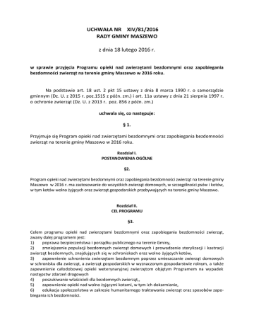 UCHWAŁA NR XIV/81/2016 RADY GMINY MASZEWO z dnia 18 lutego 2016 r. w sprawie przyjęcia Programu opieki nad zwierzętami bezdomnymi oraz zapobiegania bezdomności zwierząt na terenie gminy Maszewo w 2016 roku. Na podstawie art. 18 ust. 2 pkt 15 ustawy z dnia 8 marca 1990 r. o samorządzie gminnym (Dz. U. z 2015 r. poz.1515 z późn. zm.) i art. 11a ustawy z dnia 21 sierpnia 1997 r. o ochronie zwierząt (Dz. U. z 2013 r. poz. 856 z późn. zm.) uchwala się, co następuje: § 1. Przyjmuje się Program opieki nad zwierzętami bezdomnymi oraz zapobiegania bezdomności zwierząt na terenie gminy Maszewo w 2016 roku. Rozdział I. POSTANOWIENIA OGÓLNE §2. Program opieki nad zwierzętami bezdomnymi oraz zapobiegania bezdomności zwierząt na terenie gminy Maszewo w 2016 r. ma zastosowanie do wszystkich zwierząt domowych, w szczególności psów i kotów, w tym kotów wolno żyjących oraz zwierząt gospodarskich przebywających na terenie gminy Maszewo. Rozdział II. CEL PROGRAMU §3. Celem programu opieki nad zwierzętami bezdomnymi oraz zapobiegania bezdomności zwierząt, zwany dalej programem jest: 1) poprawa bezpieczeństwa i porządku publicznego na terenie Gminy, 2) zmniejszenie populacji bezdomnych zwierząt domowych i prowadzenie sterylizacji i kastracji zwierząt bezdomnych, znajdujących się w schroniskach oraz wolno żyjących kotów, 3) zapewnienie schronienia zwierzętom bezdomnym poprzez umieszczanie zwierząt domowych w schronisku dla zwierząt, a zwierząt gospodarskich w wyznaczonym gospodarstwie rolnym, a także zapewnienie całodobowej opieki weterynaryjnej zwierzętom objętym Programem na wypadek następstw zdarzeń drogowych 4) poszukiwanie właścicieli dla bezdomnych zwierząt,, 5) zapewnienie opieki nad wolno żyjącymi kotami, w tym ich dokarmianie, 6) edukacja społeczeństwa w zakresie humanitarnego traktowania zwierząt oraz sposobów zapobiegania ich bezdomności. Rozdział III. REALIZATORZY PROGRAMU §4. 1. Funkcję koordynatora Programu pełni Wójt za pośrednictwem Urzędu Gminy. 2. Realizacja działań dotyczących przeciwdziałaniu bezdomności zwierząt może być prowadzona przez: 1) schroniska dla bezdomnych zwierząt, z którymi Gmina zawrze stosowne umowy, 2) służby porządkowe: Komenda Powiatowa Policji w Krośnie Odrzańskim, 3) zakłady lecznicze dla zwierząt, z którymi Gmina zawrze stosowne umowy, 4) organizacje pozarządowe, których celem statutowym jest ochrona zwierząt, 5) przedszkole, szkoły, świetlice wiejskie poprzez edukację dzieci i młodzieży w zakresie humanitarnego traktowania zwierząt i sposobów zapobiegania ich bezdomności. § 5. Realizacja Programu odbywa się zgodnie z przepisami ustawy z dnia 21 sierpnia 1997 r. o ochronie zwierząt, w szczególności z zachowaniem zasad humanitaryzmu. Rozdział IV. SPOSOBY REALIZACJI CELÓW PROGRAMU §6. 1. Poprawa bezpieczeństwa i porządku publicznego na terenie gminy realizowana będzie przez: 1) egzekwowanie przepisów prawa lokalnego w zakresie obowiązków właścicieli zwierząt, określonych przepisami o utrzymaniu czystości i porządku w gminach, 2) egzekwowanie, we współpracy z inspekcją weterynaryjną, obowiązku wykonywania corocznego szczepienia psów przeciw wściekliźnie, 3) prowadzenie działań edukacyjnych w zakresie opieki nad zwierzętami i humanitarnego ich traktowania. 2. Zmniejszenie populacji bezdomnych zwierząt na terenie gminy odbywać się będzie poprzez: 1) 2) sterylizację i kastrację zwierząt domowych, w szczególności psów, które realizowane jest przez Gminę i schronisko firma „VET-ZOO SERWIS” z siedzibą ul. M. Konopnickiej 62, 64-980 Trzcianka poprzez obligatoryjne przeprowadzanie zabiegów sterylizacji i kastracji zwierząt przyjętych do schroniska, usypianie ślepych miotów zwierząt, które realizowane jest przez: a) schronisko firma „VET-ZOO SERWIS” z siedzibą ul. M. Konopnickiej 62, 64-980 Trzcianka poprzez dokonywanie przez lekarza weterynarii zabiegów usypiania ślepych miotów; b) Gminę poprzez zlecanie lekarzom weterynarii Gabinet Weterynaryjny Krzysztof Cieślak z siedzibą przy ul. Dąbrowskiego 5, 69 -108 Cybinka usypiania ślepych miotów bezdomnych kotów wolno żyjących. 3. Zapewnienie schronienia zwierzętom bezdomnym oraz opieki dla zwierząt z terenu Gminy Maszewo realizuje się poprzez: 1) przyjmowanie przez Urząd zgłoszeń o błąkających się zwierzętach, 2) odławianie z terenu gminy zwierząt bezdomnych, zagubionych, wałęsających się, pozo- stających bez opieki właściciela będzie realizowany w następujący sposób:, -Urząd przyjmując zgłoszenie o wałęsającym się zwierzęciu, telefonicznie zawiadomi wyspecjalizowaną firmę „VET-ZOO SERWIS” z siedzibą ul. M. Konopnickiej 62, 64-980 Trzcianka z zaleceniem odłowienia go i przewiezienia transportem specjalistycznym do schroniska, 3) umożliwienie przekazania pod tymczasową opiekę organizacji opieki nad zwierzętami – zwierząt, które w wyniku wypadków losowych (zgon właściciela, przebywanie w szpitalu itp.) utraciły właściciela, 4) poszukiwanie wspólnie z organizacjami opieki nad zwierzętami, wolontariuszami i innymi osobami nowych właścicieli dla zwierząt bezdomnych, 5) podpisanie przez Urząd umowy ze schroniskiem VET-ZOO SERWIS” z siedzibą ul. M. Konopnickiej 62, 64-980 Trzcianka na zapewnienie bezdomnym zwierzętom miejsca w schronisku oraz opieki. Wybór schroniska będzie prowadzony zgodnie z ustawą o zamówieniach publicznych, 6) zwierzęta gospodarskie, które uciekły, zabłąkały się lub zostały porzucone przez człowieka a nie ma możliwości, ustalenia ich właściciela lub innej osoby, pod której opieką trwale dotąd pozostawały będą przekazywane do gospodarstwa rolnego Wojciech Kołoszyc Chlebów nr 4, 7) zapewnienie opieki weterynaryjnej w przypadkach zdarzeń drogowych z udziałem bezdomnych zwierząt poprzez dokonanie przez Urząd zlecenia Gabinet Weterynaryjny Krzysztof Cieślak z 