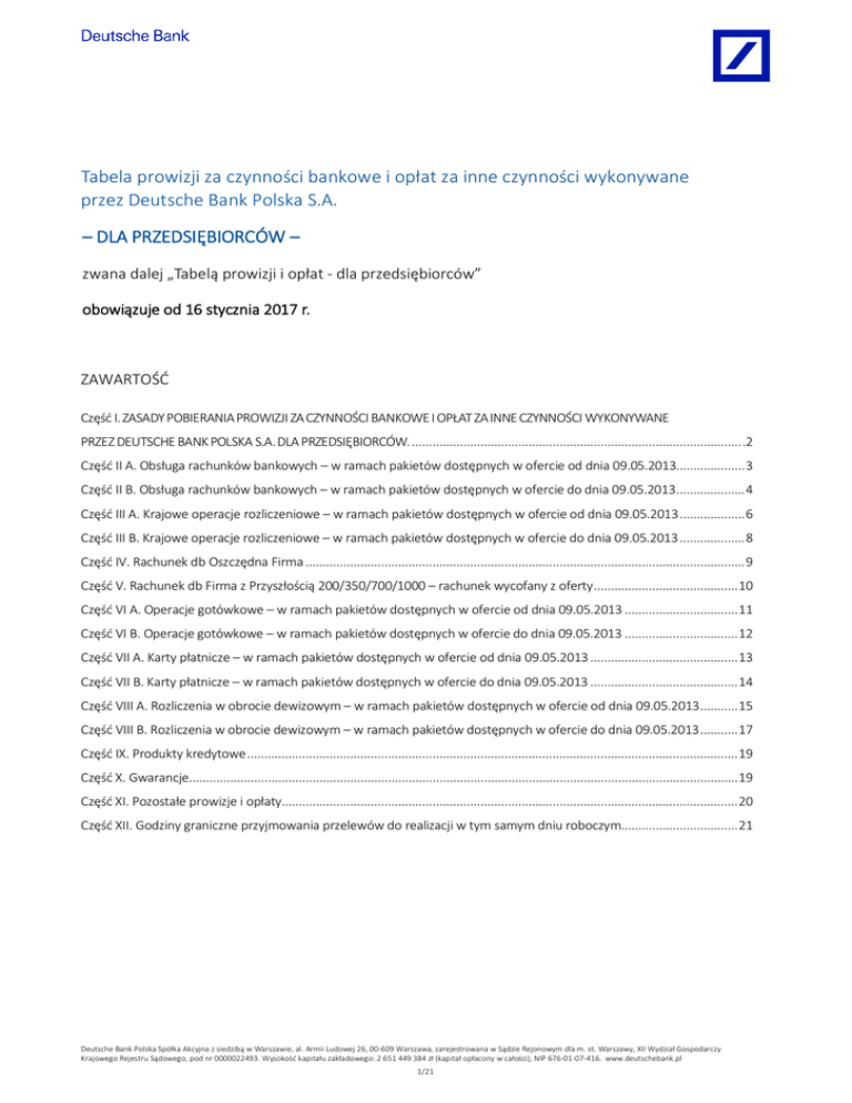 Tabela prowizji za czynno ci bankowe i op at za inne czynno ci wykonywane przez Deutsche Bank Polska S.A. – DLA PRZEDSI BIORCÓW – zwana dalej „Tabel prowizji i op at - dla przedsi biorców” obowi zuje od 16 stycznia 2017 r. ZAWARTO Cz I. ZASADY POBIERANIA PROWIZJI ZA CZYNNO CI BANKOWE I OP AT ZA INNE CZYNNO CI WYKONYWANE PRZEZ DEUTSCHE BANK POLSKA S.A. DLA PRZEDSI BIORCÓW. ................................................................................................ .2 Cz II A. Obs uga rachunków bankowych – w ramach pakietów dost pnych w ofercie od dnia 09.05.2013.................... 3 Cz II B. Obs uga rachunków bankowych – w ramach pakietów dost pnych w ofercie do dnia 09.05.2013.................... 4 Cz III A. Krajowe operacje rozliczeniowe – w ramach pakietów dost pnych w ofercie od dnia 09.05.2013 ................... 6 Cz III B. Krajowe operacje rozliczeniowe – w ramach pakietów dost pnych w ofercie do dnia 09.05.2013 ................... 8 Cz IV. Rachunek db Oszcz dna Firma ................................................................................................................................ 9 Cz V. Rachunek db Firma z Przysz Cz VI A. Operacje gotówkowe – w ramach pakietów dost pnych w ofercie od dnia 09.05.2013 ................................. 11 Cz VI B. Operacje gotówkowe – w ramach pakietów dost pnych w ofercie do dnia 09.05.2013 ................................. 12 Cz VII A. Karty p atnicze – w ramach pakietów dost pnych w ofercie od dnia 09.05.2013 ........................................... 13 Cz VII B. Karty p atnicze – w ramach pakietów dost pnych w ofercie do dnia 09.05.2013 ........................................... 14 Cz VIII A. Rozliczenia w obrocie dewizowym – w ramach pakietów dost pnych w ofercie od dnia 09.05.2013 ........... 15 Cz VIII B. Rozliczenia w obrocie dewizowym – w ramach pakietów dost pnych w ofercie do dnia 09.05.2013 ........... 17 Cz IX. Produkty kredytowe ............................................................................................................................................... 19 Cz X. Gwarancje................................................................................................................................................................ 19 Cz XI. Pozosta e prowizje i op aty..................................................................................................................................... 20 Cz XII. Godziny graniczne przyjmowania przelewów do realizacji w tym samym dniu roboczym.................................. 21 ci 200/350/700/1000 – rachunek wycofany z oferty .......................................... 10 Deutsche Bank Polska Spó ka Akcyjna z siedzib w Warszawie, al. Armii Ludowej 26, 00-609 Warszawa, zarejestrowana w S dzie Rejonowym dla m. st. Warszawy, XII Wydzia Gospodarczy Krajowego Rejestru S dowego, pod nr 0000022493. Wysoko kapita u zak adowego: 2 651 449 384 z (kapita op acony w ca ci), NIP 676-01-07-416. www.deutschebank.pl 1/21 Definicje i skróty u yte w “Tabeli prowizji i op at” oznaczaj : Bank lub DB Polska S.A. – Deutsche Bank Polska Spó ka Akcyjna Cz I. ZASADY POBIERANIA PROWIZJI ZA CZYNNO CI BANKOWE I OP AT ZA INNE CZYNNO CI WYKONYWANE PRZEZ DEUTSCHE BANK POLSKA S.A. DLA PRZEDSI BIORCÓW. 1. Zasady pobierania prowizji za czynno ci bankowe i op at za inne czynno ci: 1) Za us ugi zlecone przez rezydentów i nierezydentów – przedsi biorców – pobiera si : a) prowizje i op aty wg stawek wynikaj cych z „Tabeli prowizji za czynno ci bankowe i op at za inne czynno ci wykonywane przez Deutsche Bank Polska S.A. dla przedsi biorców”, prowizje i op aty podane przez banki po rednicz ce przy wykonaniu zlecenia. 2) Nale prowizj Bank pobiera od zleceniodawcy operacji bankowej, chyba, e strony umówi y si inaczej. 3) Prowizje i op aty Bank pobiera przy wykonywaniu zleconej czynno ci, za wyj tkiem op at oznaczonych jako miesi czne. 4) Prowizje i op aty oznaczone „miesi cznie” Bank pobiera: a) dla pakietów db S, db M, db L oraz db XL: ostatniego dnia roboczego miesi ca, za wyj tkiem op aty za prowadzenie rachunku g ównego w PLN oraz za dodatkowe paczki operacji do rachunków, za które op ata pobierana jest do 15 dnia nast pnego miesi ca, b) dla pozosta ych pakietów: ostatniego dnia roboczego miesi ca, c) dla wszystkich kart: op ata za obs ug karty pobierana jest 15 dnia miesi ca, d) za us ug db-collect, op aty pobierane s do pi tego dnia miesi ca. 5) Op ata za wyci gi pobierana jest miesi cznie, jako suma op at za ka dy wyci g wygenerowany w ci gu miesi ca. 6) Prowizje i op aty Bank ustala i pobiera w z otych. a) W przypadku regulowania op at i prowizji bezpo rednio z konta walutowego Klienta op at pobiera si stosuj c kurs kupna dewiz zgodnie z „Tabel kursów kupna i sprzeda y waluty polskiej w stosunku do walut obcych” – wprowadzon odr bnym Zarz dzeniem Prezesa Zarz du Banku. b) W przypadku regulowania op at i prowizji poprzez wp at gotówkow w walucie obcej dokonuje si skupu waluty po kursie kupna dla pieni dzy. c) Stawki okre lone w cz ci IX. „Produkty kredytowe” (czynno ci zwi zane z udzielaniem kredytów, po yczek, por cze i gwarancji) okre lone procentowo pobierane s w walucie kredytu, po yczki, itd. lub w otych po przeliczeniu po kursie kupna/sprzeda y dla dewiz. 7) Bank nie prowadzi skupu i sprzeda y, przyjmowania wp at na rachunki i dokonywania wyp at waluty obcej w bilonie oraz zamiany walut wymienialnych w bilonie na banknoty i odwrotnie. 8) Bank prowadzi obs ug gotówkow dla walut CHF i GBP wy cznie w wybranych oddzia ach. Informacja dost pna jest w dowolnej placówce Banku. 9) Na yczenie Klienta Bank mo e wykona czynno nie wymienion w niniejszej Tabeli, jednak zastrzega sobie prawo do pobrania op aty lub prowizji ustalonej indywidualnie. 10) atno ci na kwoty od 1 mln PLN s realizowane przez system Sorbnet, z wyj tkiem p atno ci kierowanych do ZUS i US, które rozliczane s przez system ELIXIR.