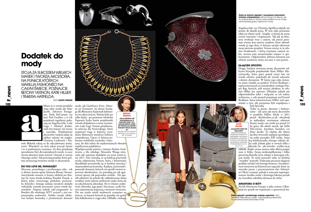 Kolia ze złotych agrafek i wysadzany klejnotami kołnierz ortopedyczny dziś już nikogo nie dziwią, ale to właśnie Betony Vernon wprowadziła na nie modę wśród szerszej grupy odbiorców mody Angeliną Jolie czy Christiną Aguillerą zdążyły już przejść do klasyki prasy. W tym roku powstanie także jej własny tytuł - książka, w której da wyraz swoim emocjom i inspiracjom. Tak jak jej biżuteria ewoluuje wraz z czasem, tak ponoć pozostaje wierna tym samym zasadom, które ukształtowały ją tego dnia, w którym zaczęła szkicować swoje pierwsze projekty. Vernon wierzy, że to właśnie świadomość, z którą wyrażamy samych siebie, stwarza nam nienariuszalne miejsce w społeczeństwie. Odpowiednio dobrana biżuteria jest właśnie amuletem, który ma nam w tym pomóc. 102 zajączek spicetki Stoją za sukcesem wielkich marek i tworzą akcesoria, na punkcie których wariują fashioniści na całym świecie. poznajcie betony vernon, katie hillier i tinkera hatfielda. a tekst cathy nhung Mimo że w swoim portfolio mają takie marki jak Marc Jacobs, Salvatore Ferragamo, Stella McCartney czy Jean Paul Gaultier, a w ich projektach regularnie pokazują się Angelina Jolie, Lady Gaga i Michael Jordan, mało kto kojarzy ich twarze i nazwiska. Projektantom akcesoriów rzadziej udaje się zdobyć należny im rozgłos. Christian Louboutin i Manolo Blahnik należą tu do zdecydowanej mniejszości. Więszkość na swój sukces pracuje latami i to w podwójnym wymiarze. Za dnia projektują sprzedażowe hity dla największych marek, w nocy tworzą skromny świat marzeń i fantazji w zaciszu własnego atelier. Tak powstają projekty, które później wyznaczają światowe trendy w akcesoriach. Do you love me, paparazzi? Mroczna, prowokująca i przełamująca tabu - tak w skrócie można opisać biżuterię Betony Vernon. Amerykanka uznanie w branży zdobyła już dziesięć lat temu śmiałą kolekcją Paradise Found, w której pełne erotycznego podtekstu pierścionki, kolczyki i różnego rodzaju metalowe dodatki wzbudzały niemałe poruszenie nawet wśród eksentryków. Dopiero jednak cykl programów Le Boudoir dla włoskiego MTV uczynił z niej rozpoznawalną osobowość. Szybko zaczęła zdobywać kolejne kontrakty z presitżowymi domami mody, jak Gianfranco Ferre, Missoni czy Fornasetti. Jej słynne bondage dla Blumarine kopiowali fashionibetony ści na całym świecie. Później było juz vernon tylko lepiej - po premierze teledysku „moja biżuteria jest odpowiedzią na te Paparazzi liczba fanów projektantki wszystkie tanie i plawzrosła dodatkowo o rzeszę wyznawstikowe śmiecie, które nie pozwalają ludziom ców Lady Gagi. Vernon projektowawydobyć swoje własne ła wówczas dla Swarovskiego, który ja” Biżuteria jest dla vernon zaopatrzył Gagę w kultowy, wysaamuletem, a jej zakładadzany klejnotami metalowy kołnierz nie - rytuałem ortopedyczny. Ujęcie, w którym połamana wokalistka wychodzi z limuzyny, do dziś należy do najsłynniejszych obrazów współczesnej popkultury. Współpracowała później z Jeanem Paulem Gaultierem, a dla młodego Alexandra Wanga stworzyła cały repertuar dodatków na sezon jesień-zima 2011. Fani twierdzą, że tą kolekcją przywitali trochę odmienioną Vernon, która z biżuteryjnej skandalistki przemieniła się w bardziej mroczną i nieprzeniknioną kreatorkę. Kajdany, pierścionki i pozostałe elementy, których nie sposób nazwać typowymi określeniami, nie posiadają już tak agresywnej oprawy jak poprzednie modele. Nie sposób odmówić im jednak siły oddziaływania, którą wydobyć może jedynie osobowość osoby, która się na taką biżuterię zdecyduje. Bo to własnie osobowość człowieka, jego pasje i fascynacje, są dla Vernon najważnieszą inspiracją i motorem tworzenia. Nie ma tytułu wśród modowych czasopism na świecie, na łamach których jej projekty nie gościłyby kilkakrotnie w ciągu roku. Okładki z siedzącą Drugą, bardziej niewinną stronę akcesoriów odkrywa brytyjska projektantka Katie Hillier. Ekscentryczka, która przez ponad cztery lata nie ścinała włosów, podchodzi do swoich sukcesów z dużym dystansem. W lutym tego roku światowa prasa oszalała na punkcie Victorii Beckham i zaprezentowanych na nowojorskim wybiegu Harper Bag, których, jeśli wierzyć plotkom, to właśnie Hillier jest autorem. Oficjalnie jednak jest odpowiedzialna tylko i wyłącznie za ich walory techniczne, a cały pomysł przypisany jestVictorii Beckham. Sama zainteresowana Hillier woli opowiadać o tym, jak przyjemna była wspołpraca z byłą Spicetką. Torby są proste, skromne i funkcjonalne - tak samo jak reszta akcesoriów w portfolio Hillier. Kiedy w 2011 portal thisislondon.co.uk okrzyknął ją najbardziej strzeżonym sekretem branży mody, ona miała już ponad 14 katie lat pracy dla takich marek, jak Stella hillier „zajączków nigdy nie McCartney, Jonathan Saunders czy masz dość” Marc Jacobs. To właśnie dla Marca niegdyś skromna absolwetnka university of Jacobsa stworzyła najlepiej sprzedające westminster, dziś jedna z się torby początku XXI wieku. Sama najbardziej charakterystycznych projektantek jest zapaloną kolekcjonerką różnego rodzaju akakcesoriów. gościnnie cesoriów. prowadzi blog na vo- Jej szafa jednak pęka w szwach tylko z gue.co.uk powodu sukienek, bo - jak twierdzi - szybko się je zakłada, dzięki czemu można sobie dłużej pospać rano w łóżku. Swoją nieskomplikowaną i lekko przezorną filozofię życia wdraża w koncepcję własnej marki. Tu może pozwolić sobie na bardziej "swojskie" pomysły. Tradycyjne poczucie elegancji poddaje remake'owi bystrego humoru. Sztandarowym motywem jej biżuterii jest zajączek, który na wszystko patrzy z przymrużeniem oka. Infantylne? Może i czasami, jednak w sztucznie napompowanym światku mody i zbytniego luksusu przyda się wszystkim odrobina dystansu do siebie. awantura o buty Na fali Mistrzostw Europy w pił