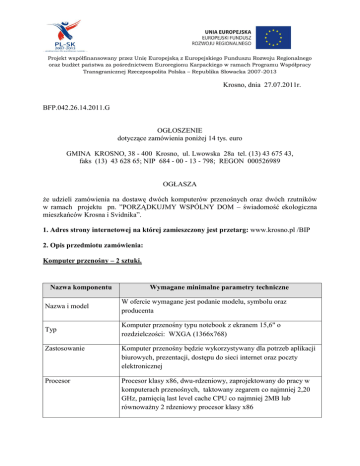 Projekt współfinansowany przez Unię Europejską z Europejskiego Funduszu Rozwoju Regionalnego oraz budżet państwa za pośrednictwem Euroregionu Karpackiego w ramach Programu Współpracy Transgranicznej Rzeczpospolita Polska – Republika Słowacka 2007-2013 Krosno, dnia 27.07.2011r. BFP.042.26.14.2011.G OGŁOSZENIE dotyczące zamówienia poniżej 14 tys. euro GMINA KROSNO, 38 - 400 Krosno, ul. Lwowska 28a tel. (13) 43 675 43, faks (13) 43 628 65; NIP 684 - 00 - 13 - 798; REGON 000526989 OGŁASZA że udzieli zamówienia na dostawę dwóch komputerów przenośnych oraz dwóch rzutników w ramach projektu pn. ”PORZĄDKUJMY WSPÓLNY DOM – świadomość ekologiczna mieszkańców Krosna i Svidnika”. 1. Adres strony internetowej na której zamieszczony jest przetarg: www.krosno.pl /BIP 2. Opis przedmiotu zamówienia: Komputer przenośny – 2 sztuki. Nazwa komponentu Wymagane minimalne parametry techniczne Nazwa i model W ofercie wymagane jest podanie modelu, symbolu oraz producenta Typ Komputer przenośny typu notebook z ekranem 15,6" o rozdzielczości: WXGA (1366x768) Zastosowanie Komputer przenośny będzie wykorzystywany dla potrzeb aplikacji biurowych, prezentacji, dostępu do sieci internet oraz poczty elektronicznej Procesor Procesor klasy x86, dwu-rdzeniowy, zaprojektowany do pracy w komputerach przenośnych, taktowany zegarem co najmniej 2,20 GHz, pamięcią last level cache CPU co najmniej 2MB lub równoważny 2 rdzeniowy procesor klasy x86 Projekt współfinansowany przez Unię Europejską z Europejskiego Funduszu Rozwoju Regionalnego oraz budżet państwa za pośrednictwem Euroregionu Karpackiego w ramach Programu Współpracy Transgranicznej Rzeczpospolita Polska – Republika Słowacka 2007-2013 Pamięć operacyjna RAM min 2 GB z możliwością rozbudowy do 4GB Parametry pamieci masowej Min. 250 GB Serial ATA, 5400 obr/min Karta graficzna Zintegrowana z możliwością dynamicznego przydzielenia do min. 512MB, ze sprzętowym wsparciem dla DirectX 10.0, Shader 4.0 posiadająca min. 12EU (Graphics Execution Units) oraz Dual HD HW Decode Wyposażenie multimedialne Karta dźwiękowa zgodna z HD Audio, 24-bitowa konwersja sygnału cyfrowego na analogowy i analogowego na cyfrowy, głośniki stereo. Wymagania dotyczące baterii i zasilania Min. 6-cell, Li-Ion, czas pracy na bateriach min. 3,5 godziny Zasilacz Zasilacz min. 65W, Zgodność z systemami operacyjnymi i standardami Zgodność z 32-bitową wersją systemu operacyjnego Microsoft Windows 7 Home Premium PL, zainstalowany system operacyjny nie wymagający aktywacji za pomocą telefonu lub Internetu w firmie Microsoft + nośnik. Zainstalowany Microsoft Office Home&Business 2010 OEM PL Bezpieczeństwo Złącze typu Kensington Lock Certyfikaty i standardy Certyfikat ISO9001:2000 dla producenta sprzętu (należy załączyć do oferty) Certyfikat ISO 14001 dla producenta sprzętu (należy załączyć do oferty) Gwarancja 2 lata w następnym dniu roboczym (dotyczy sprzętu oraz fabrycznie zainstalowanego oprogramowania) Czas reakcji serwisu - do końca następnego dnia roboczego Firma serwisująca musi posiadać ISO 9001:2000 na świadczenie usług serwisowych oraz posiadać autoryzacje producenta Projekt współfinansowany przez Unię Europejską z Europejskiego Funduszu Rozwoju Regionalnego oraz budżet państwa za pośrednictwem Euroregionu Karpackiego w ramach Programu Współpracy Transgranicznej Rzeczpospolita Polska – Republika Słowacka 2007-2013 komputera – dokumenty potwierdzające załączyć do oferty. Serwis urządzeń musi być realizowany przez Producenta lub Autoryzowanego Partnera Serwisowego Producenta – wymagane dołączenie do oferty oświadczenia Wykonawcy potwierdzonego przez Producenta, że serwis będzie realizowany przez Producenta lub Autoryzowanego Partnera Serwisowego Producenta Wymagania dodatkowe Wbudowane porty i złącza: 4x USB 2.0, złącze słuchawek, złącze mikrofonu, FireWire IEEE 1394, RJ45, RJ-11, VGA, czytnik kart 5 w 1 (obsługiwane karty: SD, SDIO, MMC, Memory Stick, Memory Stick PRO), ExpressCard 34mm, kamera 2Mpix + mikrofon, Karta sieciowa LAN 10/100/1000 Ethernet RJ 45 zintegrowana z płytą główną oraz WLAN 802.11a/b/g/n, zintegrowany z płytą główną lub w postaci wewnętrznego modułu mini-PCI Express z dedykowanym przełącznikiem do uruchamiania modułu WLAN umieszczonym z przodu obudowy komputera. Klawiatura (układ US -QWERTY), min 87 klawiszy Touchpad 240 CPI Wbudowany moduł Bluetooth Napęd optyczny 8x DVD +/- RW wewnętrzny. Dołączone oprogramowanie do nagrywania i odtwarzania. Możliwość telefonicznego sprawdzenia konfiguracji sprzętowej komputera oraz warunków gwarancji po podaniu numeru seryjnego bezpośrednio u producenta lub jego przedstawiciela. Dołączony nośnik ze sterownikami. Dedykowane przyciski, umożliwiające: odtwarzanie/pauza, odtwarzanie poprzedniego utworu, odtwarzanie następnego utworu, stop, zwiększenie siły Projekt współfinansowany przez Unię Europejską z Europejskiego Funduszu Rozwoju Regionalnego oraz budżet państwa za pośrednictwem Euroregionu Karpackiego w ramach Programu Współpracy Transgranicznej Rzeczpospolita Polska – Republika Słowacka 2007-2013 dźwięku, zmniejszenie siły dźwięku. Projektor multimedialny- 2 sztuki. Parametr Wymagane minimalne parametry techniczne Nazwa i model W ofercie wymagane jest podanie modelu, symbolu oraz producenta Jasność 2700 lumenów (wg standardu ANSI) Kontrast Kontrast standardowy 2200:1 (całkowicie włączony/całkowicie wyłączony) Typ lampy Moc min. 200 W, możliwość wymiany przez użytkownika Rozdzielczość Rozdzielczość macierzysta XGA (1024x768) Równomierność: 90% (wg standardu JBMA) Rozmiar obrazu 22,9–303 cali (przekątna) Odległość wyświetlania 1 m ~ 12 m Zgodność sygnału wideo Kompozytowy sygnał wideo/S-Video: NTSC (M, 3,58, 4,43), PAL (B, D, G, H, I, M, N, 4,43), SECAM (B, D, G, K, K1, L, 4,25/4,4). Komponentowy sygnał wideo VGA: 1080i/