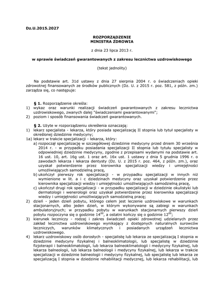 Dz.U.2015.2027 ROZPORZĄDZENIE MINISTRA ZDROWIA z dnia 23 lipca 2013 r. w sprawie świadczeń gwarantowanych z zakresu lecznictwa uzdrowiskowego (tekst jednolity) Na podstawie art. 31d ustawy z dnia 27 sierpnia 2004 r. o świadczeniach opieki zdrowotnej finansowanych ze środków publicznych (Dz. U. z 2015 r. poz. 581, z późn. zm.) zarządza się, co następuje: § 1. Rozporządzenie określa: 1) wykaz oraz warunki realizacji świadczeń gwarantowanych z zakresu uzdrowiskowego, zwanych dalej "świadczeniami gwarantowanymi"; 2) poziom i sposób finansowania świadczeń gwarantowanych. lecznictwa § 2. Użyte w rozporządzeniu określenia oznaczają: 1) lekarz specjalista - lekarza, który posiada specjalizację II stopnia lub tytuł specjalisty w określonej dziedzinie medycyny; 1a) lekarz w trakcie specjalizacji - lekarza, który: a) rozpoczął specjalizację w szczegółowej dziedzinie medycyny przed dniem 30 września 2014 r. - w przypadku posiadania specjalizacji II stopnia lub tytułu specjalisty w odpowiedniej dziedzinie medycyny, zgodnie z przepisami wydanymi na podstawie art. 16 ust. 10, art. 16g ust. 1 oraz art. 16x ust. 1 ustawy z dnia 5 grudnia 1996 r. o zawodach lekarza i lekarza dentysty (Dz. U. z 2015 r. poz. 464, z późn. zm.), oraz uzyskał potwierdzenie przez kierownika specjalizacji wiedzy i umiejętności umożliwiających samodzielną pracę, b) ukończył pierwszy rok specjalizacji - w przypadku specjalizacji w innych niż wymienione w lit. a i c dziedzinach medycyny oraz uzyskał potwierdzenie przez kierownika specjalizacji wiedzy i umiejętności umożliwiających samodzielną pracę, c) ukończył drugi rok specjalizacji - w przypadku specjalizacji w dziedzinie okulistyki lub dermatologii i wenerologii oraz uzyskał potwierdzenie przez kierownika specjalizacji wiedzy i umiejętności umożliwiających samodzielną pracę; 2) dzień - jeden dzień pobytu, którego celem jest leczenie uzdrowiskowe w warunkach stacjonarnych, albo jeden dzień, w którym wykonywane są zabiegi w warunkach ambulatoryjnych; w przypadku pobytu w warunkach stacjonarnych pierwszy dzień pobytu rozpoczyna się o godzinie 1400, a ostatni kończy się o godzinie 1200; 3) kierunek leczniczy - rodzaj i zakres świadczeń opieki zdrowotnej udzielanych przez zakład lecznictwa uzdrowiskowego wynikający z dostępnych naturalnych surowców leczniczych, warunków klimatycznych i posiadanych urządzeń lecznictwa uzdrowiskowego. 4) lekarz uzdrowiskowy osób dorosłych - specjalistę lub lekarza ze specjalizacją I stopnia w dziedzinie medycyny fizykalnej i balneoklimatologii, lub specjalistę w dziedzinie fizjoterapii i balneoklimatologii, lub lekarza balneoklimatologii i medycyny fizykalnej, lub lekarza balneologii, lub lekarza balneologii i medycyny fizykalnej, lub lekarza w trakcie specjalizacji w dziedzinie balneologii i medycyny fizykalnej, lub specjalistę lub lekarza ze specjalizacją I stopnia w dziedzinie rehabilitacji medycznej, lub lekarza rehabilitacji, lub lekarza rehabilitacji ogólnej, lub lekarza rehabilitacji w chorobach narządu ruchu, lub specjalistę lub lekarza ze specjalizacją I stopnia w dziedzinie chorób wewnętrznych, po kursie z podstaw balneologii, lub specjalistę w dziedzinie klinicznej tożsamej lub pokrewnej z kierunkiem leczniczym uzdrowiska, po kursie w zakresie podstaw balneologii; 5) lekarz uzdrowiskowy dzieci - specjalistę lub lekarza ze specjalizacją I stopnia w dziedzinie medycyny fizykalnej i balneoklimatologii, lub specjalistę w dziedzinie fizjoterapii i balneoklimatologii, lub lekarza balneoklimatologii i medycyny fizykalnej, lub lekarza balneologii, lub lekarza balneologii i medycyny fizykalnej, lub lekarza w trakcie specjalizacji w dziedzinie balneologii i medycyny fizykalnej, lub specjalistę lub lekarza ze specjalizacją I stopnia w dziedzinie rehabilitacji medycznej, lub lekarza rehabilitacji, lub lekarza rehabilitacji ogólnej, lub lekarza rehabilitacji w chorobach narządu ruchu, lub specjalistę lub lekarza ze specjalizacją I stopnia w dziedzinie pediatrii, po kursie w zakresie podstaw balneologii, lub specjalistę w dziedzinie klinicznej tożsamej lub pokrewnej z kierunkiem leczniczym uzdrowiska, po kursie w zakresie podstaw balneologii; 6) miejsce udzielania świadczeń - pomieszczenie lub zespół pomieszczeń w tej samej lokalizacji, powiązanych funkcjonalnie i organizacyjnie, w celu wykonywania świadczeń gwarantowanych; 7) stanowisko wzmożonego nadzoru kardiologicznego - stanowisko wzmożonego nadzoru kardiologicznego, o którym mowa w rozporządzeniu Ministra Zdrowia z dnia 2 kwietnia 2012 r. w sprawie określenia wymagań, jakim powinny odpowiadać zakłady i urządzenia lecznictwa uzdrowiskowego (Dz. U. poz. 452). § 3. 1. Świadczenia gwarantowane obejmują: uzdrowiskowe leczenie szpitalne dzieci w wieku od 3 do 18 lat; uzdrowiskowe leczenie sanatoryjne dzieci w wieku od 7 do 18 lat; uzdrowiskowe leczenie sanatoryjne dzieci w wieku od 3 do 6 lat pod opieką dorosłych; uzdrowiskowe leczenie szpitalne dorosłych; uzdrowiskowe leczenie sanatoryjne dorosłych; uzdrowiskową rehabilitację dla dorosłych w szpitalu uzdrowiskowym; uzdrowiskową rehabilitację dla dorosłych w sanatorium uzdrowiskowym; uzdrowiskowe leczenie ambulatoryjne dorosłych i dzieci. 2. Świadczenia gwarantowane są udzielane w strefie "A" ochrony uzdrowiskowej, o której mowa w art. 38 pkt 1 ustawy z dnia 28 lipca 2005 r. o lecznictwie uzdrowiskowym, uzdrowiskach i obszarach ochrony uzdrowiskowej oraz o gminach uzdrowiskowych (Dz. U. z 2012 r. poz. 651 i 742 oraz z 2015 r. poz. 1844), w warunkach: 1) ambulatoryjnych; 2) stacjonarnych. 3. Czas trwania leczenia uzdrowiskowego wynosi: 1) 27 dni - dla świadczenia gwarantowanego, o którym mowa w ust. 1 pkt 1; 2) 21 dni - dla świadczenia gwarantowanego, o którym mowa w ust. 1 pkt 2-5; 3) 28 dni - dla świadczenia gwarantowanego, o którym mowa w ust. 1 pkt 6 i 7; 4) od 6 do 18 dni - dla świadczenia gwarantowane